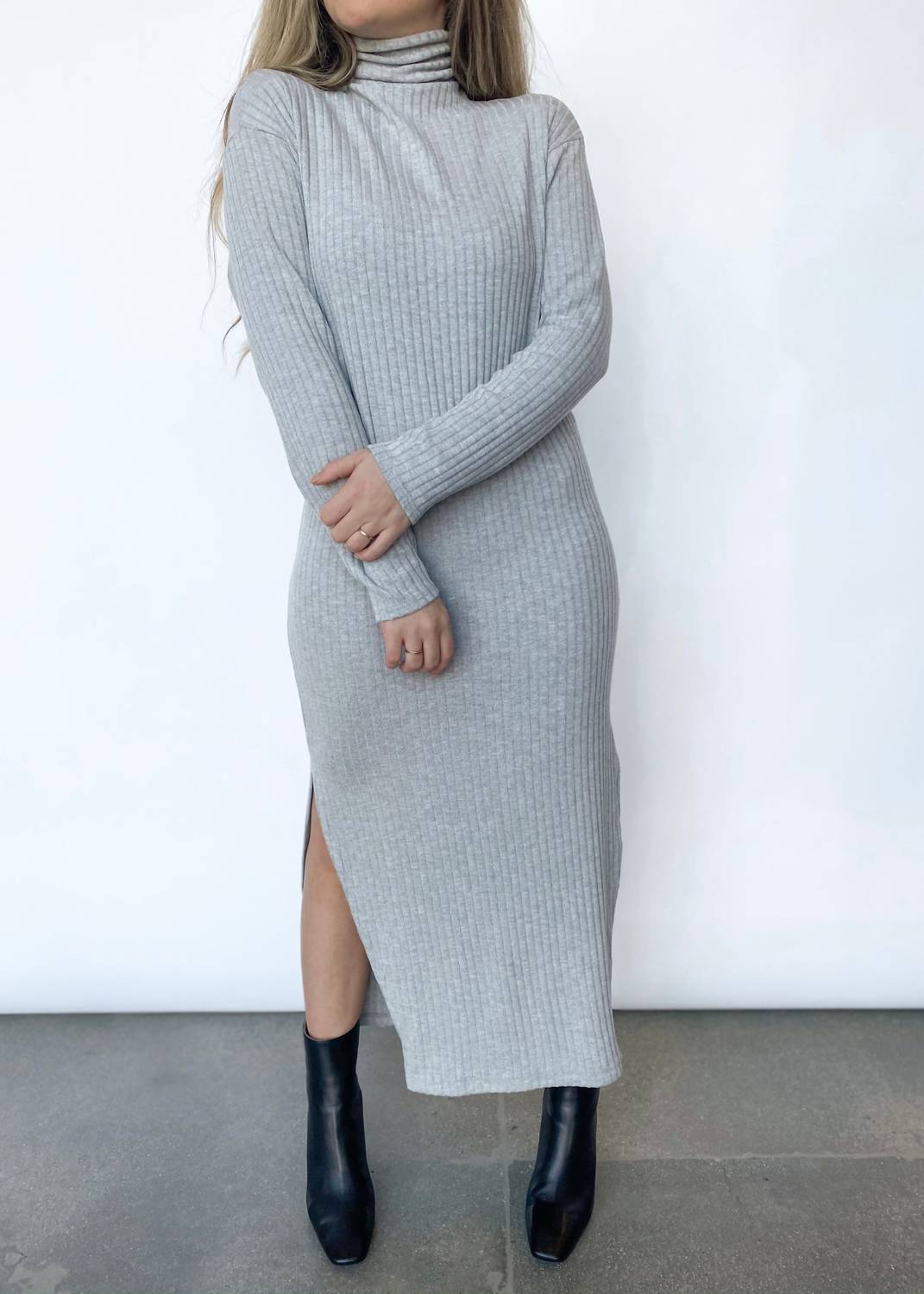 Comfortable and cute, this casual day dress has it all. Introducing the Sweater Rib Turtleneck Dress by Enza Costa, a chic addition for the fall season in heather grey. This long sleeve dress features a cozy textured pattern with a flattering shift silhouette and tasteful side slits at the hem. Made from a mid-weight jersey rib fabric composed of 48% viscose, 48% polyamide, and 4% spandex, it offers a stretch fit for effortless comfort. Designed and made in the USA, this pull-on style should be hand washed cold and laid flat to dry.