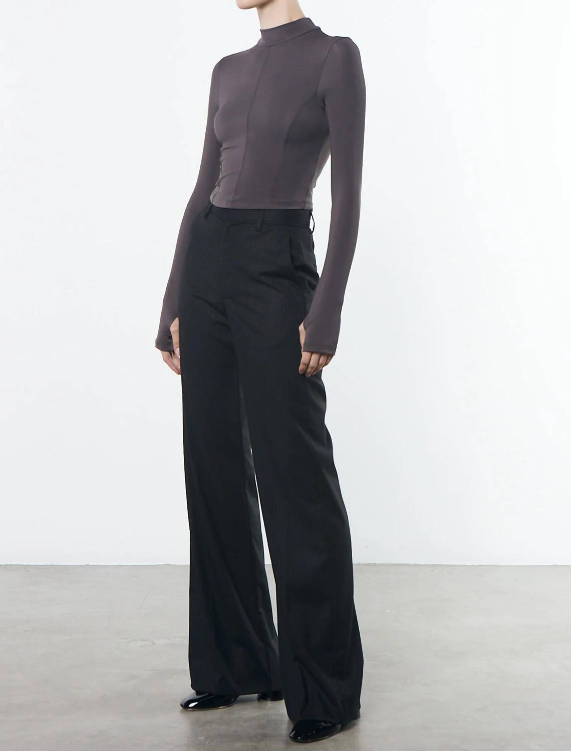 Fit to perfection and effortlessly chic. Discover the Matte Jersey Paneled Mock Neck Sweater by Enza Costa, a sophisticated choice in dark pewter. This long sleeve top boasts a body-hugging fit with paneled detailing along the bodice and practical thumbholes for added style. Made from a 96% viscose and 4% lycra blend, it offers comfort and flexibility. Proudly crafted in the USA, it features a pull-on closure perfect for a spring dinner party under a quiet luxury trend.