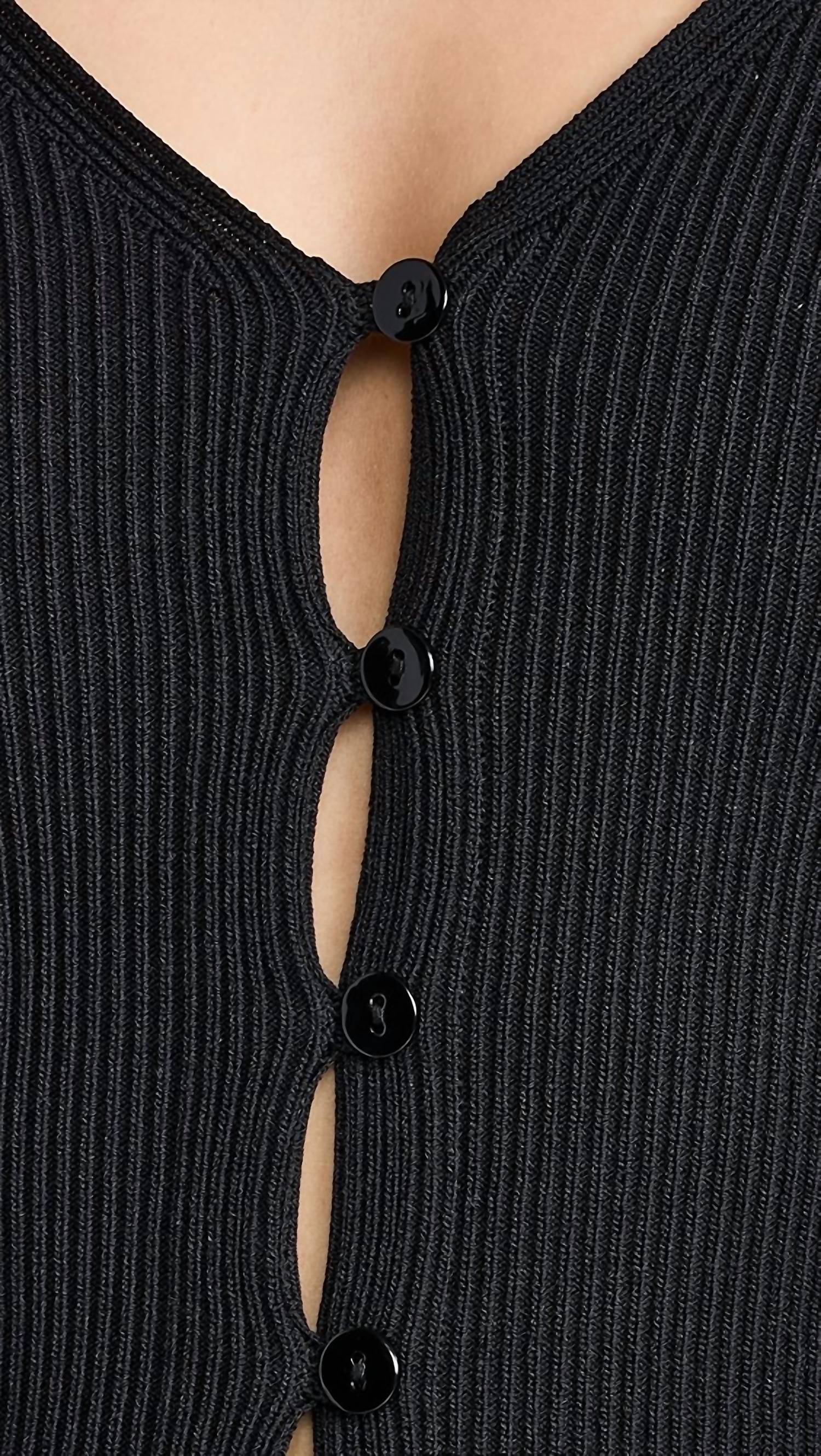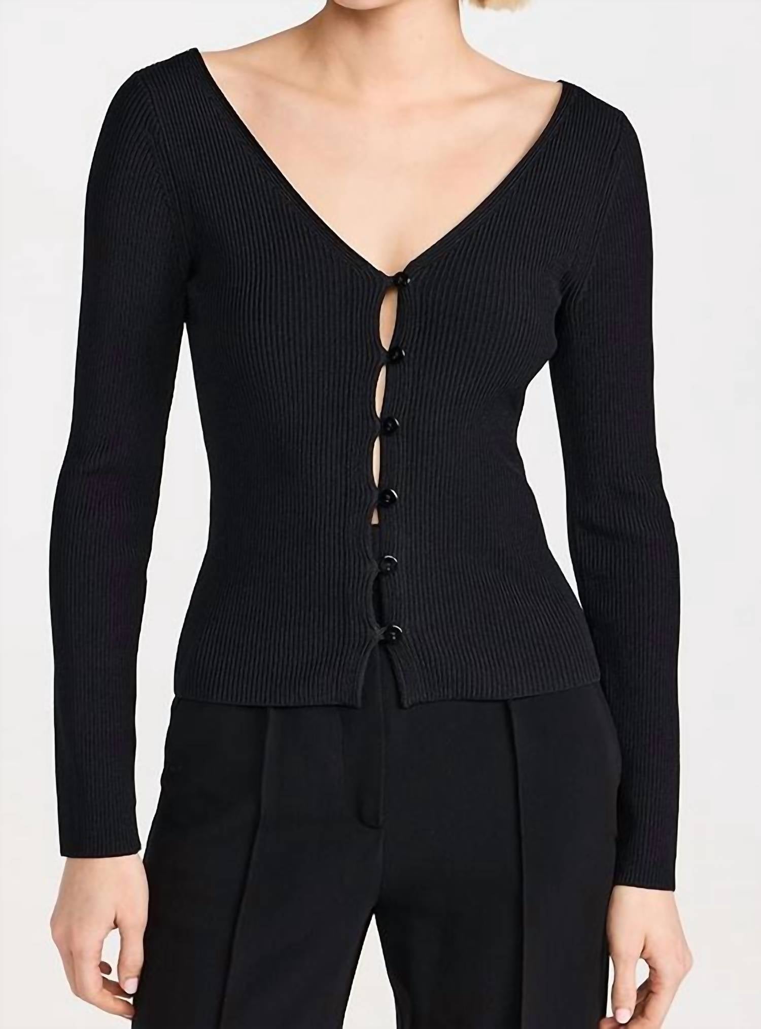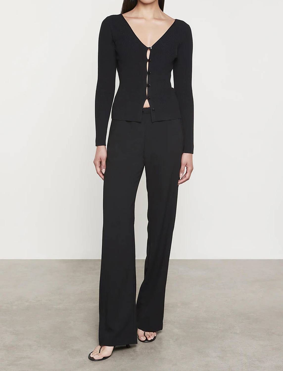 A classic fit that works just as good buttoned as it does left open. Introducing the Soft Structure Knitted Cardigan by Enza Costa, a chic black piece perfect for any holiday party. This women's cardigan features long sleeves and a flattering V-neckline, crafted from a compressive viscose blend for structure and ease. The solid pattern is elegantly accentuated by cut-out details and delicate button closures down the front. Care instructions recommend hand washing to maintain its minimalist aesthetic through every season.