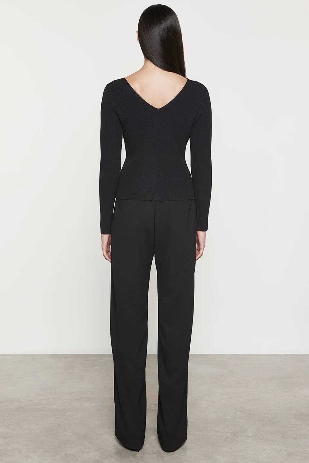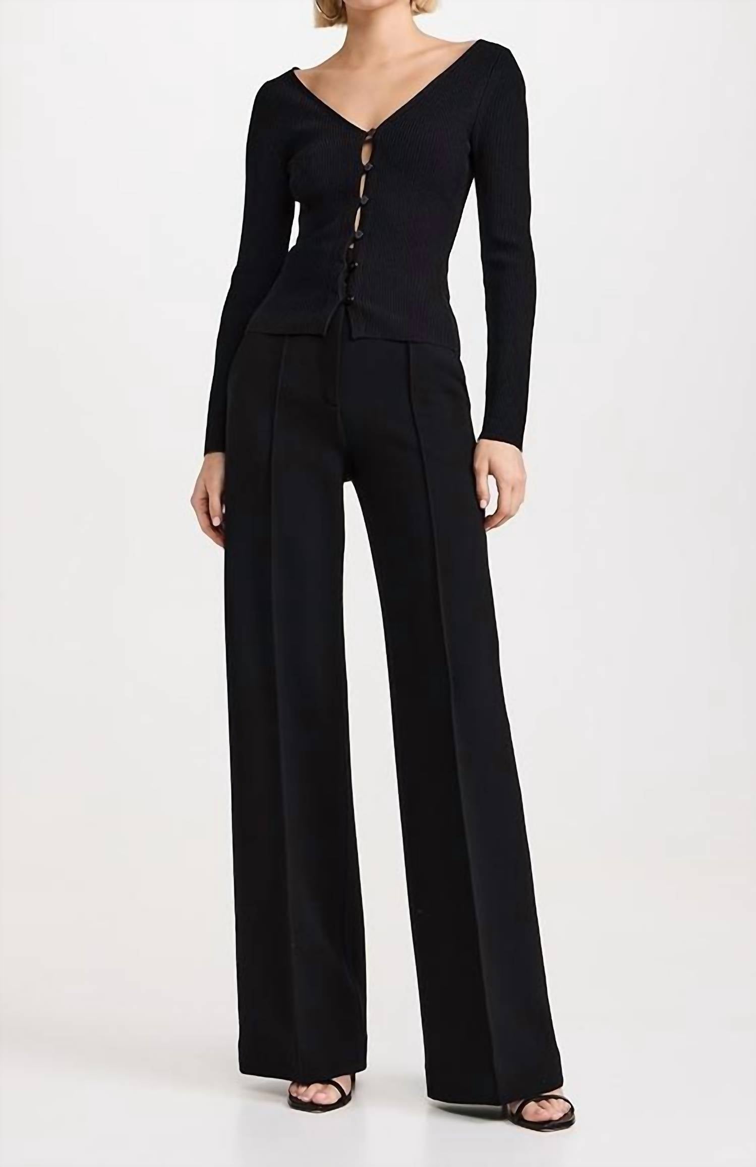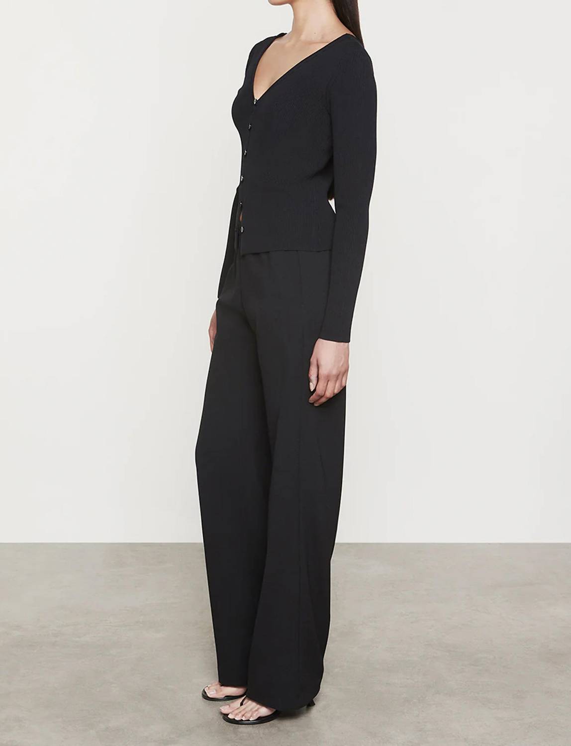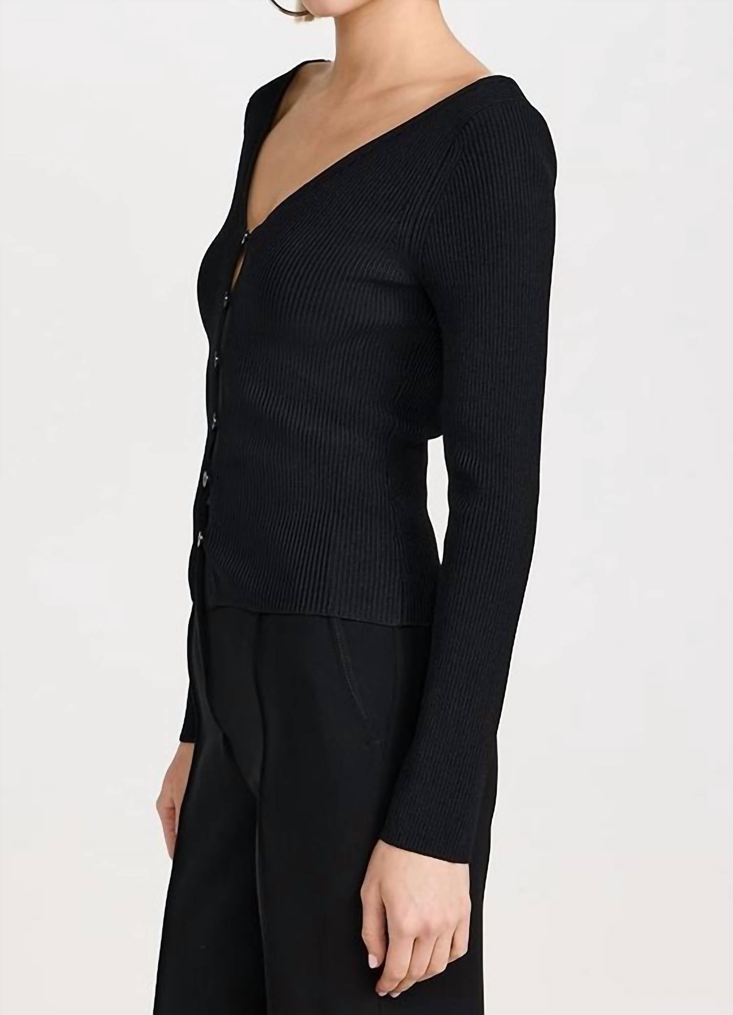 A classic fit that works just as good buttoned as it does left open. Introducing the Soft Structure Knitted Cardigan by Enza Costa, a chic black piece perfect for any holiday party. This women's cardigan features long sleeves and a flattering V-neckline, crafted from a compressive viscose blend for structure and ease. The solid pattern is elegantly accentuated by cut-out details and delicate button closures down the front. Care instructions recommend hand washing to maintain its minimalist aesthetic through every season.