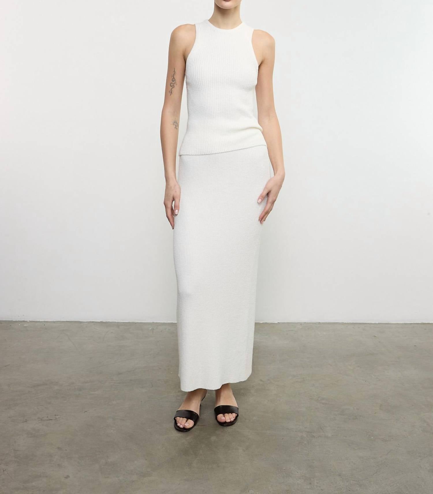 Who doesn't love a good maxi skirt? The ribbed Boucle Knit Skirt features an elasticized waistband and back slit detail for ease of movement.
