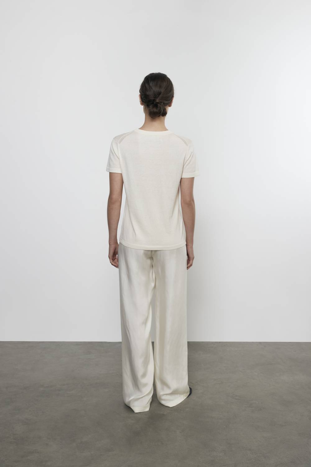 This classic, short sleeve tee will be your go-to staple this season and beyond. Our Silk Knit Perfect Tee is knit from a luxurious blend of silk and cotton. A softly draping classic crewneck with dropped shoulders.
