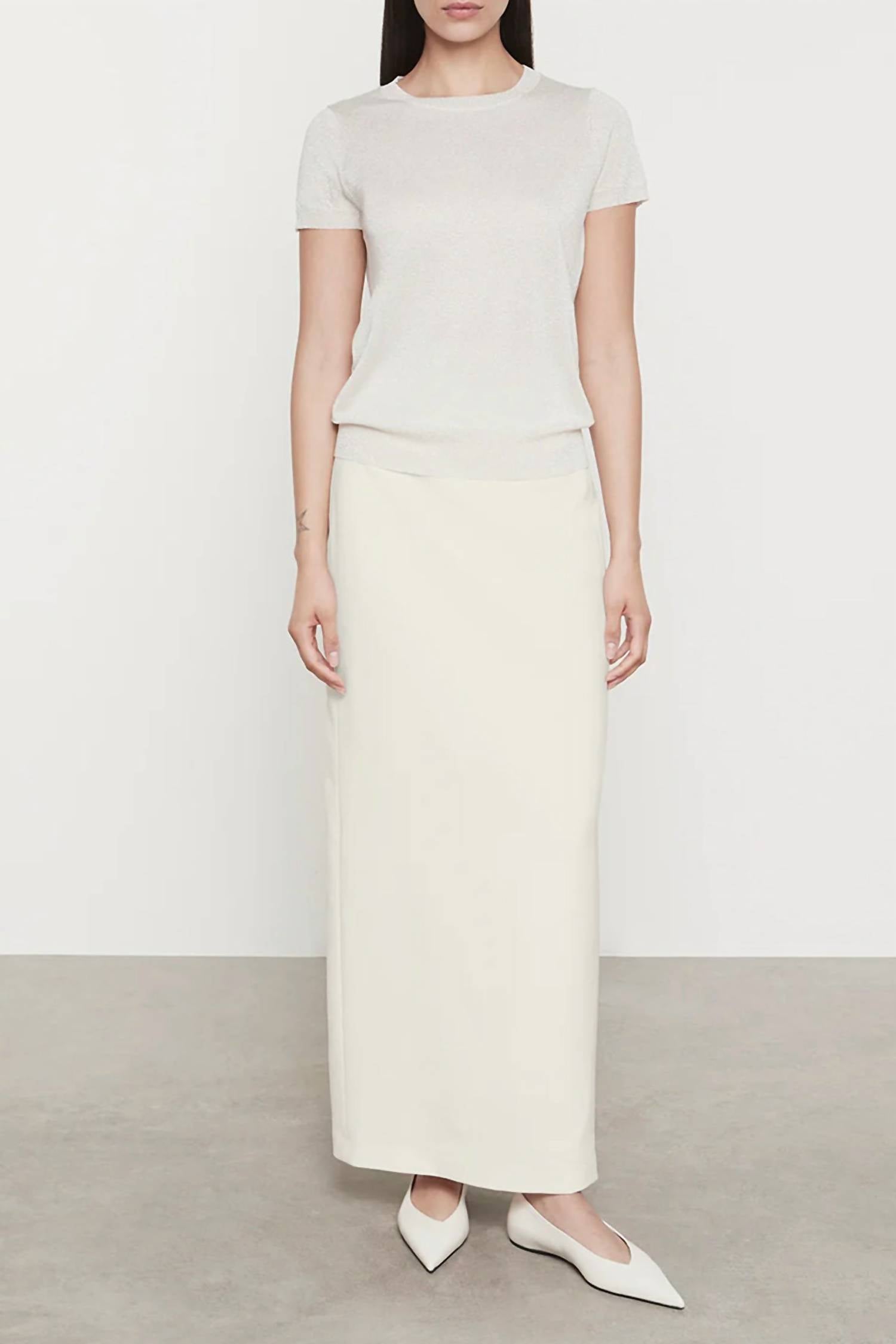 Introducing the Lamé Short Sleeve Sweater by Enza Costa, an elegant addition to your spring wardrobe in a sophisticated champagne hue. This top features short sleeves and a crewneck design, composed of a premium blend of 73% Viscose, 16% Nylon, and 12% Metallic. Crafted with attention to detail, it offers a pull-on closure and is imported from China. To maintain the garment's quality, please hand wash as part of its care routine.