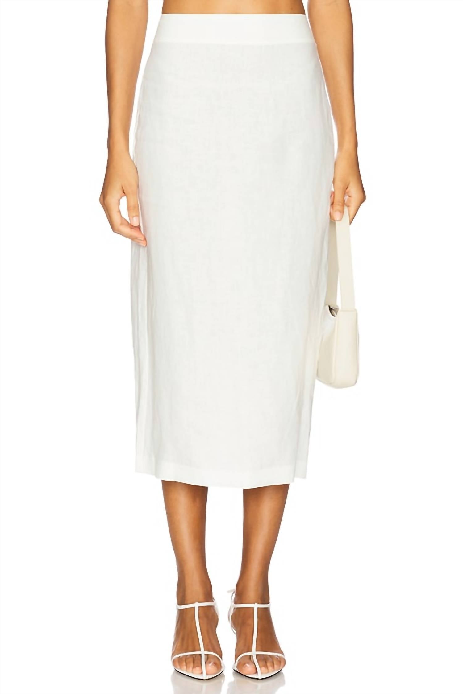 Dress this pencil skirt up with a blazer or down with your favorite tee. So versatile and timeless. Discover the elegance of this Linen Pencil Skirt by Enza Costa, crafted from 100% French linen for a minimalist summer look. Measuring approximately 81 cm in length, this piece features a medium-weight linen fabric with a back hem slit and a concealed back zipper. Made in the USA, it boasts a solid undyed color, perfect for versatile pairing. Care instructions recommend machine washing for hassle-free maintenance.