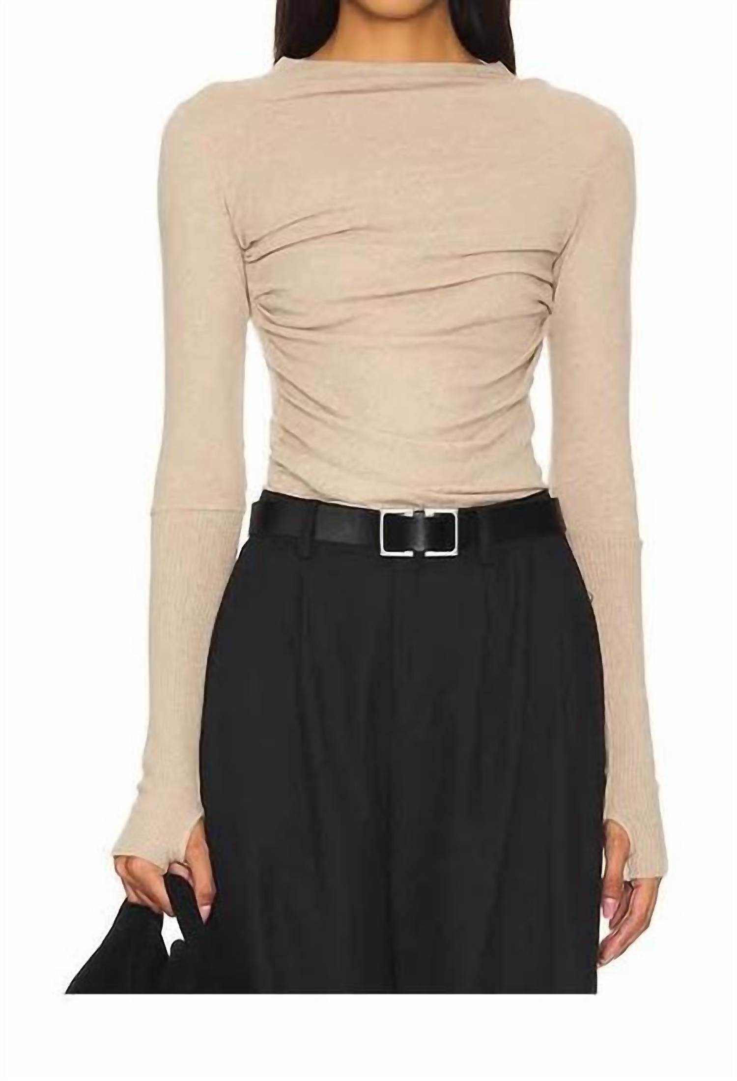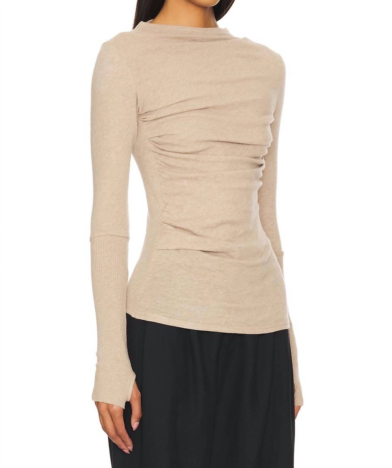 Great fit, cute design, soft fabric. You'll love everything about this long sleeve tee. Elevate your minimalist wardrobe with the Enza Costa Twist Long Sleeve Top, perfect for a cozy yet chic Thanksgiving dinner party. This elegant piece in khaki features long sleeves with a unique thumbhole design and a sophisticated mockneck. Crafted from 85% cotton and 15% cashmere in a lightweight ruched jersey fabric, it offers luxurious comfort. Made in the USA, it has a pull-on closure and is best cared for with a hand wash.