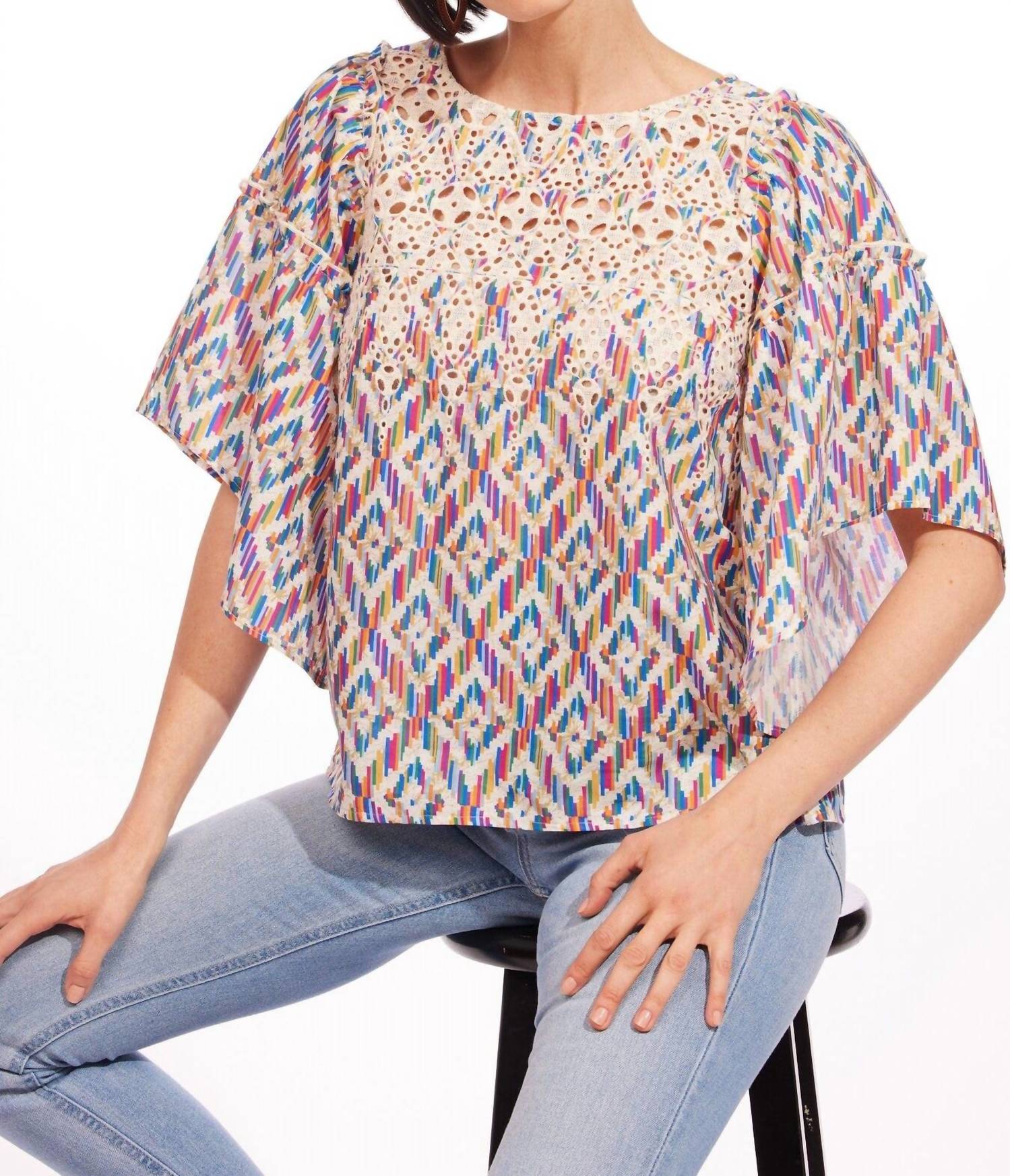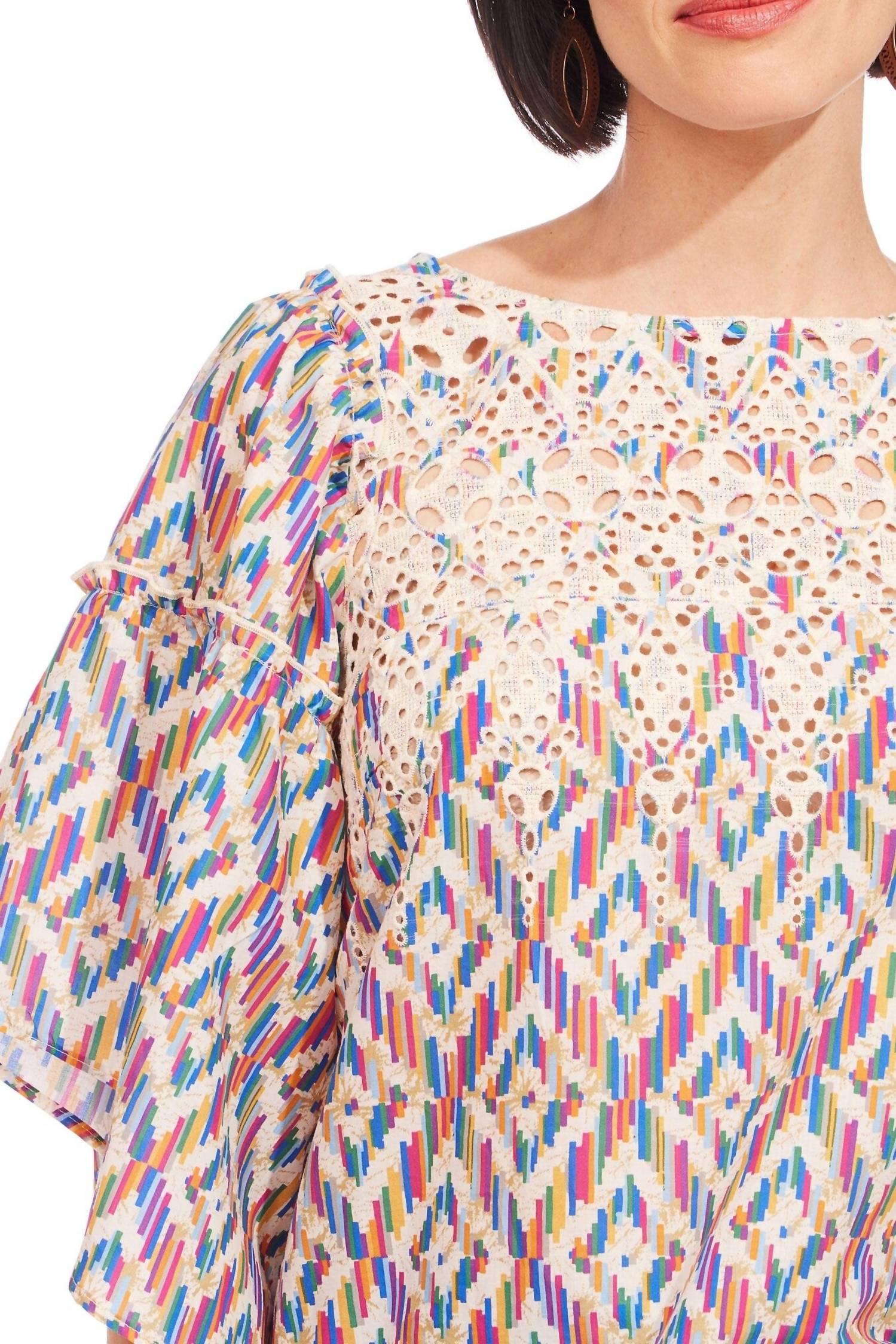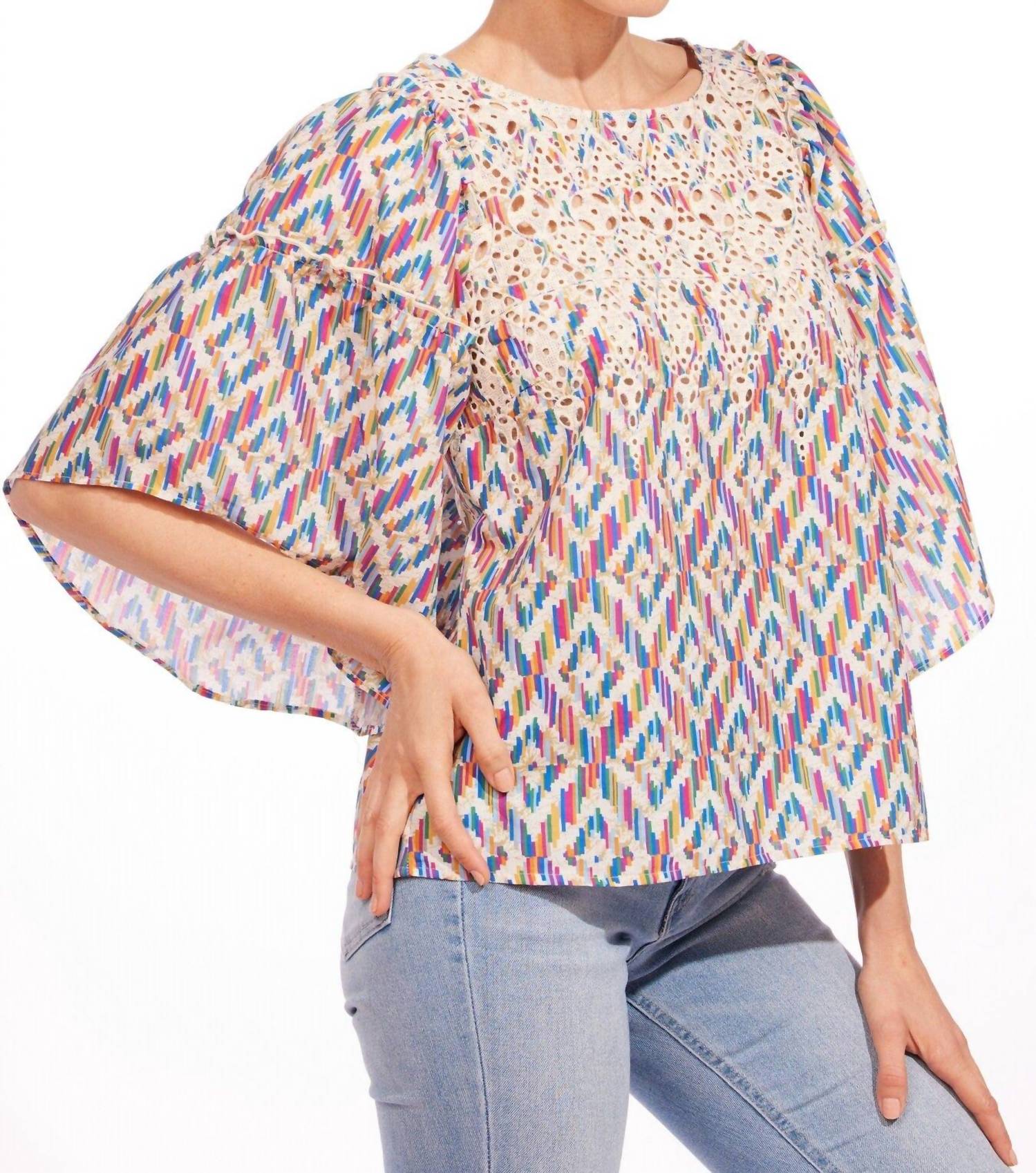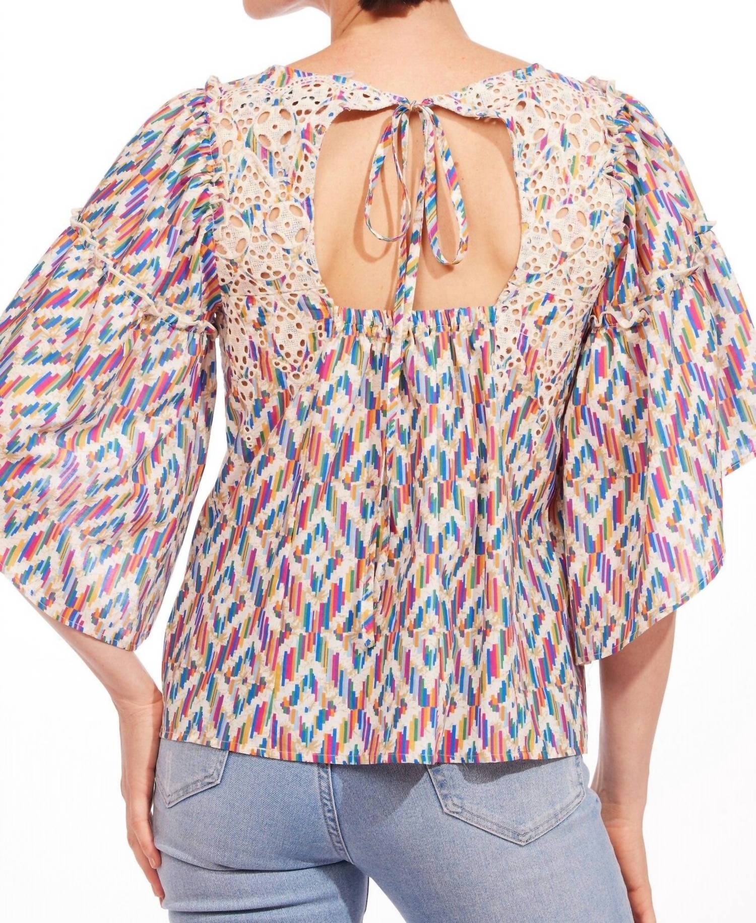 Pair this with your favorite jeans and slides for your next girls night out. Elevate your spring wardrobe with the Chiara Top by EVA FRANCO, an ideal choice for any holiday party. This patterned blouse in Cinque Terre boasts three-quarter bell-shaped sleeves and features a charming tie closure at the back. Made from lightweight cotton, it showcases an asymmetrical hem with ruffle detail for a boho chic vibe. Neckline: Crewneck. Pockets: No. Perfect for Thanksgiving or other festive occasions.