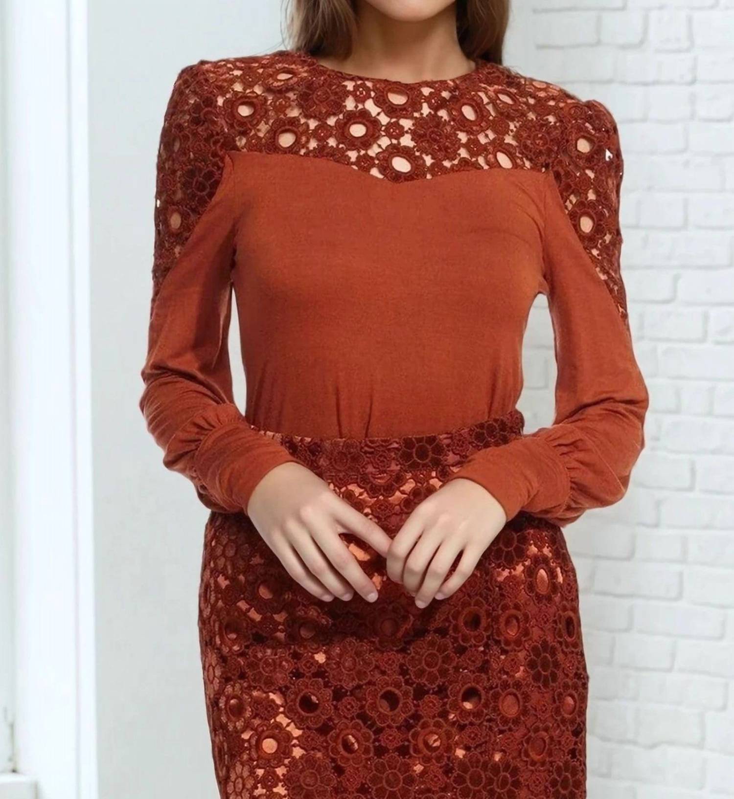 A timeless blouse that will never go out of style. Introducing the Cuvee Blouse by EVA FRANCO, an elegant addition to your wardrobe in Sumatra Lace. With long sleeves crafted from a jersey body and a sheer lace yoke, this blouse offers a flattering silhouette that pairs beautifully with either the Brina or Melville Skirt. Made from high-quality polyester, it features a timeless crewneck and a convenient pull-on style. Perfect for spring holiday parties, it captures the essence of boho chic fashion.