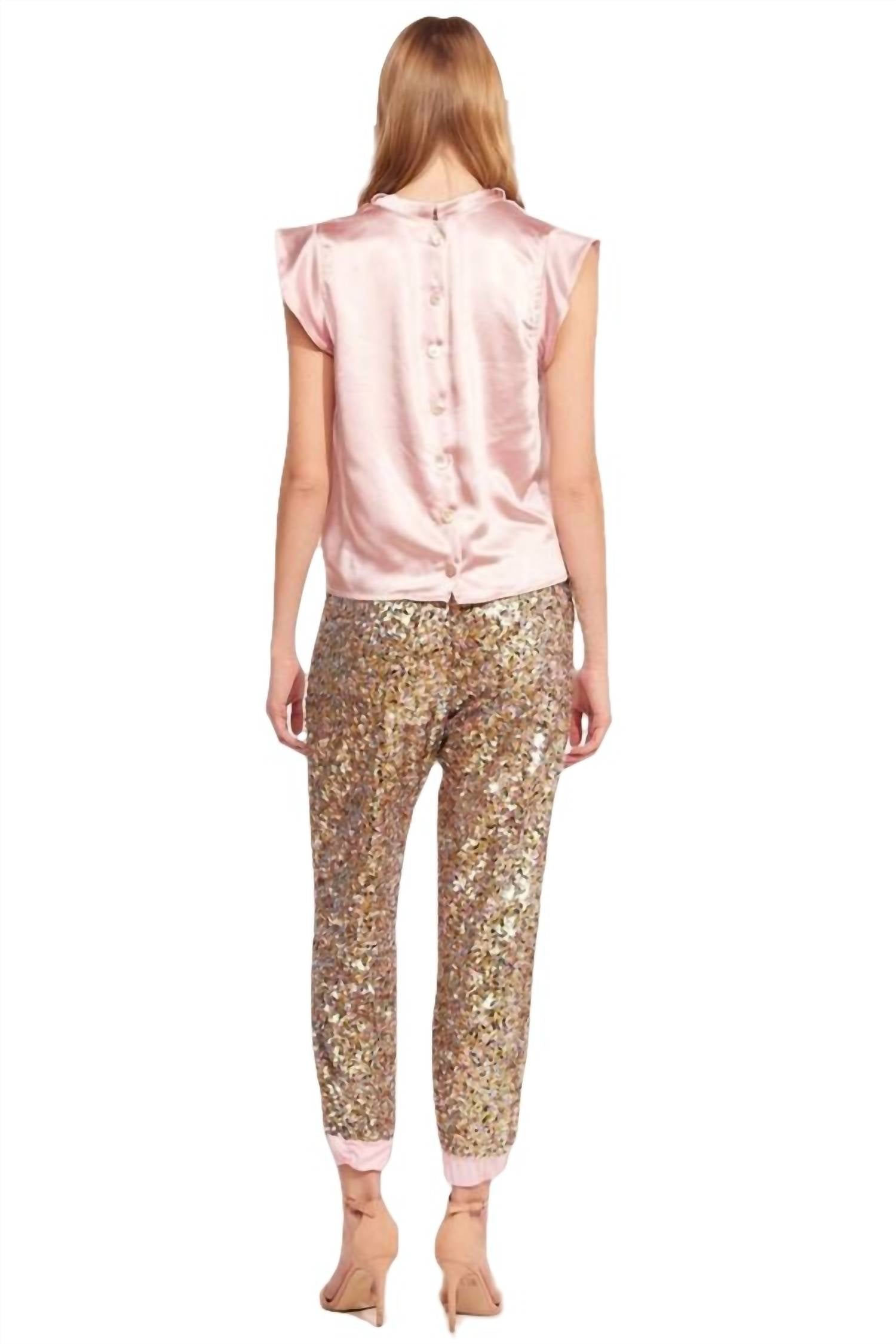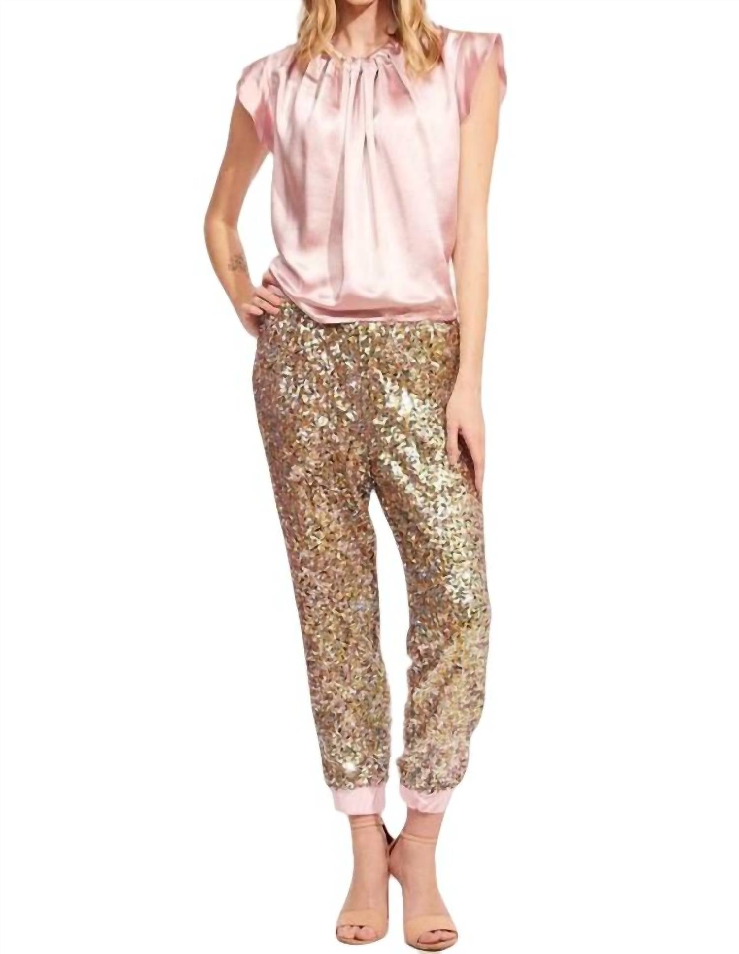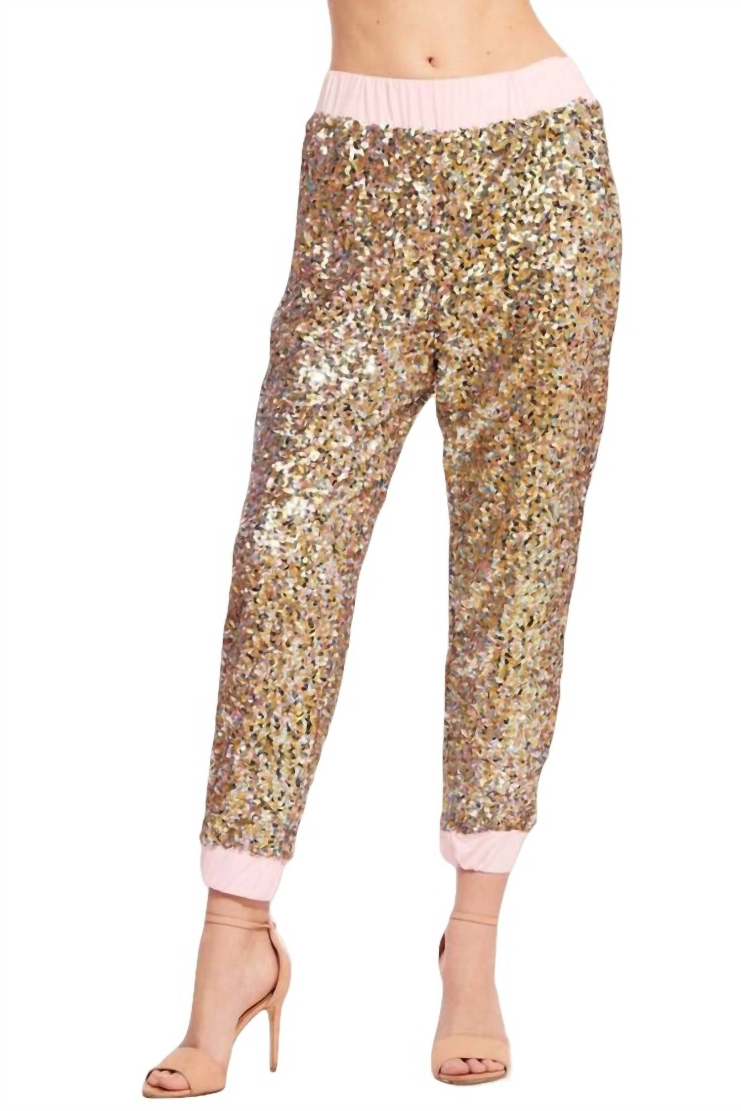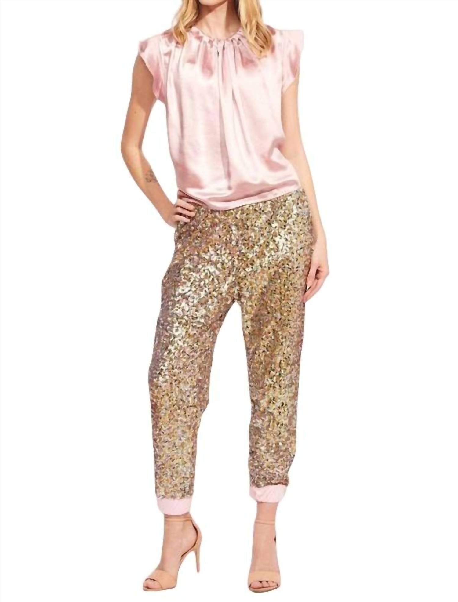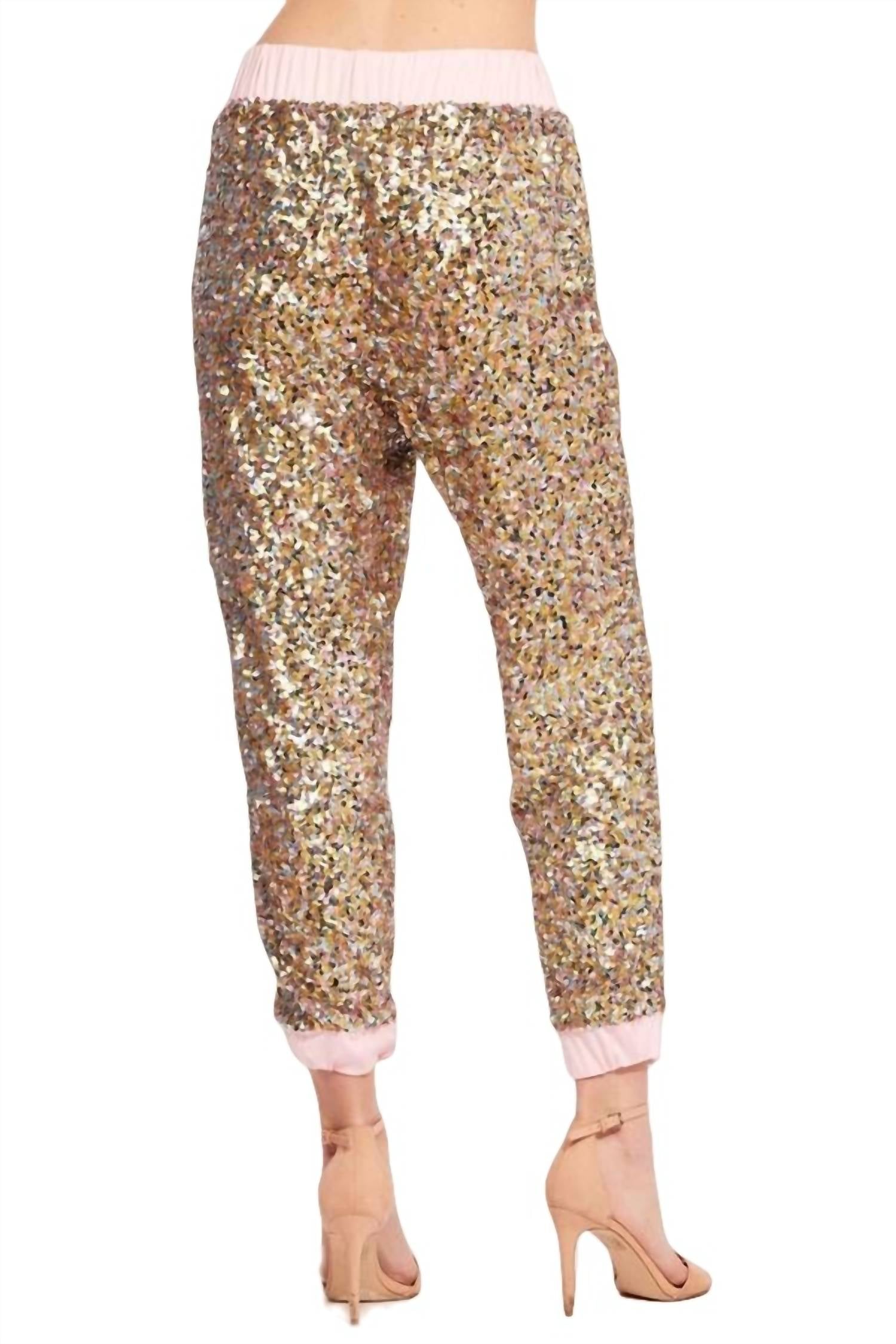 This most loved Fernanda Jogger silhouette in sparkling sequins. Pull-on styling with an elastic waistband and cinched hem, dress these shimmery pants up for the party with heels or even wear with a pair of fashion sneakers for an elevated casual look around town. Pull-on styling. Jogger. Fully lined. Elastic waistband and cuff. Self:100% Polyester. Lining: 100% Polyester. Dry clean only. Made in Los Angeles, USA