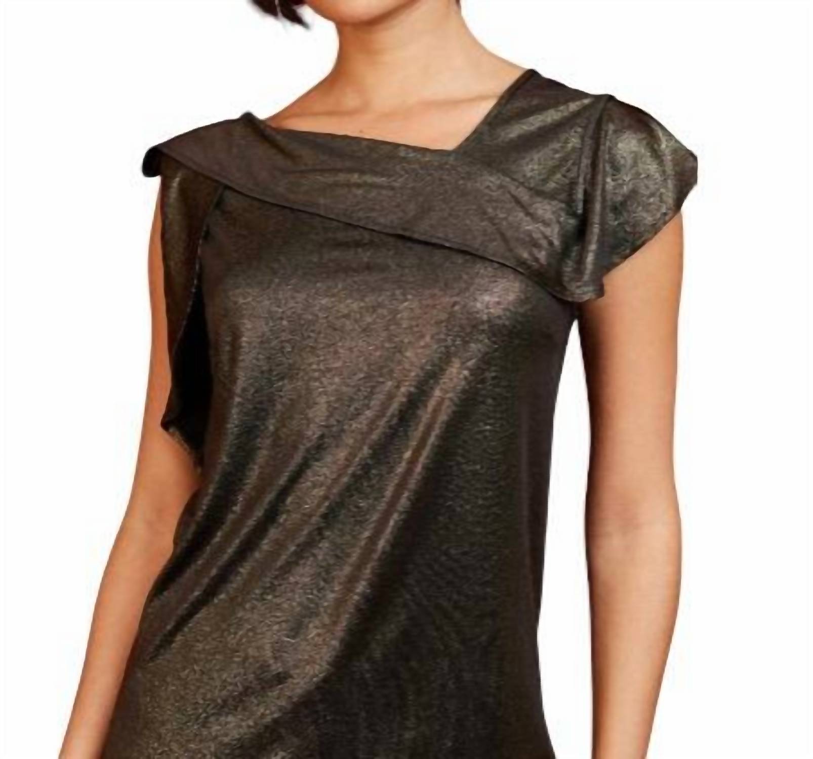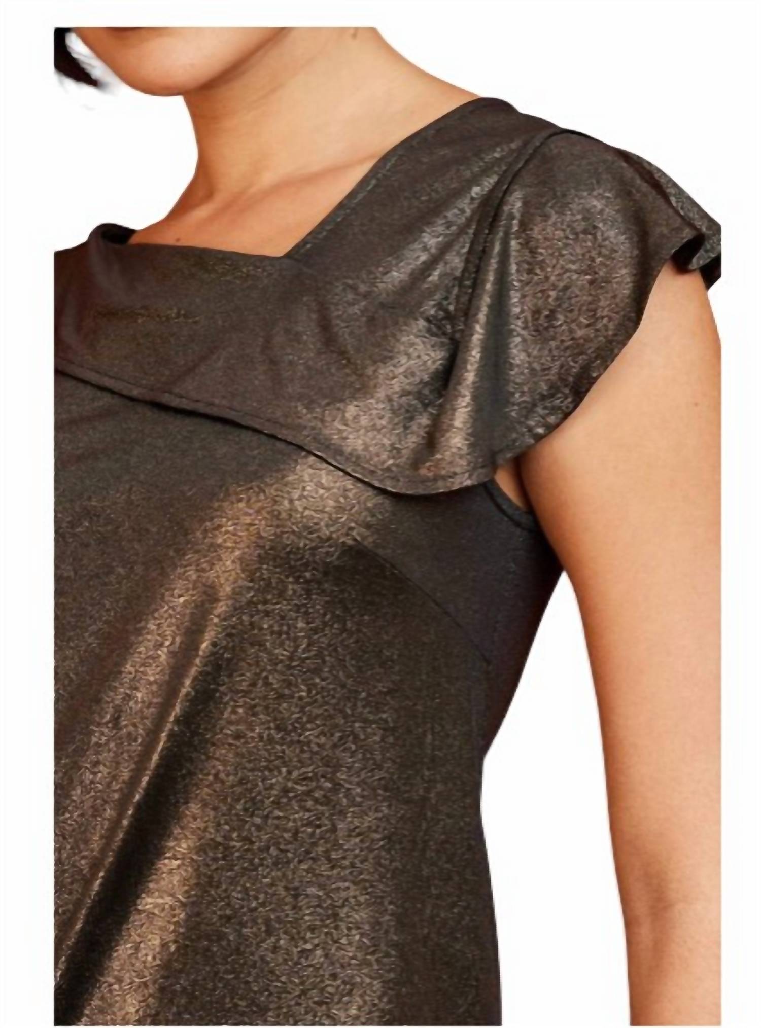 Classic style. Asymmetrical top. Offset V-neck. Flutter sleeve. 95%Polyester 5%Spandex. Dry clean only. Made in USA