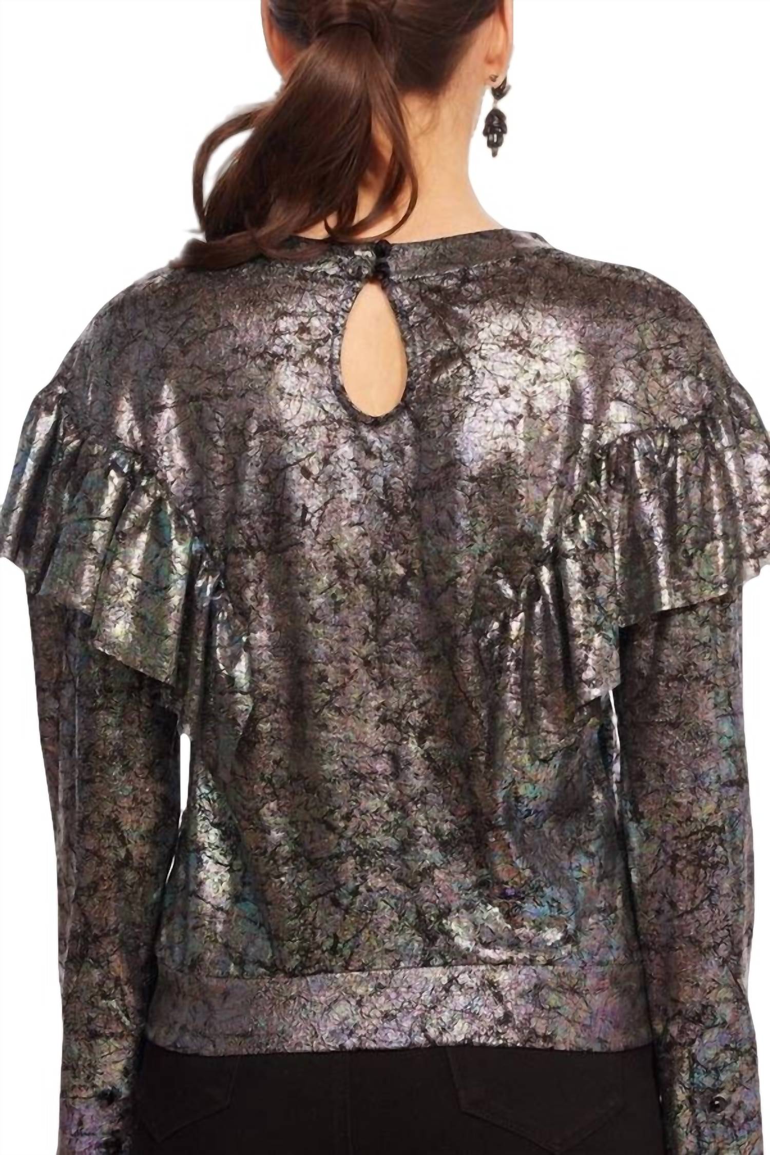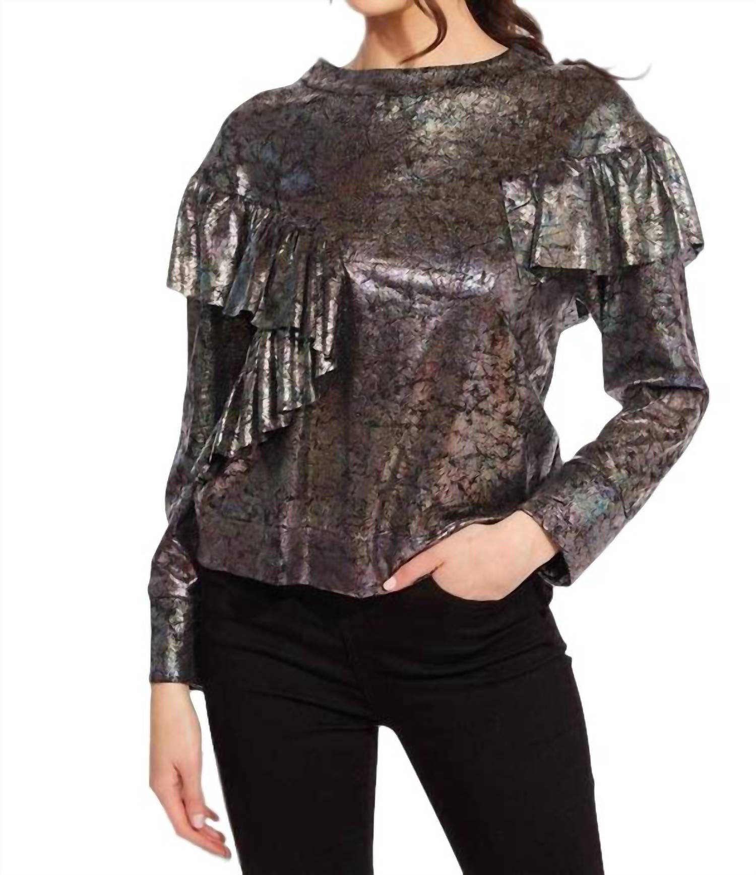 The Yara Top in Pyrite shines above the rest and it's a versatile special-occasion option that looks as lovely under a businesslike blazer as it does paired with jeans. Ruffled detail. Button back. Long sleeve. 67% Rayon 33% Polyester. Hand wash cold. Made in Los Angeles, USA