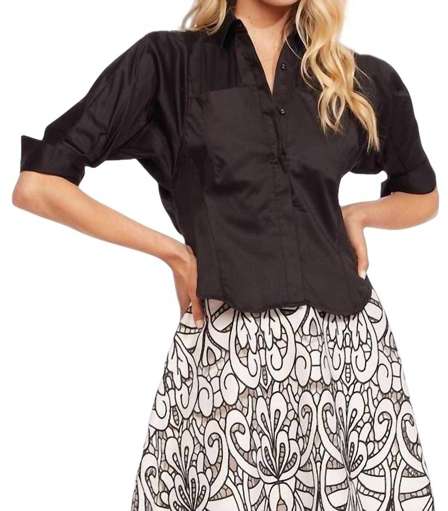 Perfectly tailored and soft to the touch. A wardrobe essential that looks equally great dressed up with a full skirt, or dressed down with a pair of jeans. The Sibella shirt is an elegant and funky twist on the classic button-up. Shirt collar neckline. 3/4 Length sleeves. Button down. Cotton, Elastane. Dry clean. Made in the USA