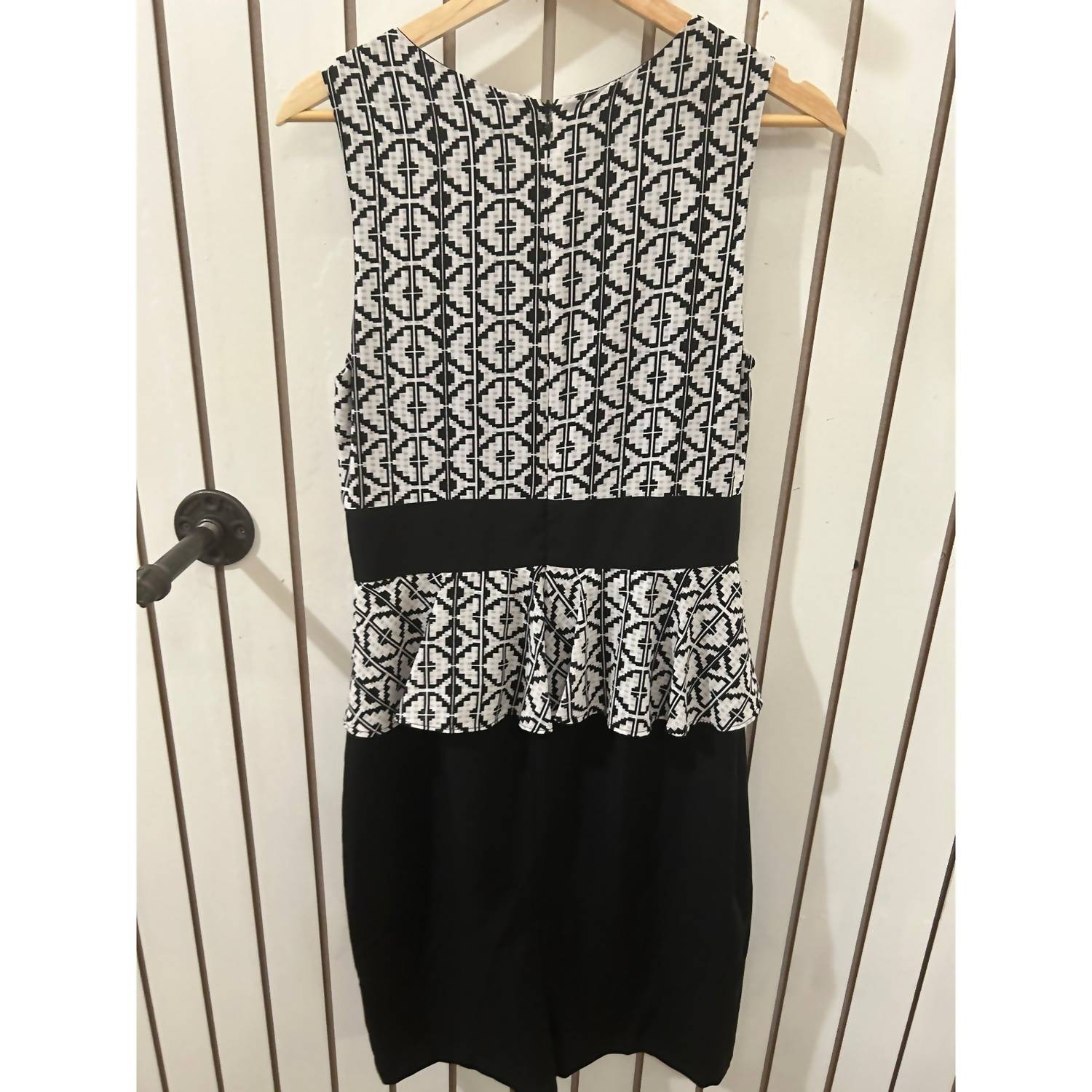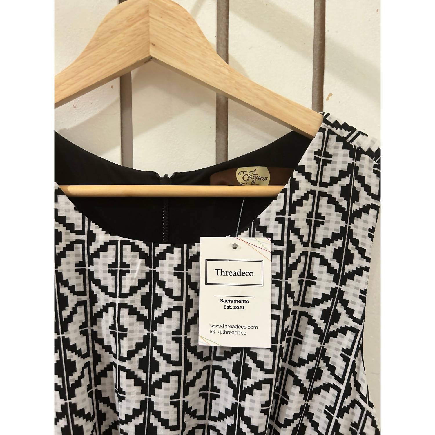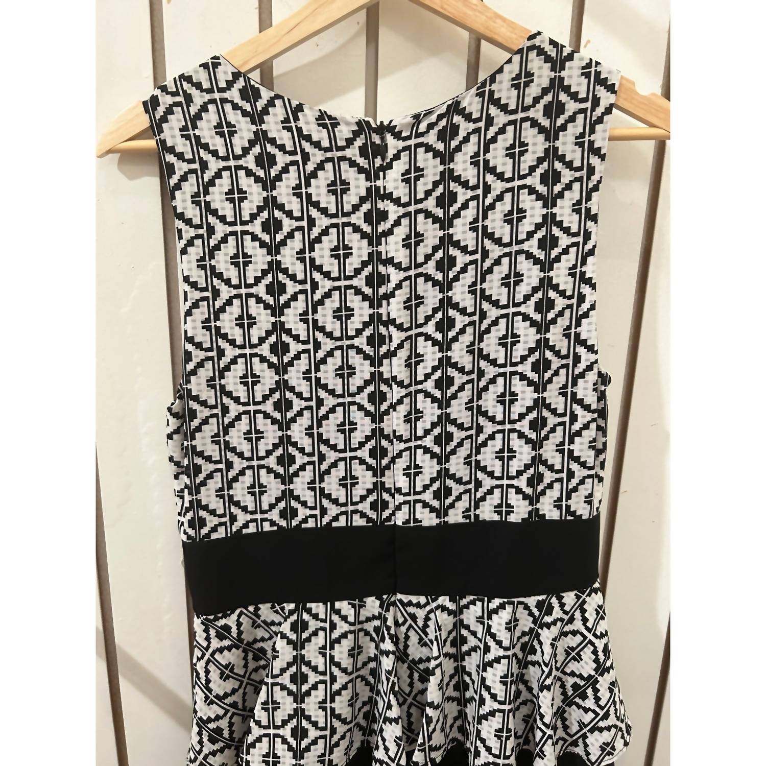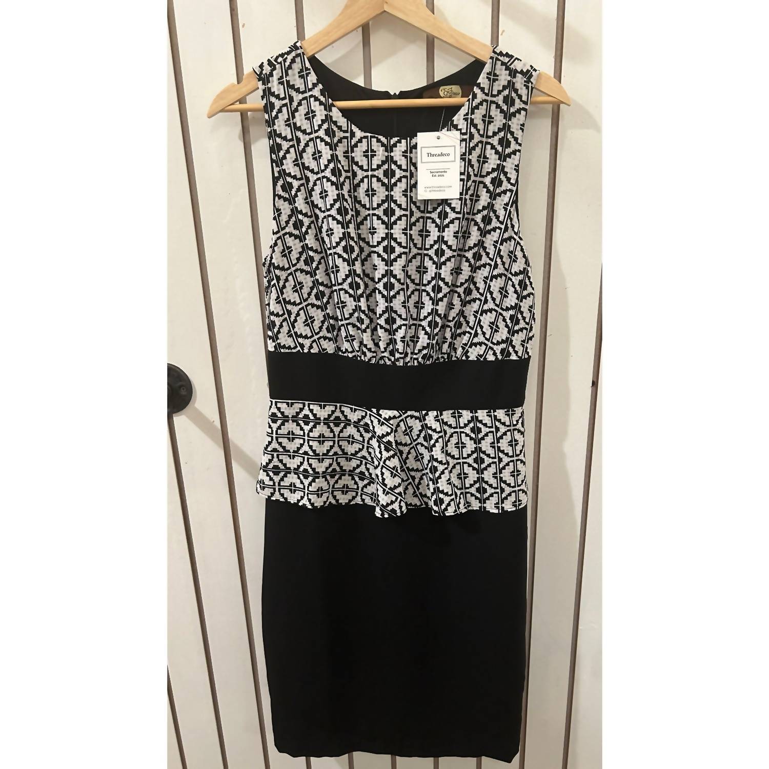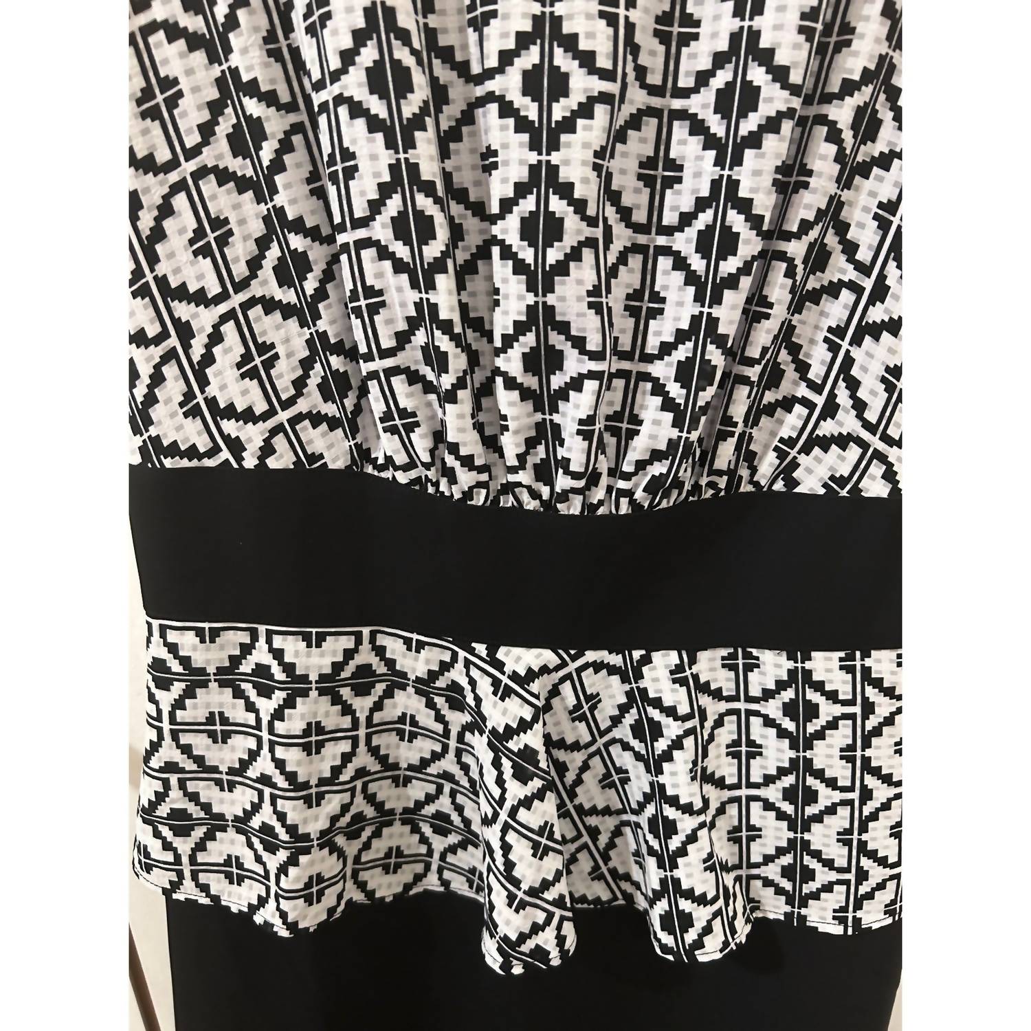 Just add slides or mules and you are good to go. Presenting the Eva Franco Peplum Waist Dress, a sophisticated and eye-catching choice for any stylish occasion. This sleeveless midi dress boasts intricate black and white patterns with a flattering peplum waist detail. Crafted with a modern empire waist silhouette, it includes a convenient zip closure and features a boatneck design. Care for your dress by hand washing and line drying to maintain its elegant appeal. Perfect for spring events, the Peplum Waist Dress effortlessly combines modern elegance with timeless charm.