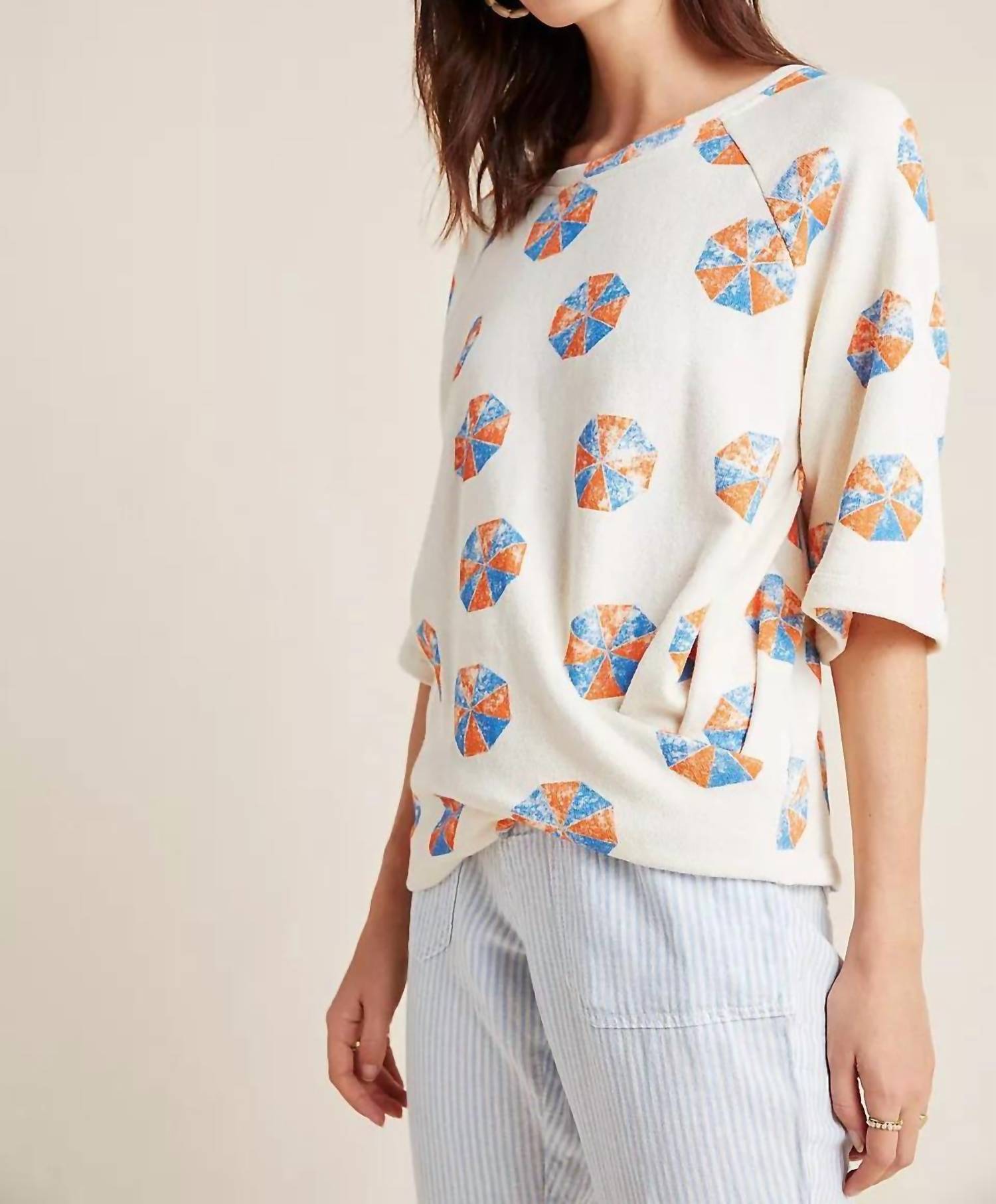 This classic, short sleeve tee will be your go-to staple this season and beyond. Delightful piece for summer escapades, featuring an eye-catching umbrella print on an ivory background. Crafted with 83% Cotton, 12% Polyester, and 5% Spandex. Ensures comfort and style with its elbow-length sleeves. Made in US. Offers a practical pullover styling with a charming crewneck. 23" long patterned tee. Dry clean to maintain its quality and vibrant design.