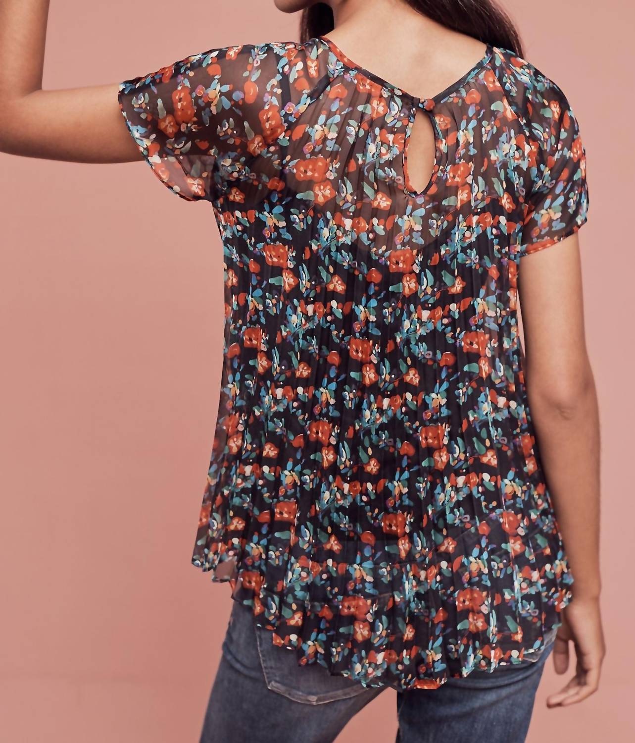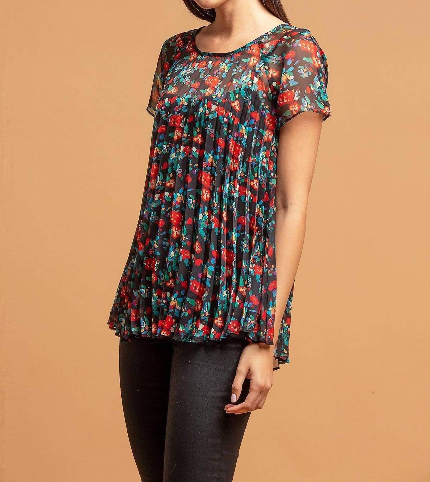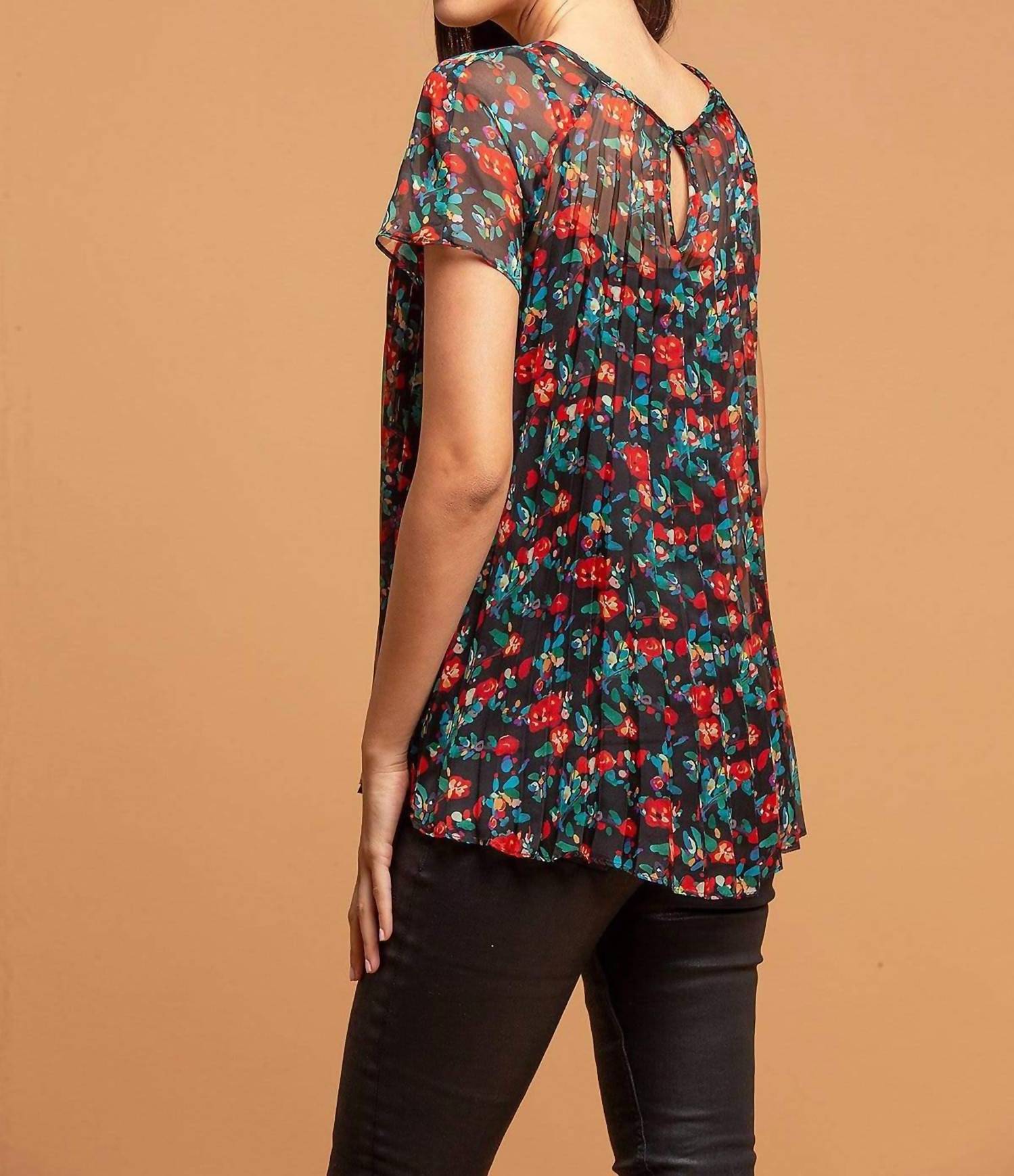 A timeless blouse that will never go out of style. Elevate your wardrobe with the EVA FRANCO Pleated Top, a chic and feminine piece perfect for any occasion. Designed in a playful multi-floral pattern on a sheer black chiffon background, this short-sleeve blouse features a keyhole back with a button closure. Made from premium polyester with a polyester lining, this stylish piece is crafted in the USA and measures approximately 25 inches in length. Care for this elegant garment with dry cleaning to maintain its beautiful pleated form.