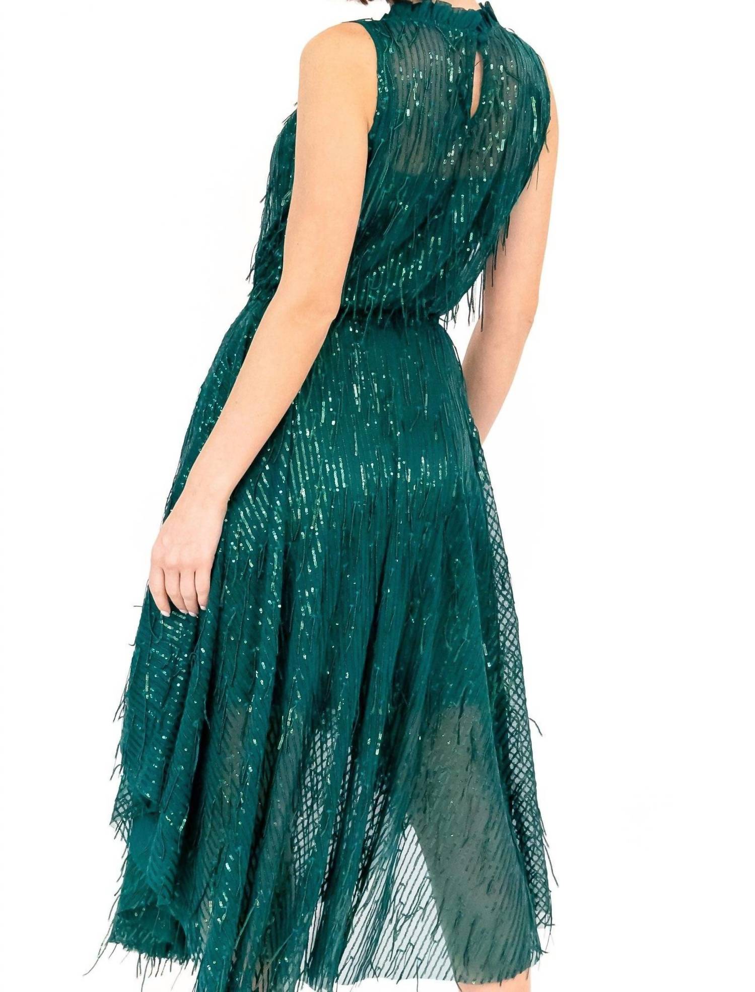 All that glitters... this fantastic sequin fringe fabric is dripping with shine in the most beautiful emerald pine color. The silhouette is a comfortable pullover style with an asymmetrical hem, mock neck, and cinched elastic waist for extra comfort. Asymmetrical hem. Mock neck . Neck button loop closure. Pullover styling. Cinched elastic high waist. Fully lined. Sleeveless. Midi Length