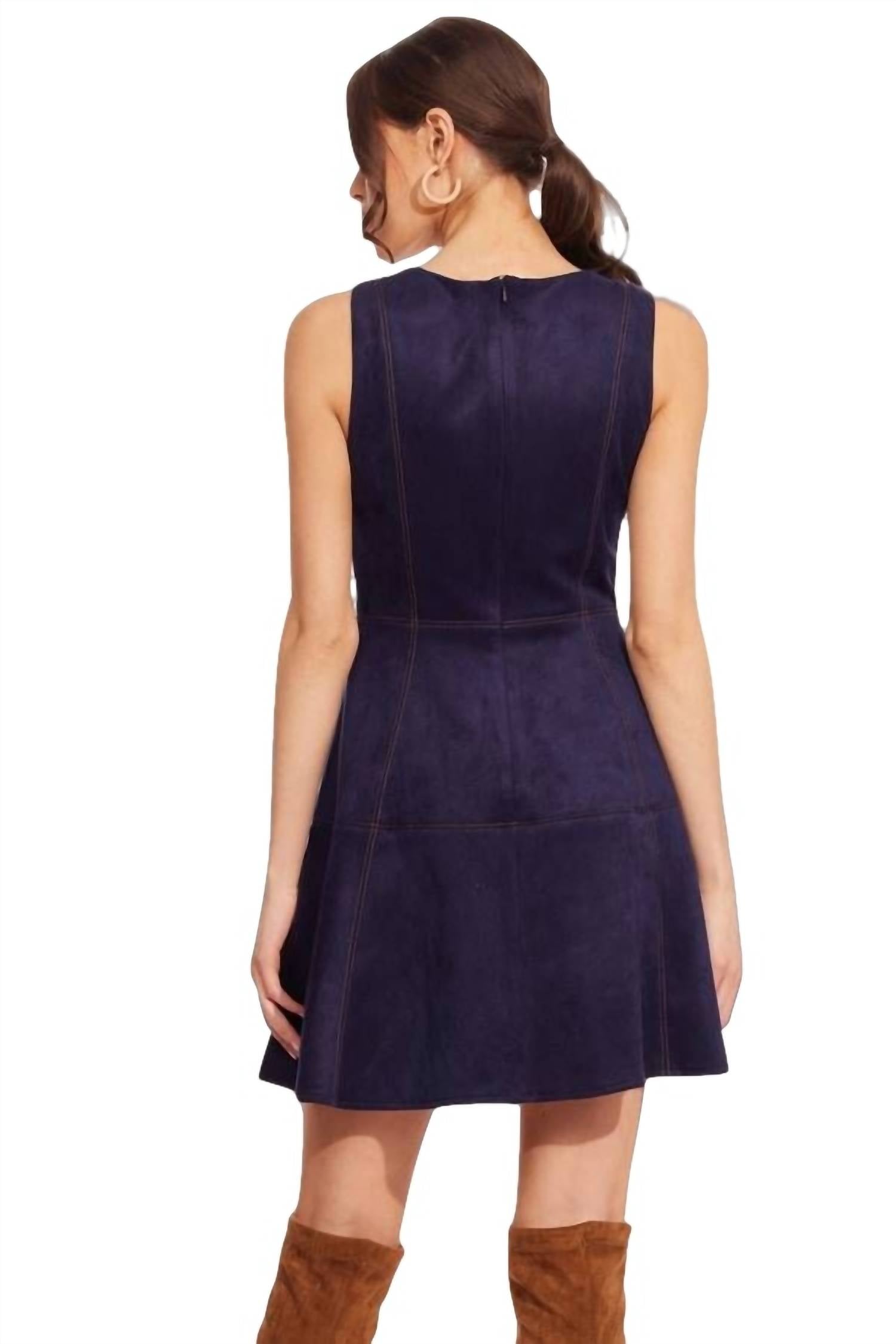 Step out in style with this flattering fit and flare ultrasuede dress, perfect for this season. Featuring a round neckline and finishing at mini length, our Haven dress is ideal for layering up with jackets in the spring and fall or dressing up with boots in the winter. Fit and flare. Ultrasuede fabric. Mini length. Sleeveless. Back zipper