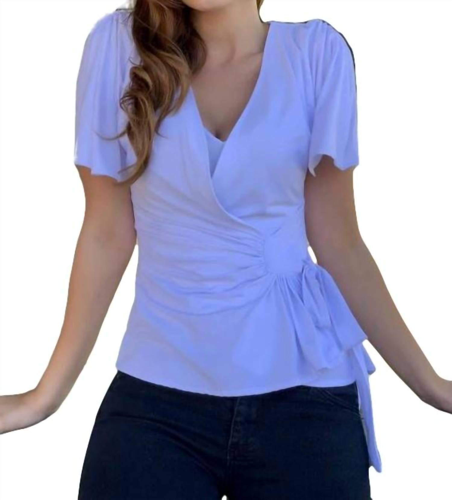 The short sleeve tee you'll want in every color. The Marika Top is a faux wrap style with short pleated kimono sleeves and an attached sash tie to cinch at the hip. Soft cozy knit top is fully lined Pairs perfectly with pants or a skirt. 65% Rayon, 30%Nylon, 5%Spandex. Made in the USA