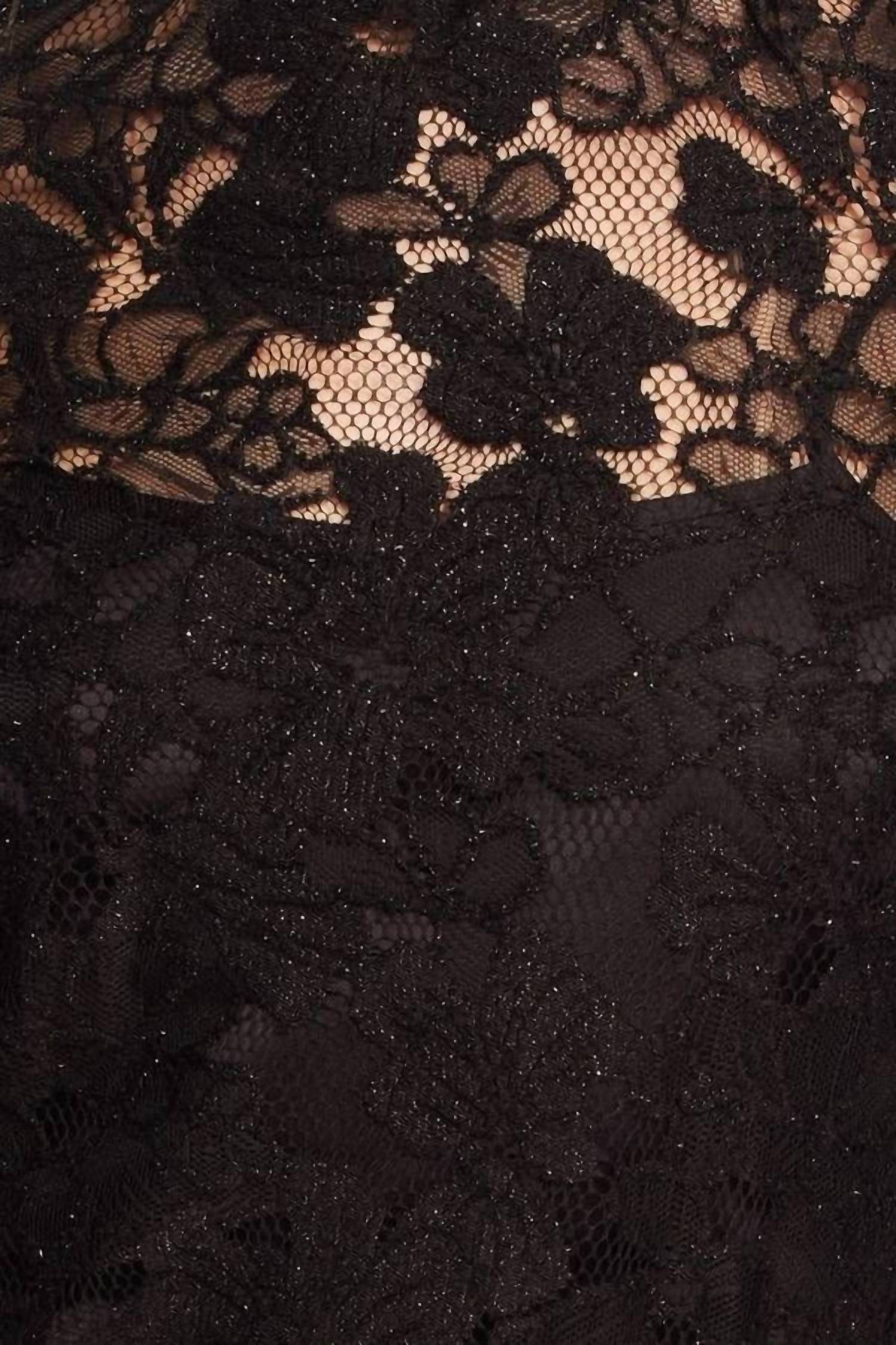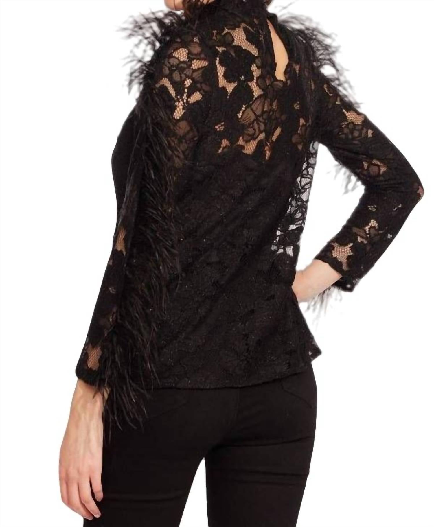 This gorgeous mock neck top features ultra chic lace sleeves that are embellished with feathers. Mock neck. Feather embellishment. Long lace sleeves. Keyhole button closure at back neck