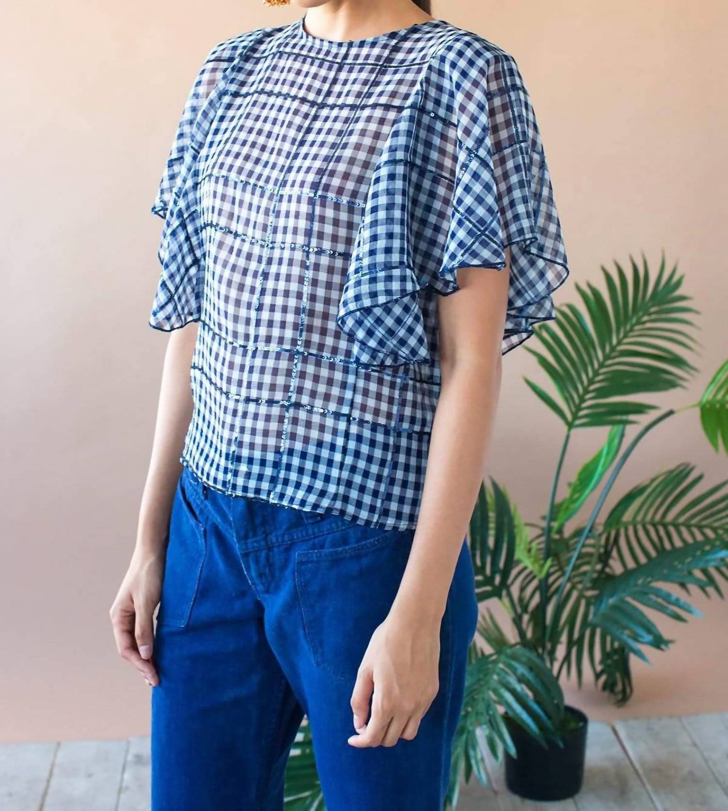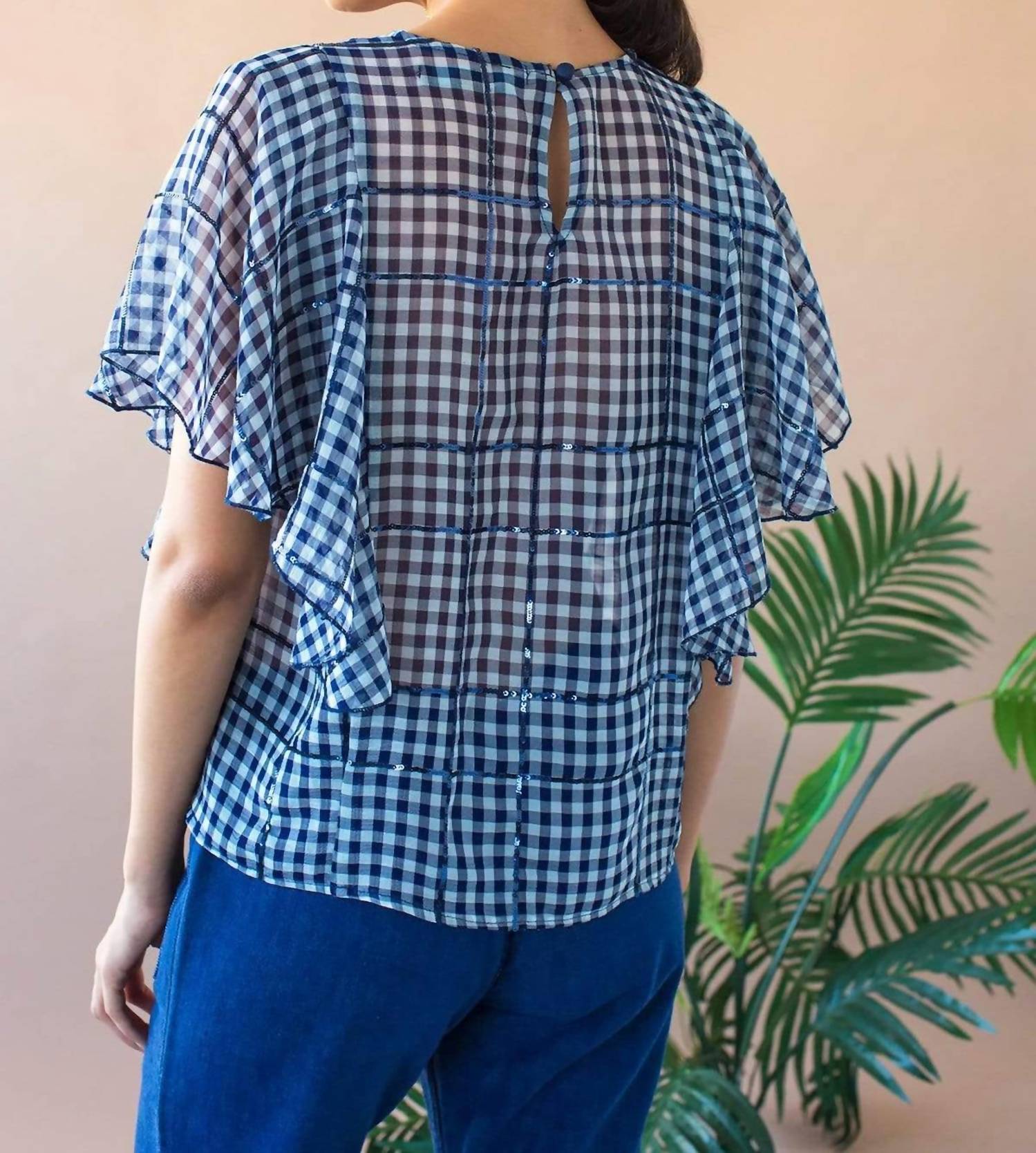 A timeless blouse that will never go out of style. Elevate your look with the Juniper Cape Sleeve Top by EVA FRANCO, featuring short cape sleeves for airy sophistication. This blouse is crafted from Indigo Gingham polyester with eye-catching navy sequins, complete with a coordinating spaghetti strap cami. Made in the USA, it boasts a classic crewneck and a discreet button closure. Care is easy with dry cleaning recommended for this elegant piece, perfect for holiday parties or spring events.