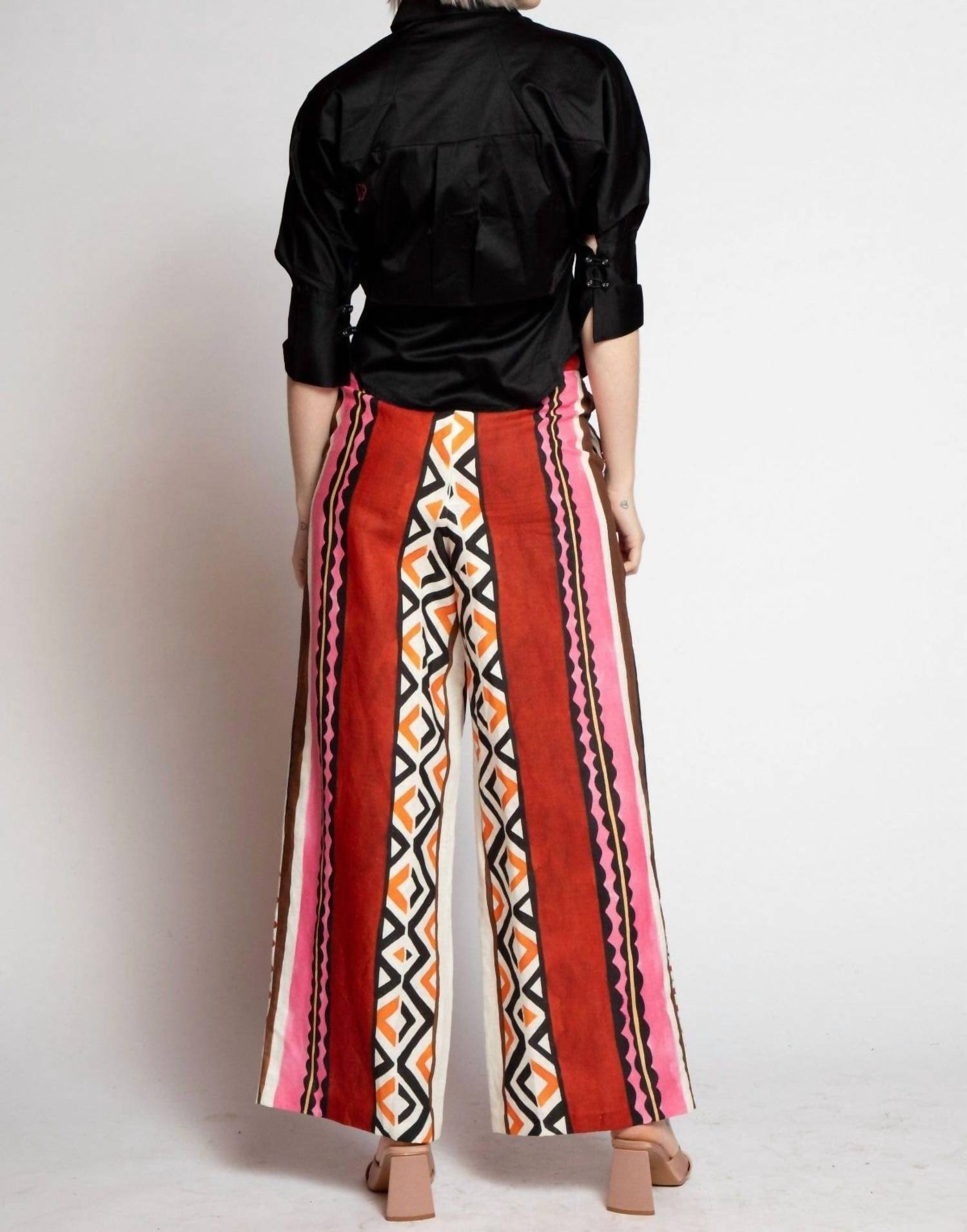 Embrace a breezy summer vibe with the Cypress Pant by Eva Franco in Tulum Stripe. Expertly crafted from linen, these pants showcase a geometric stripe print in vibrant hues, adding a playful touch to your wardrobe. Designed with a wide leg cut, they feature a convenient side zip closure and practical side pockets, offering both style and comfort. Perfect for carefree days, these pants are fully lined for added ease and wearability.