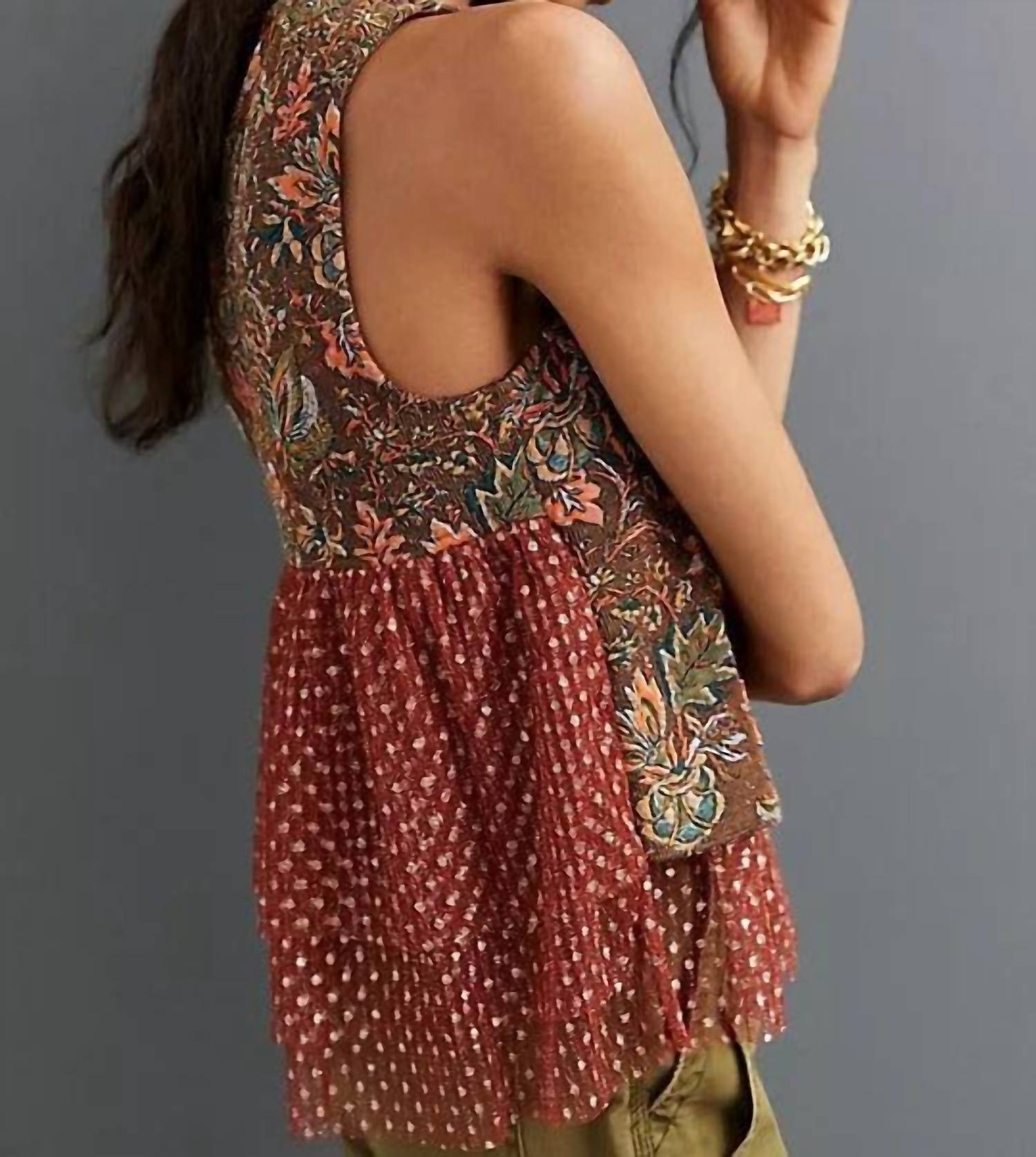 Fit, fabric and functionality. This tank top checks all the boxes. Introducing the Jacquard Sleeveless Top by EVA FRANCO, a perfect embodiment of autumn's rich tones with a floral design. Crafted from a well-balanced blend of 65% Polyester, 25% Viscose, 5% Lycra, and 5% Lurex, this top boasts a crewneck and a layered tulle hem. The pullover style ensures easy wear, while being machine washable for convenience. Measuring standard at 22" in length, this top is imported to guarantee quality craftsmanship.