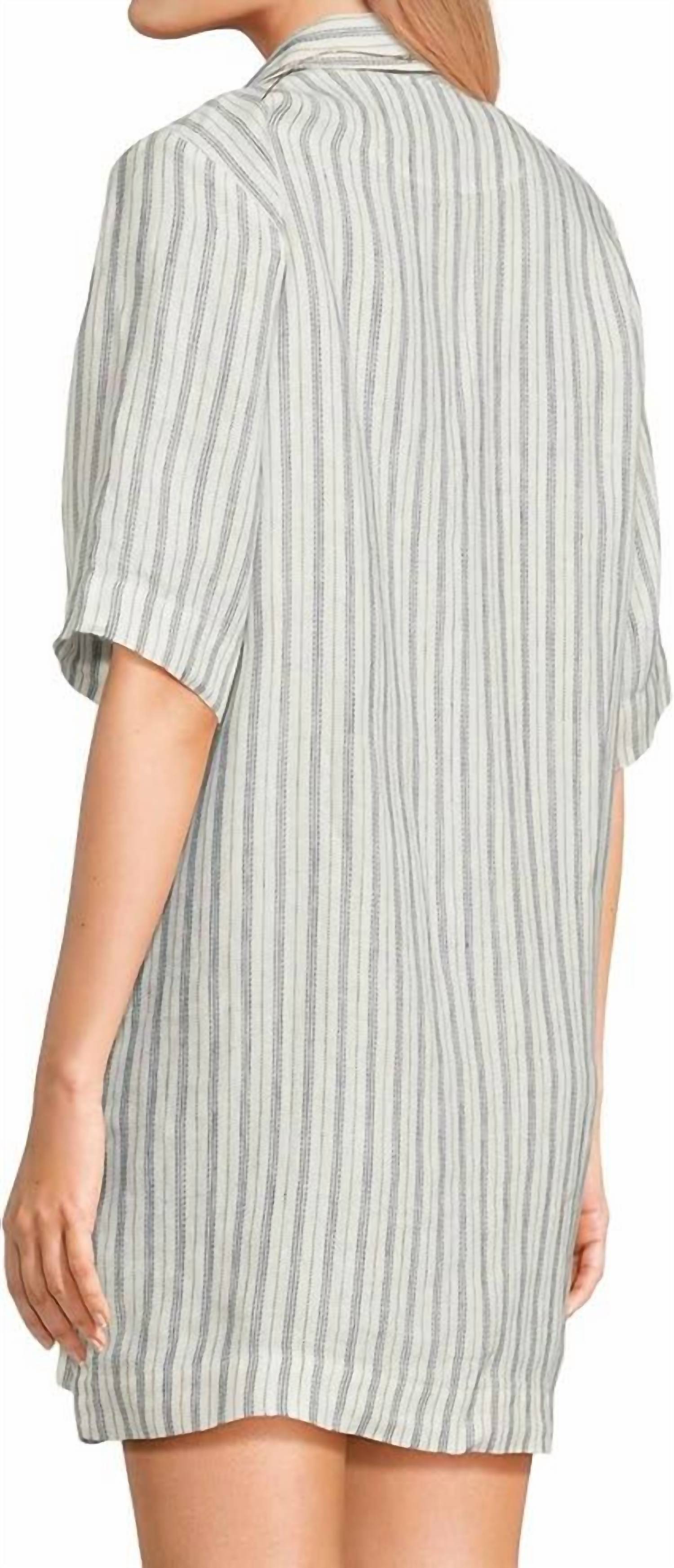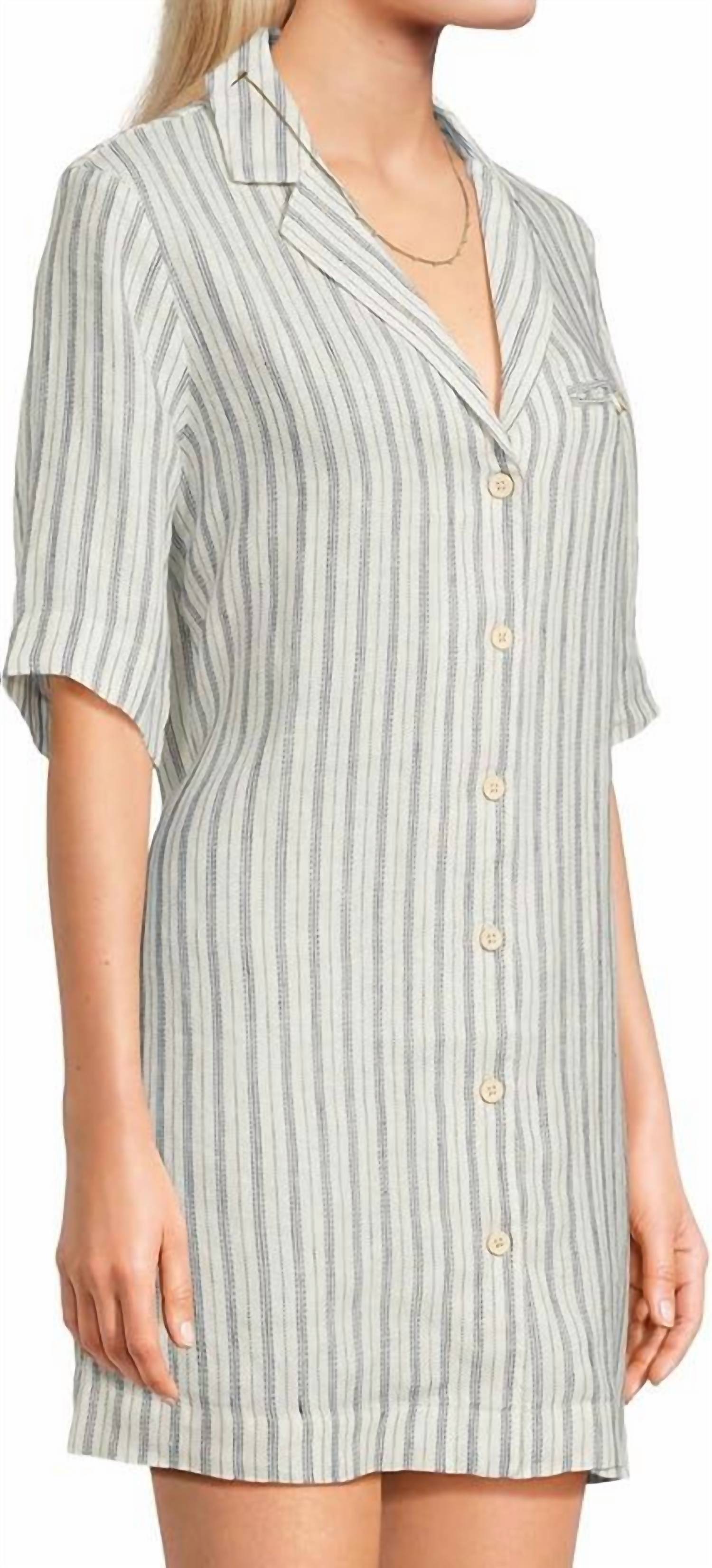 A short and breezy dress for those warmer days. Embrace effortless style with the Paradise Point Dress by Faherty, a must-have for your vacation wardrobe. This mini dress in Oceanside blue features a stripe pattern and elbow-length sleeves, perfect for spring workwear. Its 100% linen composition ensures a breathable fit, complemented by a classic collar and button closure. Care: Hand wash for lasting quality.