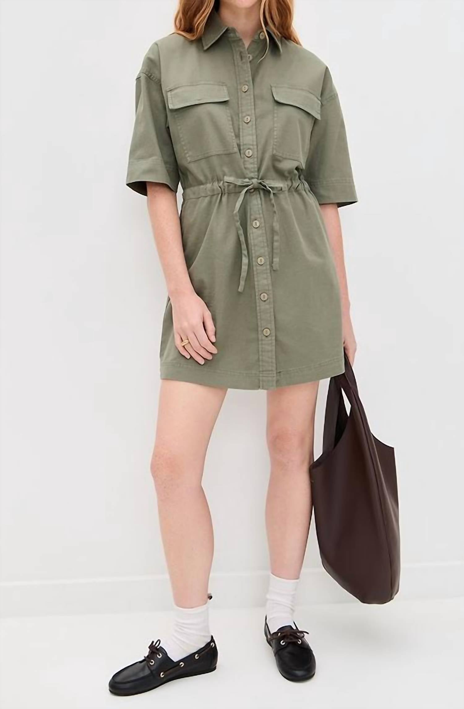 The kind of easy and flattering dress you'll be reaching for all season long. Make room in your wardrobe for the Utility Twill Shirtdress by Faherty, a minimalist's dream in solid green. This short-sleeve dress is crafted from a mid-weight stretch twill composed of 98% cotton and 2% elastane, ensuring comfort and ease. The mini-length shirt silhouette features a collared neck, button closure, tie at waist, and practical flap breast pods plus on-seam side pockets. Ideal for summer, this dress requires machine washing and can be tumble-dried.