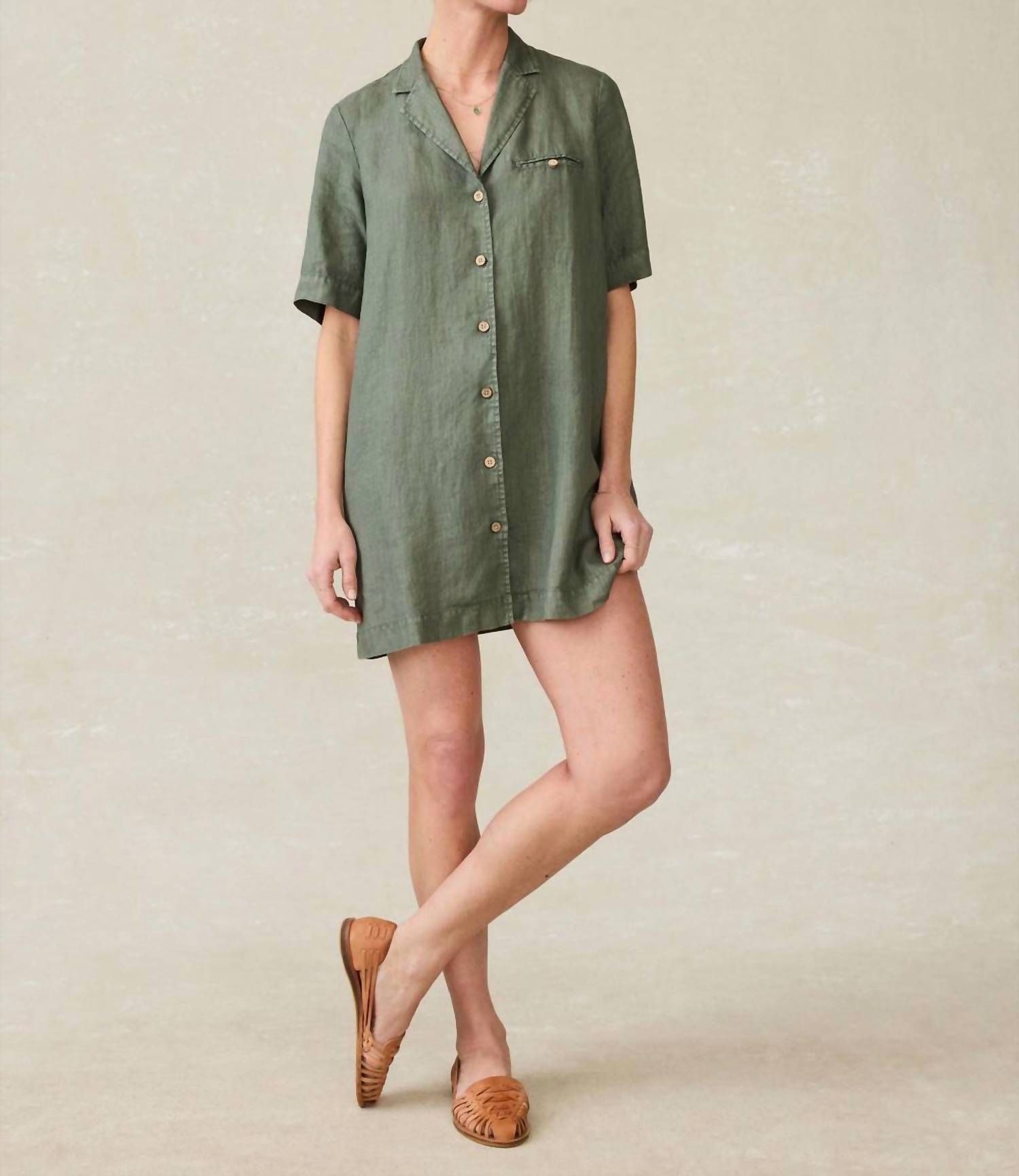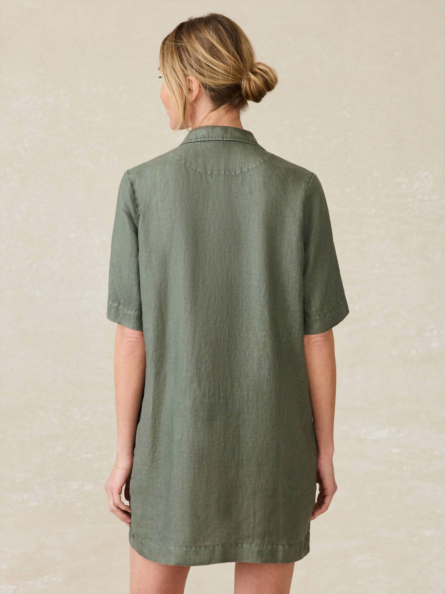 The kind of easy and flattering dress you'll be reaching for all season long. Introducing the Faherty Paradise Point Dress in Thyme, a relaxed fit mini that blends comfort with elegance. Made from 100% linen, this shirt silhouette features a camp collar, V-neck, and short sleeves, complete with a welt chest pocket and coco button closure. With a garment length of 33.5 inches, it's perfect for versatile styling. Care instructions include machine wash cold, gentle cycle, and lay flat to dry, ensuring easy maintenance. Model Edda, standing at 5'10", is wearing a size medium.