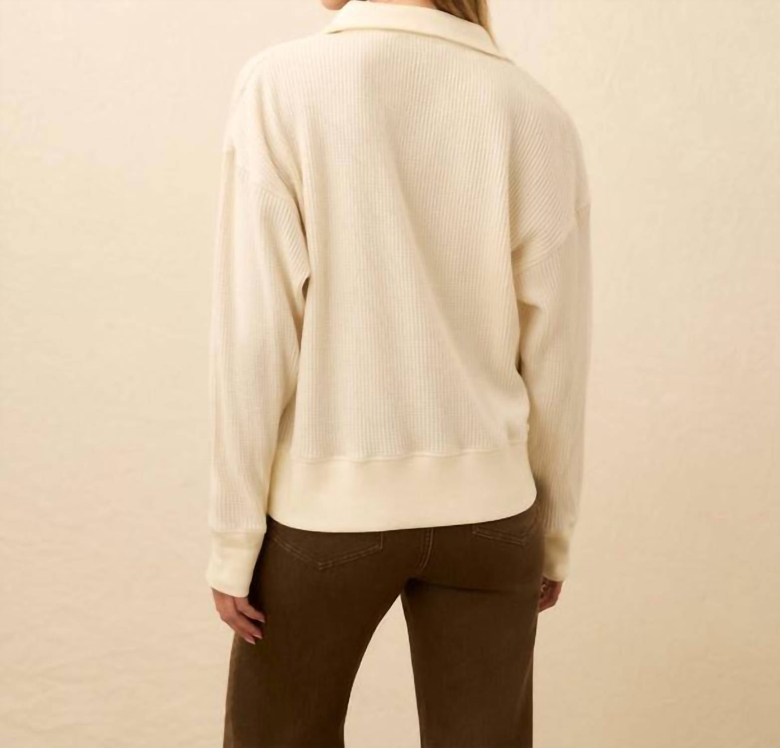 Wear this v-neck sweater with your favorite denim for the perfect fall look. Elevate your casual wardrobe with the Apres Waffle Henley Top by Faherty in Coastal Cream. This piece features long sleeves and a button closure, designed with a comfortable relaxed fit and a length of 23½". Crafted from 100% organic cotton, it exhibits a charming textured pattern with rib trims at the collar, sleeve cuffs, and bottom hem. Effortlessly versatile, this top is perfect for a minimalist spring look; simply machine wash and tumble dry for easy care.