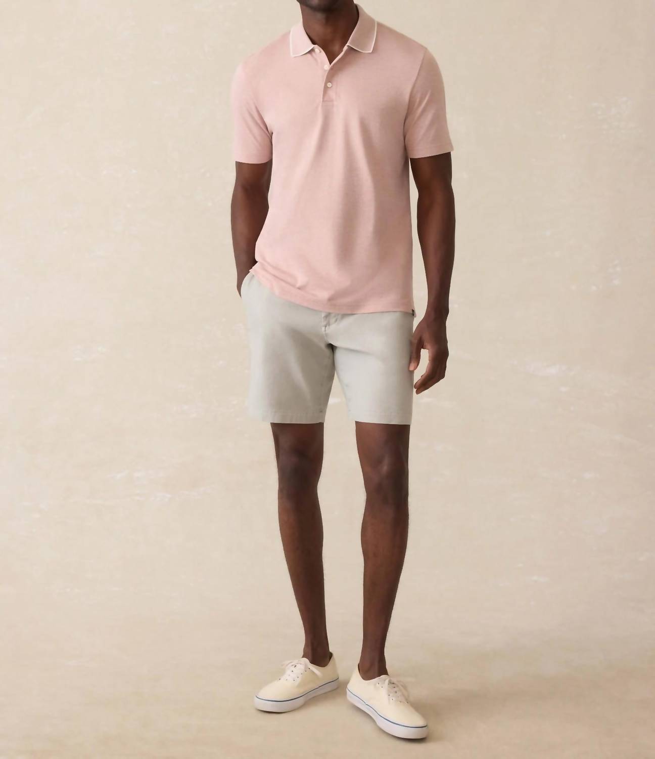 Experience the refined style of the Short Sleeve Movement Pique Polo by Faherty, offered in a sophisticated Sedona Melange. Featuring short sleeves and a spread collar with built-in stays, this polo is crafted from a luxurious blend of 56% Pima Cotton, 38% Cellulose Livaeco Modal, and 6% Elastane. The 28 1/2" length classic fit ensures comfort and precision tailoring, complemented by a practical three-button closure. Care for this minimalist piece with ease by turning it inside out and machine washing cold; tumble dry low for best results. Model Tope, standing 6'2.5", wears a size medium.