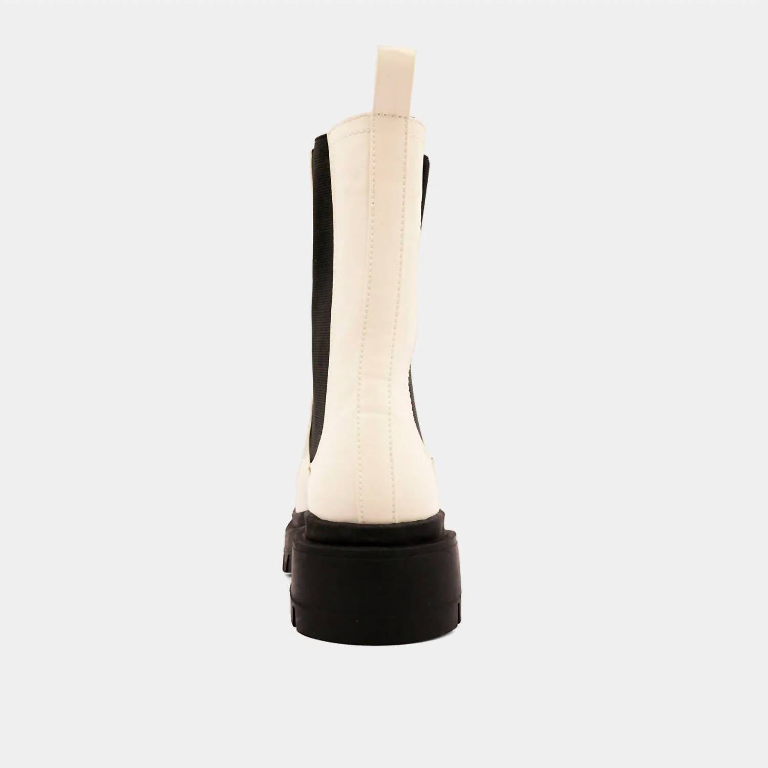 Say hello to the perfect, most versatile boot. The ankle height makes this style easily transition from day to night. Wear them with your favorite skinny jeans and tee for a more laid back look, or pair them with your favorite mini dress and jacket for a night out on the town. Experience the sleek, modern design of the Yusnan Boots by SHU SHOP, crafted in off-white faux leather with striking black detailing. These women's ankle boots feature a comfortable round toe and a statement chunky heel that adds a bold touch to any outfit. Ideal for adult fashion enthusiasts seeking a chic and edgy footwear option. Perfectly tailored for both style and comfort, these boots are a must-have addition to your wardrobe.