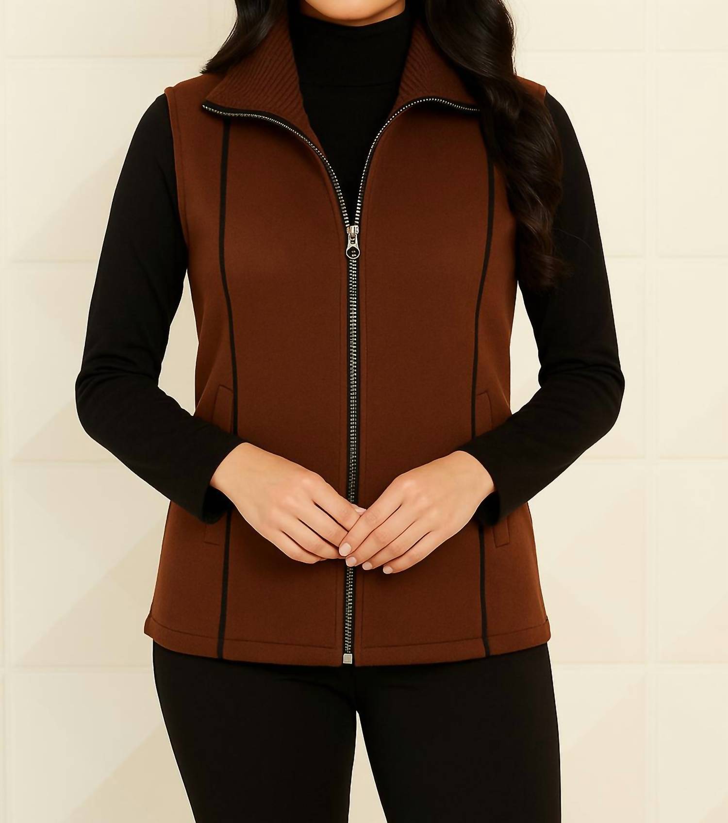 That extra layering piece you didn't know you needed! Introducing the Ribbed Collar Vest With Stitch Detail by Angel Apparel, a chic piece in a rich mocha hue perfect for versatile styling. Designed with long sleeves and a mock-neck styling, this vest is crafted from a comfortable 55% cotton and 45% acrylic blend. It is imported and hits at the hip, offering a flattering fit for women. Closure: Zip closure. Care instructions recommend a delicate hand wash or dry clean for maintaining its pristine condition. This piece is available in plus sizes, ideal for both workwear and travel in the spring season.