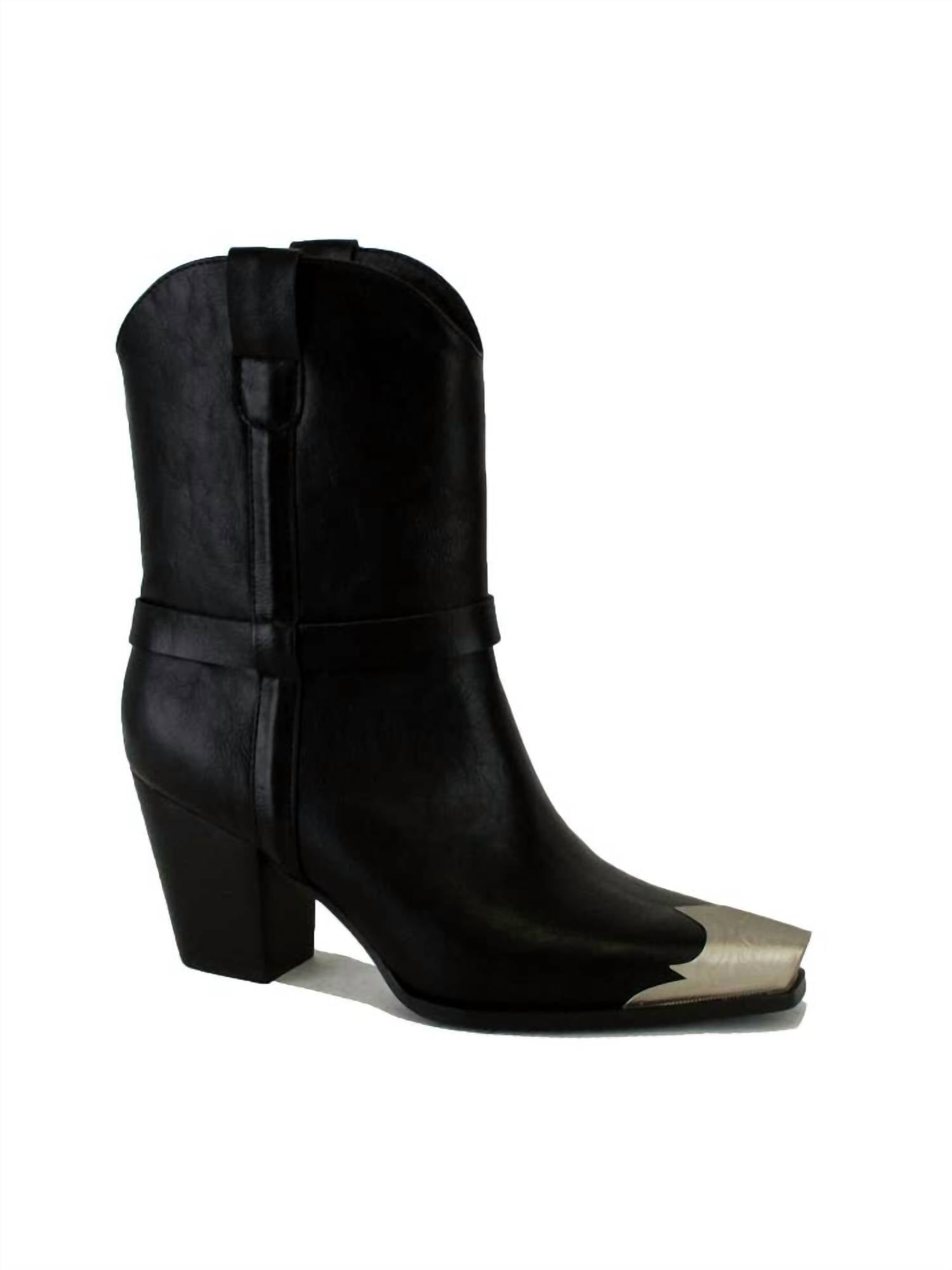 Say hello to the perfect, most versatile boot. The ankle height makes this style easily transition from day to night. Wear them with your favorite skinny jeans and tee for a more laid back look, or pair them with your favorite mini dress and jacket for a night out on the town. Step out in style with the Women's Dakota Metal Toe Boots by BEAST FASHION, masterfully crafted in black faux leather for a modern twist on a classic cowboy look. These ankle boots showcase a striking metallic silver toe cap and Western-inspired stitching, perfect for adding a bold touch to any outfit. With a 6.5-inch shaft height and a mid-height 3-inch stacked block heel, they offer a comfortable balance of Western edge and everyday wearability. Ideal for evening events, these boots feature a squared toe design, exuding both sophistication and daring flair.