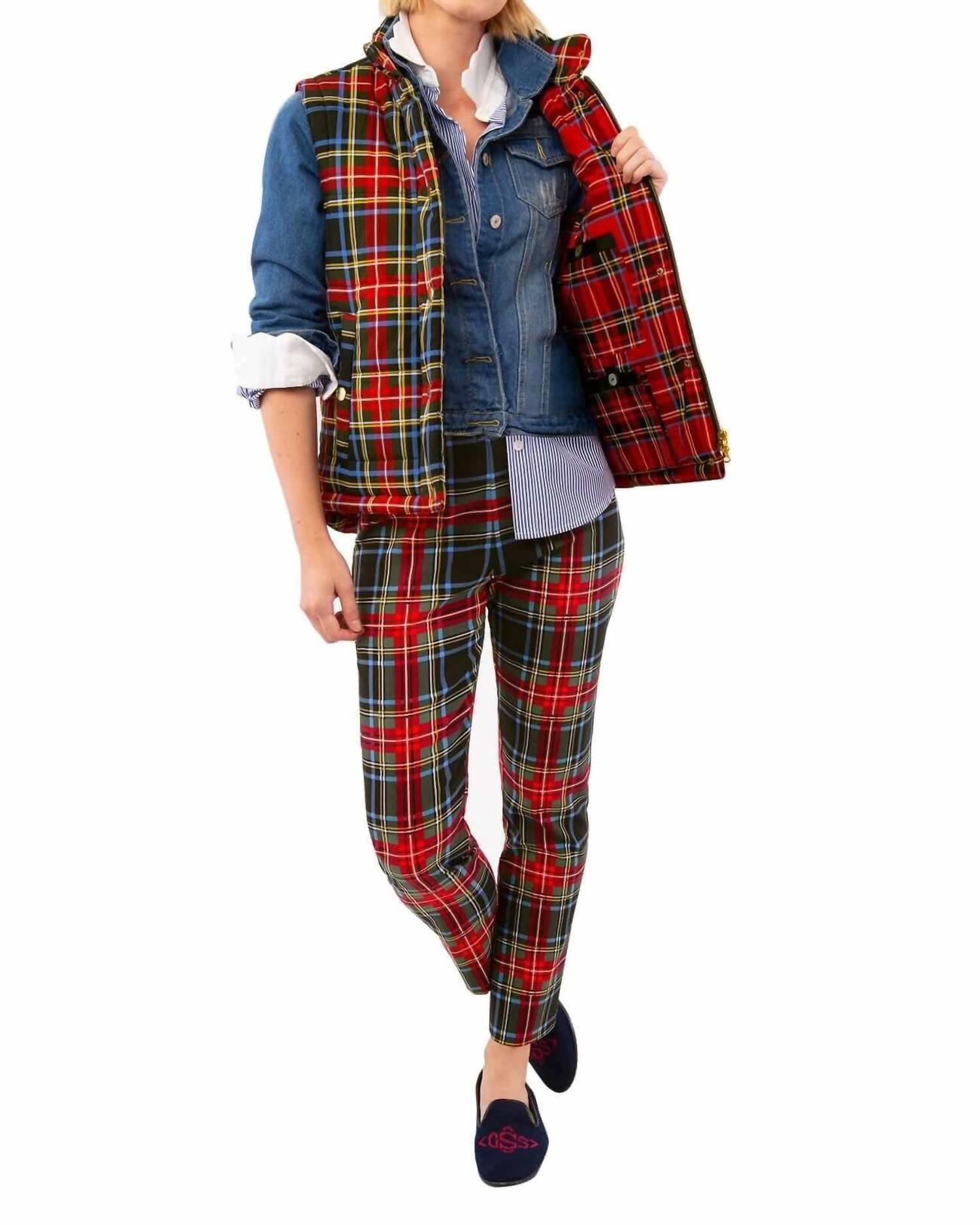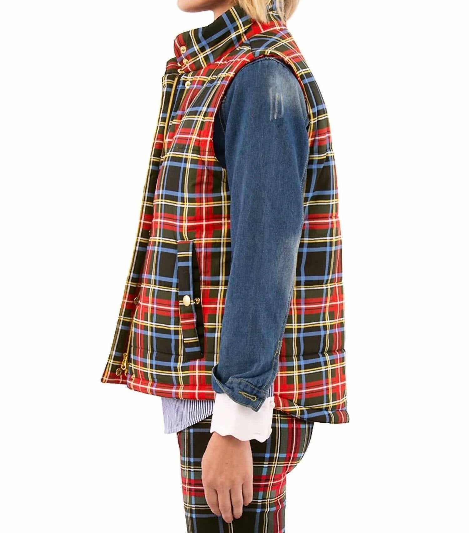A vest so versatile you can mix and match it with almost any outfit and it will feel brand new every time. Elevate your wardrobe with the Duke Of York Puffer Vest by Gretchen Scott, a chic addition to your back-to-school ensemble. This sleeveless vest in Black Multi boasts a stylish contrast plaid lining and features versatile hidden goldtone zipper and snap front closures. Its 25" length hits below the hip, offering both warmth and a flattering fit. Crafted from a cotton poly blend, this vest includes side slit pockets with inside grosgrain ribbon trim and requires cold wash gentle or spot clean care.