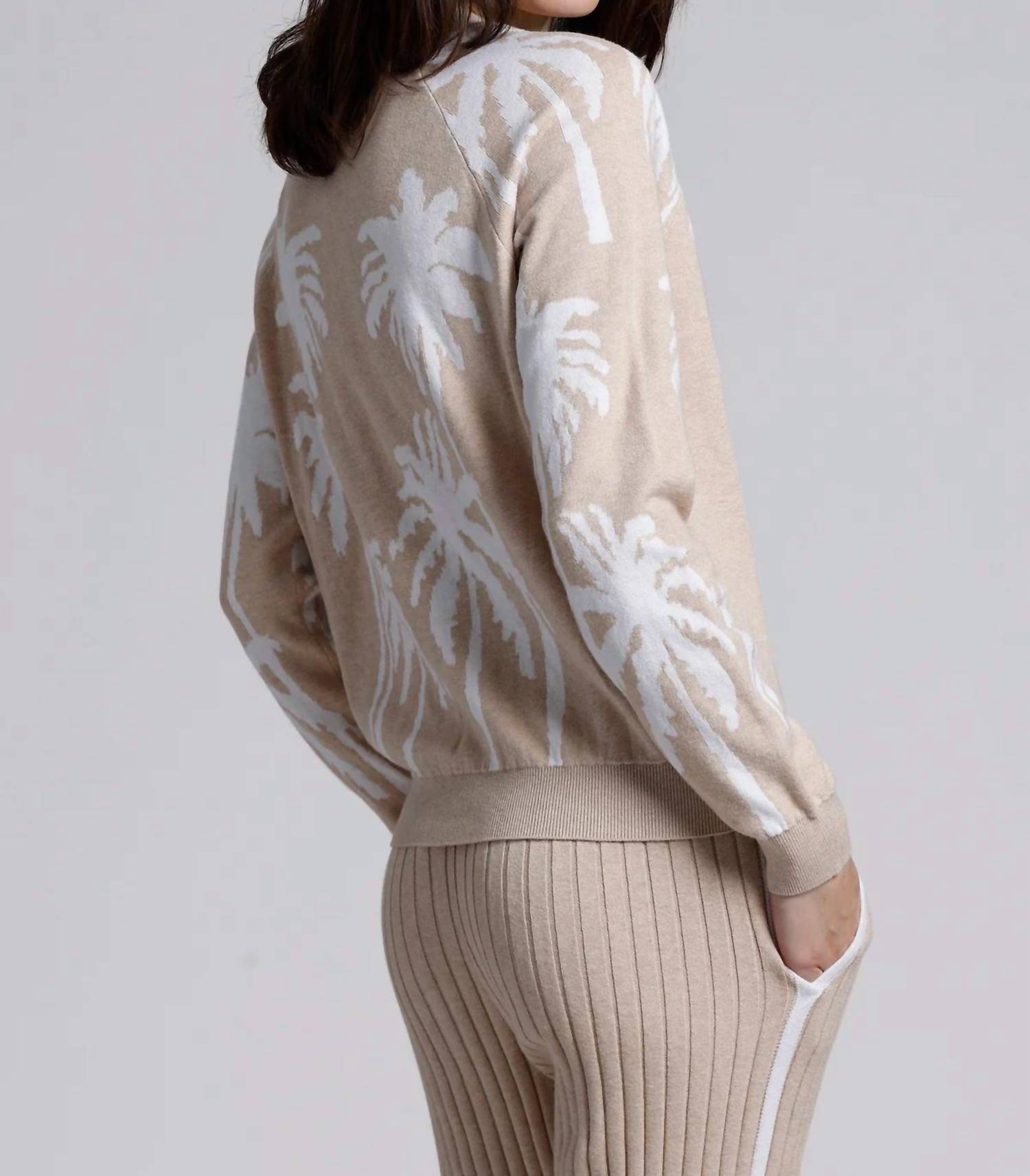 Embrace comfort and style with the Minnie Rose Cotton Cashmere Palm Tree Reversible Crew Sweater, featuring long sleeves and design versatility. Crafted from a soft 95% cotton and 5% cashmere blend, this beige patterned sweater is ideal for breezy days. Enjoy the unforgettable tropical flair with a reversible color switch and a convenient pull-on closure. Care for this stylish crewneck piece with dry clean or machine wash options.