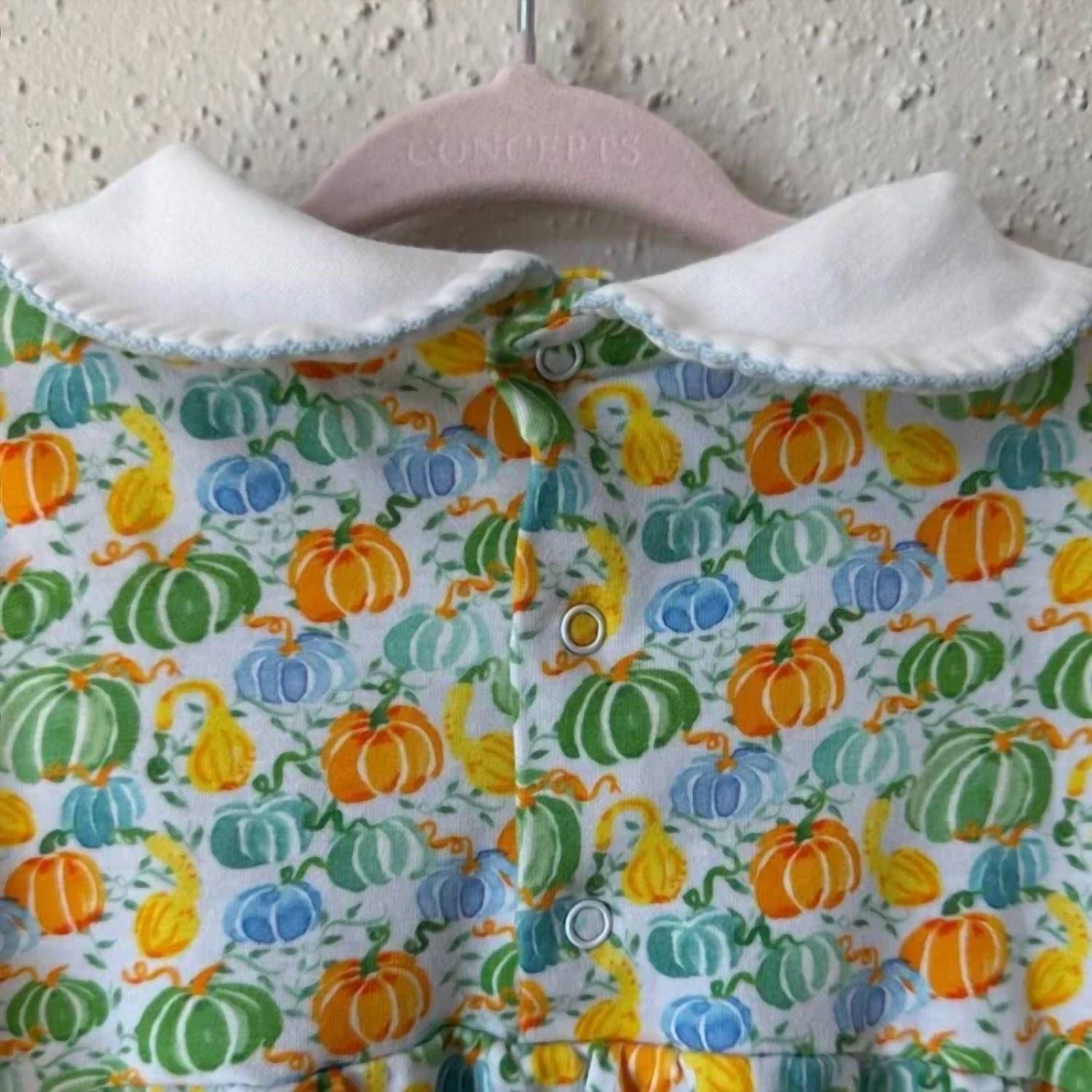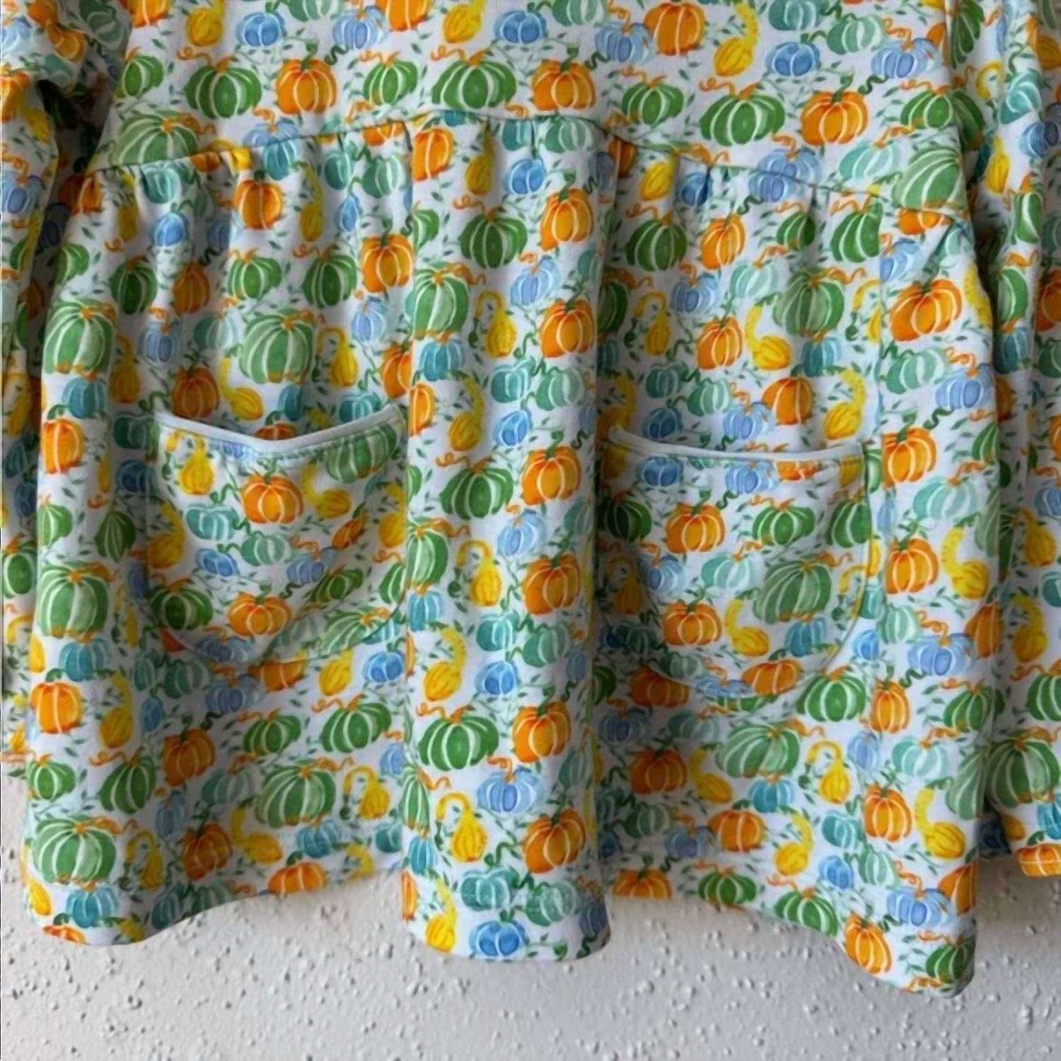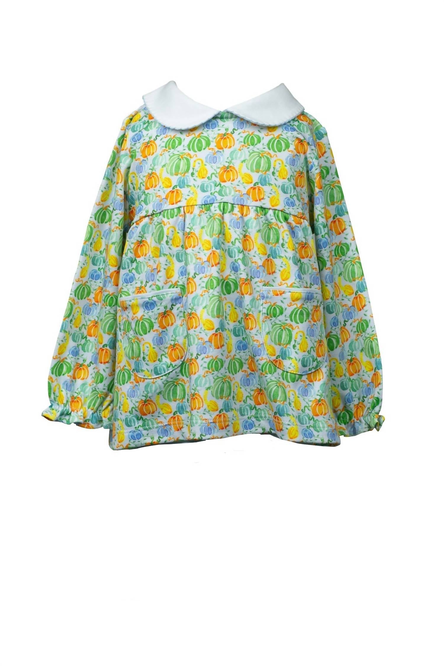 Embrace the festive spirit with THE PROPER PEONY Girl's Pumpkin Mix Long Sleeve Tunic Top, perfect for holiday parties and Halloween celebrations. This charming tunic showcases a delightful graphic pumpkin print in vibrant green and orange hues, ideal for a preppy and playful spring look. Crafted from 100% Pima Cotton, it promises comfort and style for your little one. Made in Peru, this tunic pairs perfectly with leggings for a complete seasonal ensemble.