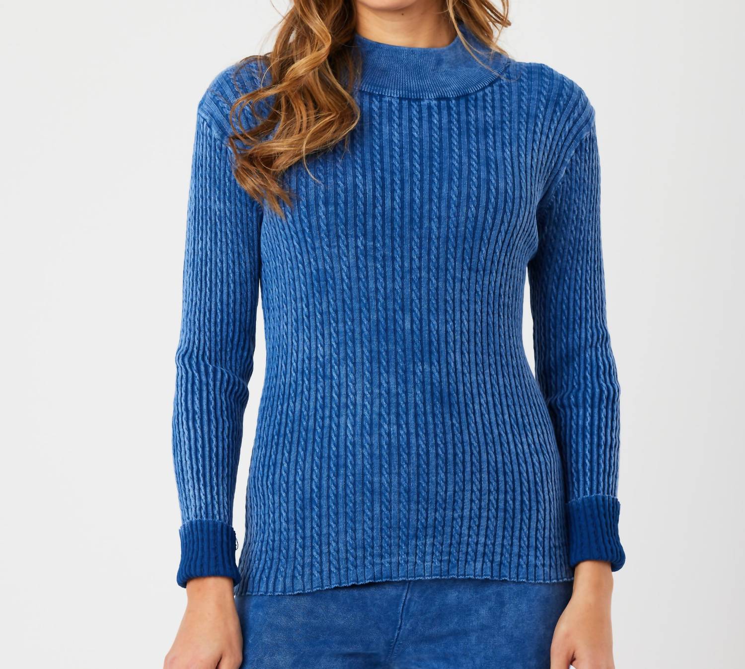 Mock neck top featuring cable detail and long sleeves. Hits at the hip. Made of 100% cotton. Delicate hand wash or dry clean. Imported.