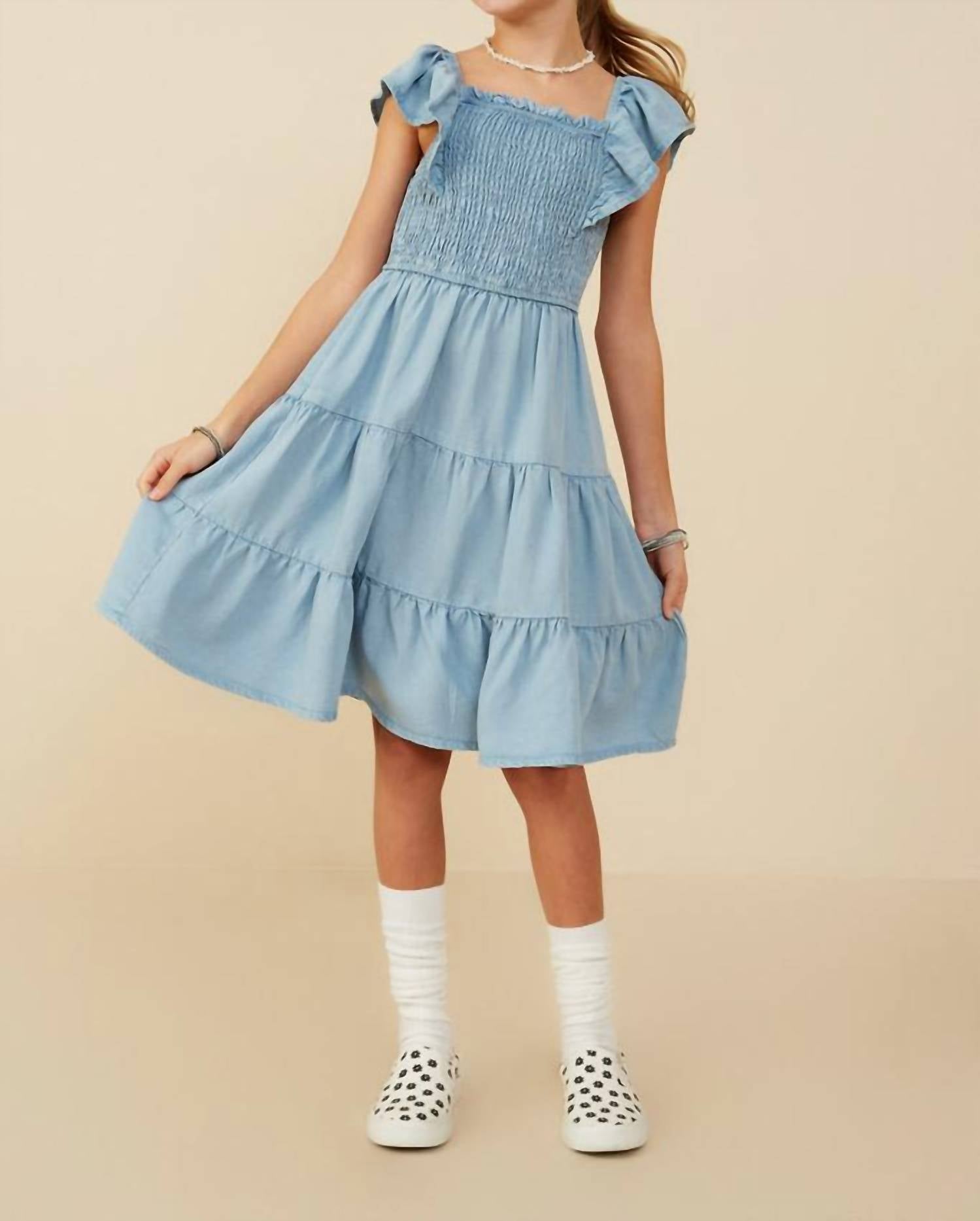 Introducing the Smocked Detail Ruffled Dress by Hayden LA, a delightful choice for any young girl's wardrobe. This A-line dress in light denim hue is crafted from 100% Tencel, offering a textured and stylish look with its playful ruffles. Made for the adventurous fashionista, it's perfect for spring birthdays and Father's Day celebrations. For best care, hand wash cold and line dry.
