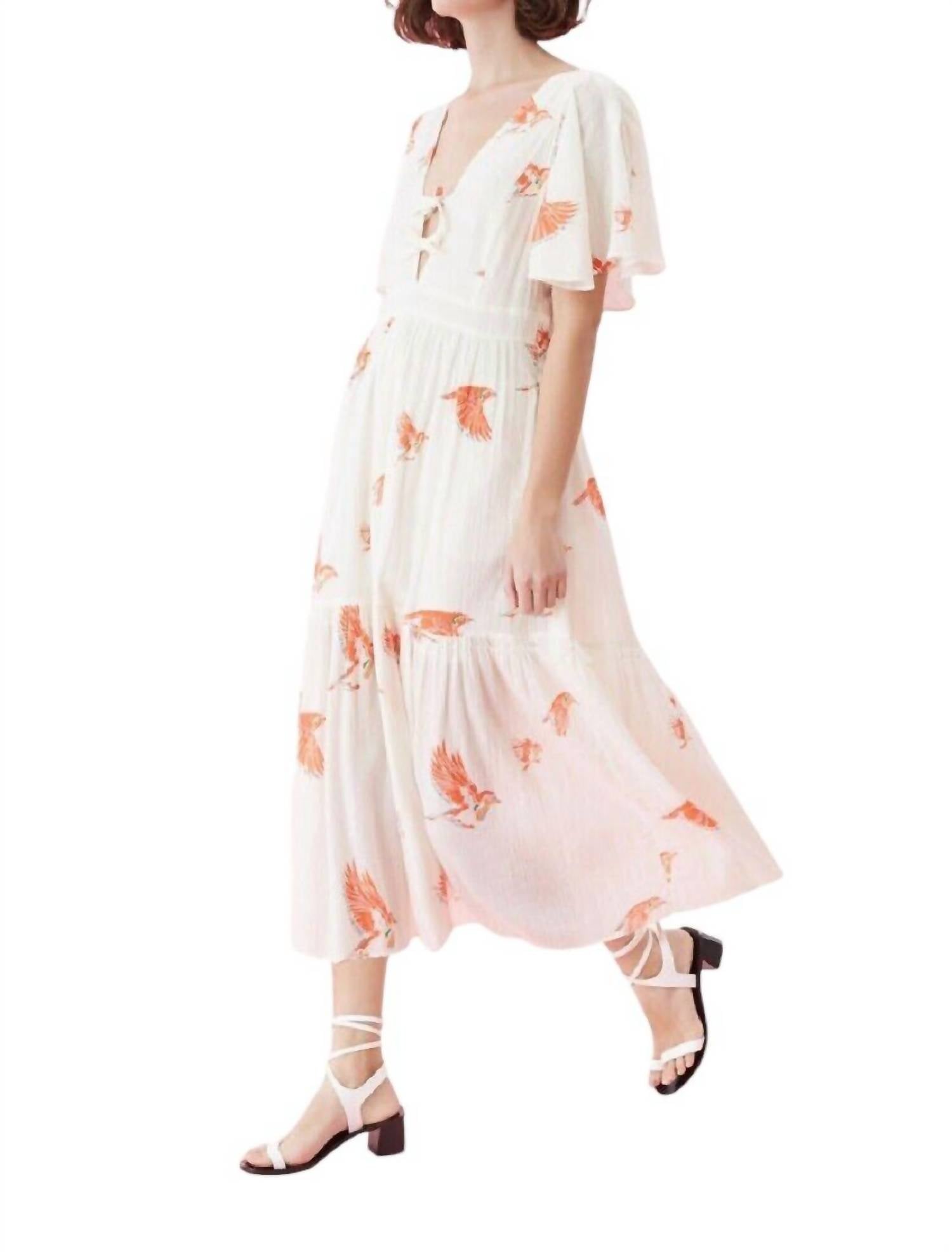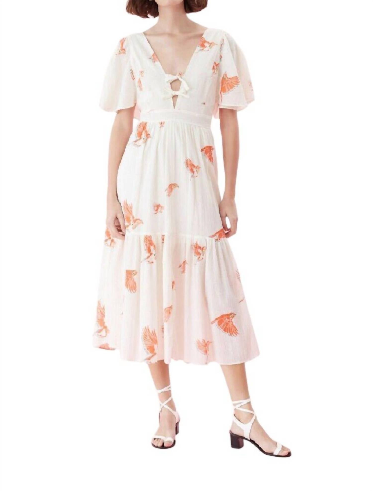 Experience the charm of REBECCA TAYLOR with the La Vie Birds Print Midi Crepe Cotton Dress, a bohemian masterpiece featuring colorful bird patterns on gauze fabric. This elegant midi dress, measuring 52" in length, showcases a flirtatious front keyhole with a tie closure, short flutter sleeves, and a ruffle hem. Crafted from 100% cotton, it offers an empire waist silhouette, and comes in a versatile white, with on-seam slit pockets for added convenience. Properly cared for with a hand wash in cold water, it assures a true-to-size fit, making it a perfect addition to your wardrobe.