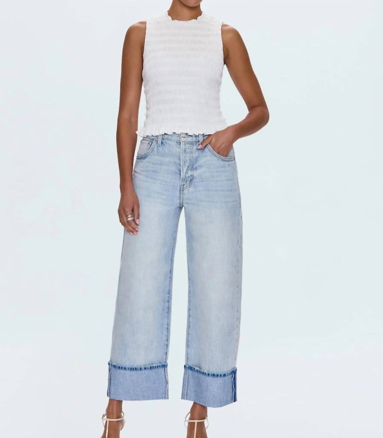 Tuck your favorite tee into these high-waist jeans for a more casual-cool feel. Discover the Ryder High Rise Cuffed Straight Jeans by PISTOLA, a stylish addition to any wardrobe in the refreshing Sunrise hue. These high-rise jeans boast a relaxed fit with a wide-leg design, featuring an oversized cuffed hem for a touch of vintage charm. Made from 100% cotton, they provide a lightweight feel, accented by medium wash and subtle fading. Imported and with a button closure, these jeans have a 12” rise, 19” leg opening, and 27” inseam. Care for them by washing cold.