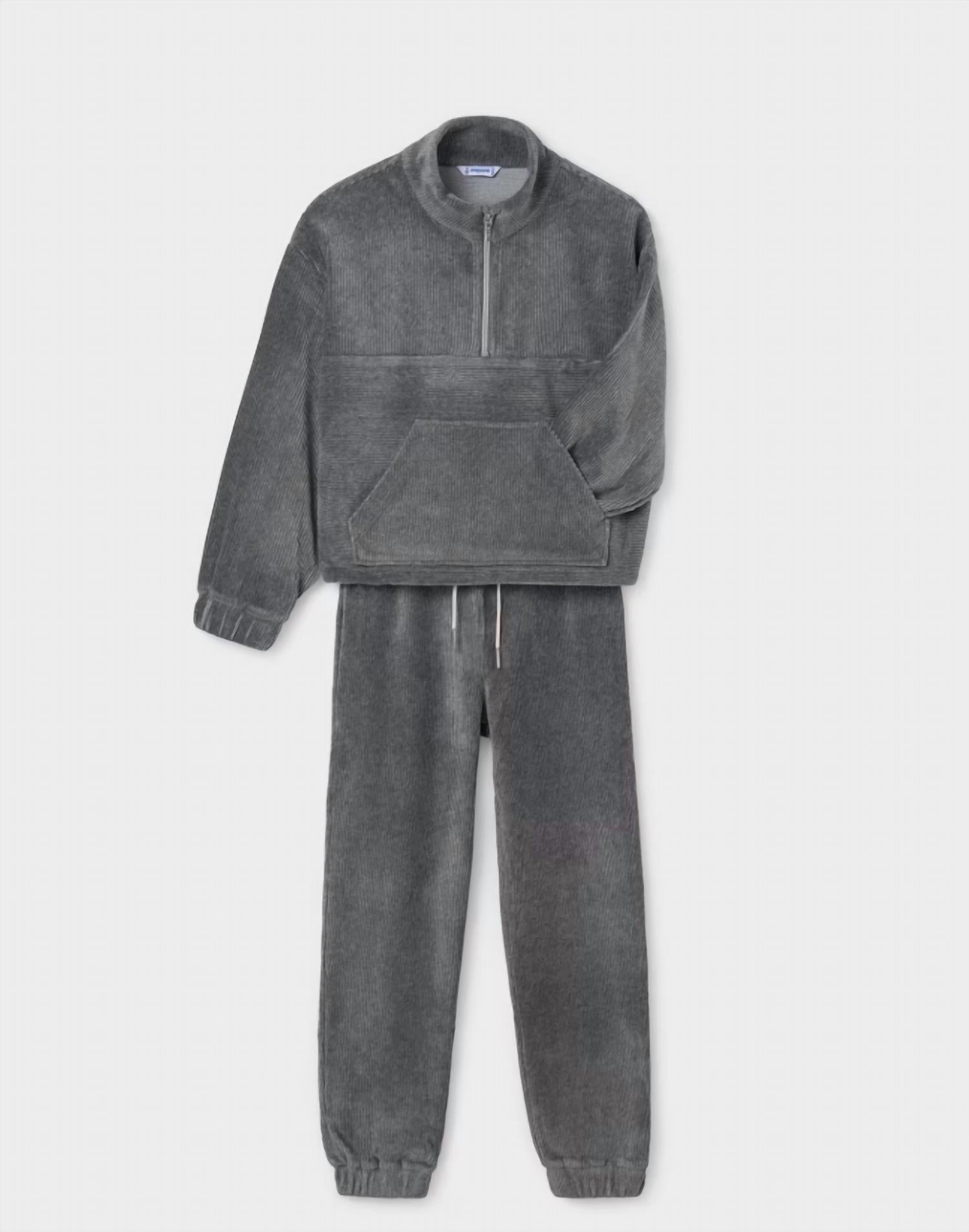 Introducing the Boy's Corduroy Partial Zip Top by Mayoral, a stylish choice in grey for casual layering. Crafted in corduroy, this top offers a partial zip closure for easy wear. This versatile piece pairs perfectly with the matching grey corduroy pant. Proudly designed by Mayoral for your ultimate style and comfort.