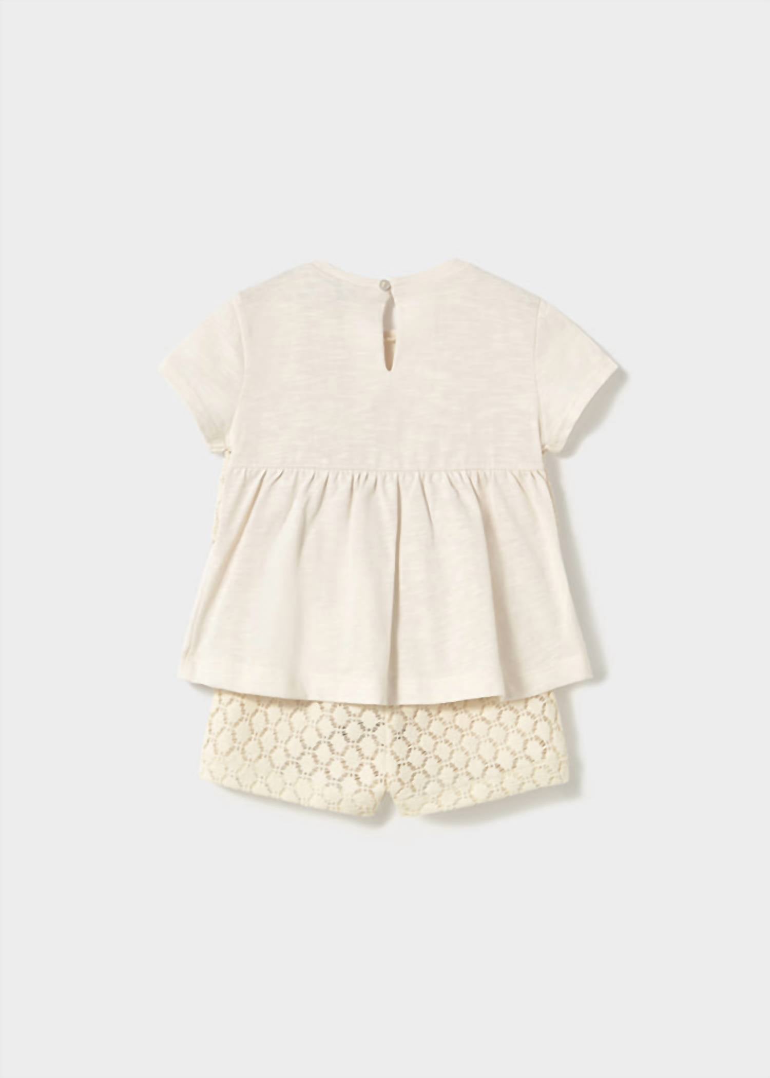 Elevate your child's wardrobe with the Girls' 2-in-1 Crochet Short Set by Mayoral, featuring a bone white short sleeve T-shirt adorned with an attached crochet vest front. Paired with matching crochet pull-on shorts complete with an elastic waistband, this set combines style and comfort effortlessly. The top boasts a composition of 98% cotton and 2% polyester, while the bottoms are crafted from 85% cotton and 15% polyester, ensuring a soft and breathable feel ideal for warm days. Perfect for casual outings or summer playdates.