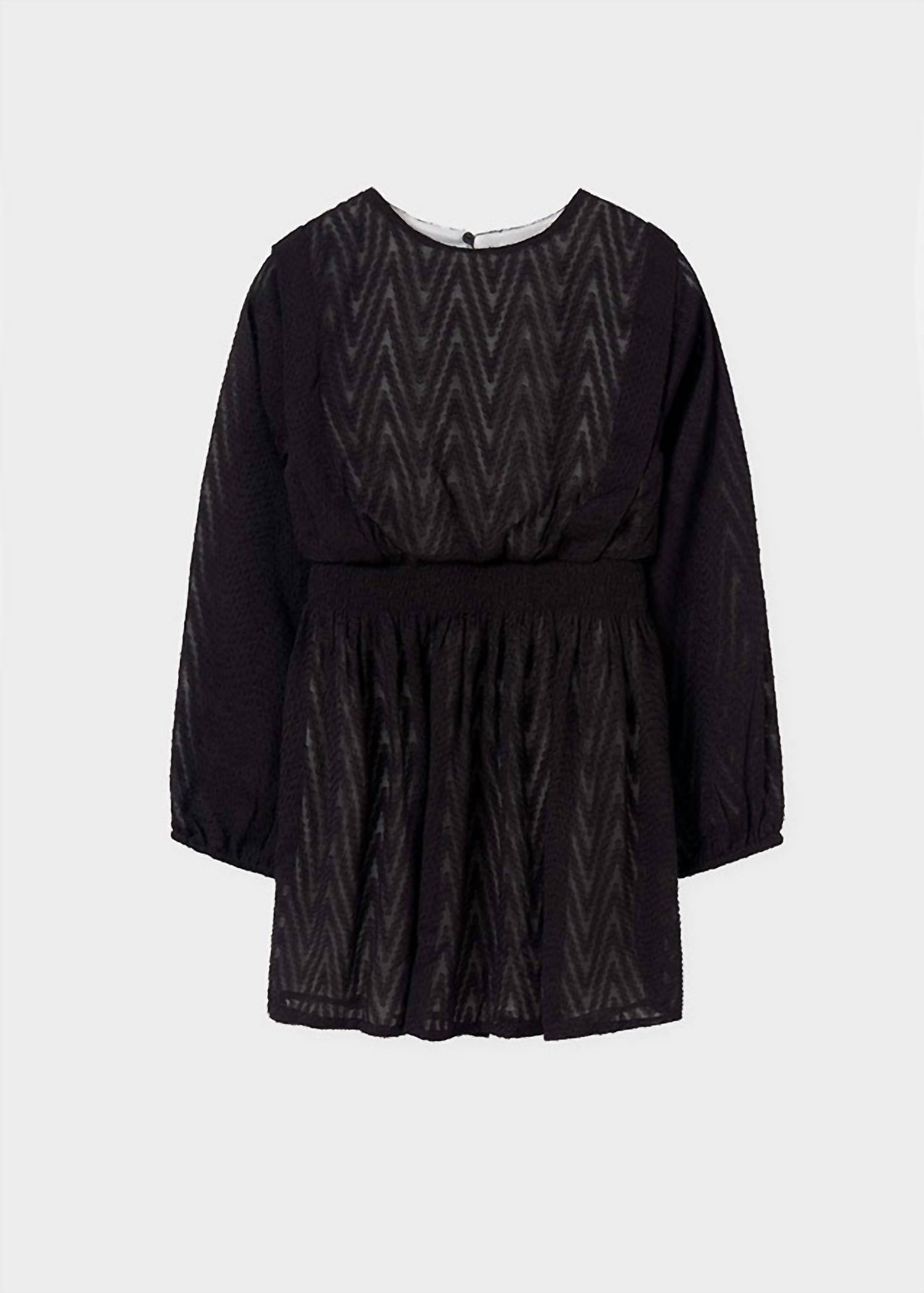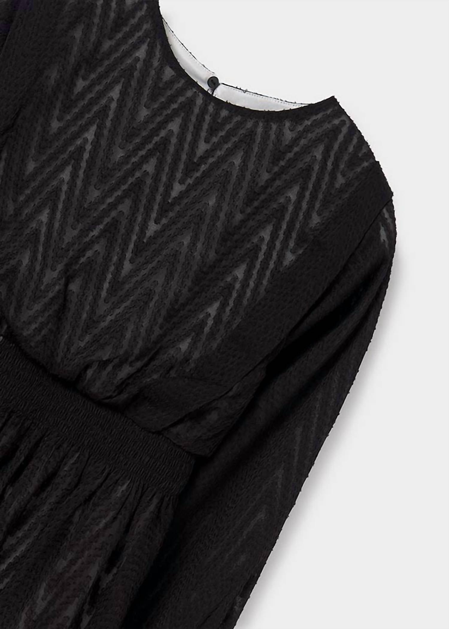 Introducing the Girls' Long Sleeve Printed Dress by Mayoral, a chic black chiffon piece perfect for any occasion. This dress features an elastic waistline and wrists for a comfortable fit, with an all-over zig zag flocking design. Crafted entirely from polyester, both inside and out, it comes with a button closure at the back of the neckline and is fully lined for added comfort. Care for this holiday party staple with machine washing and line drying.