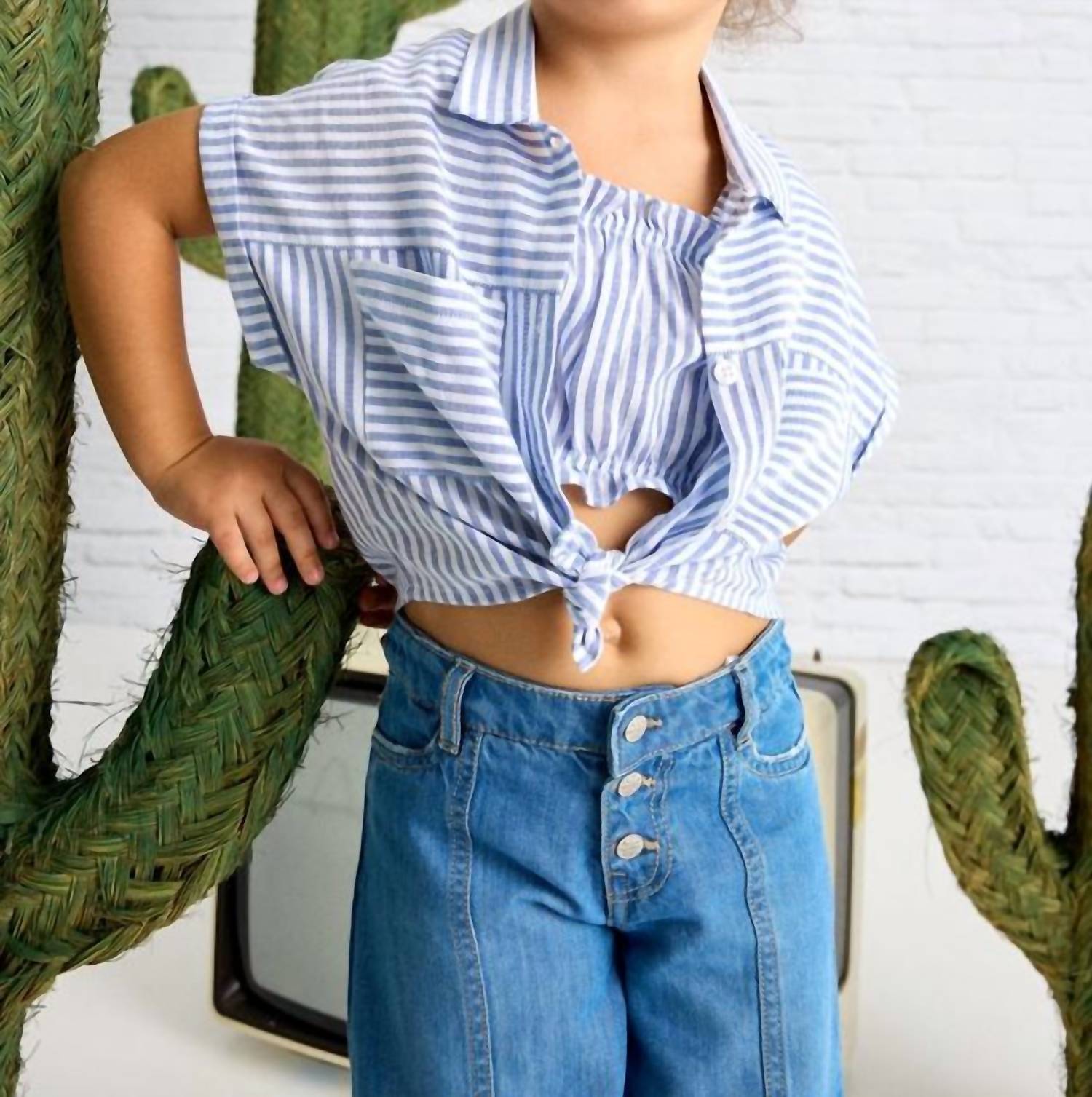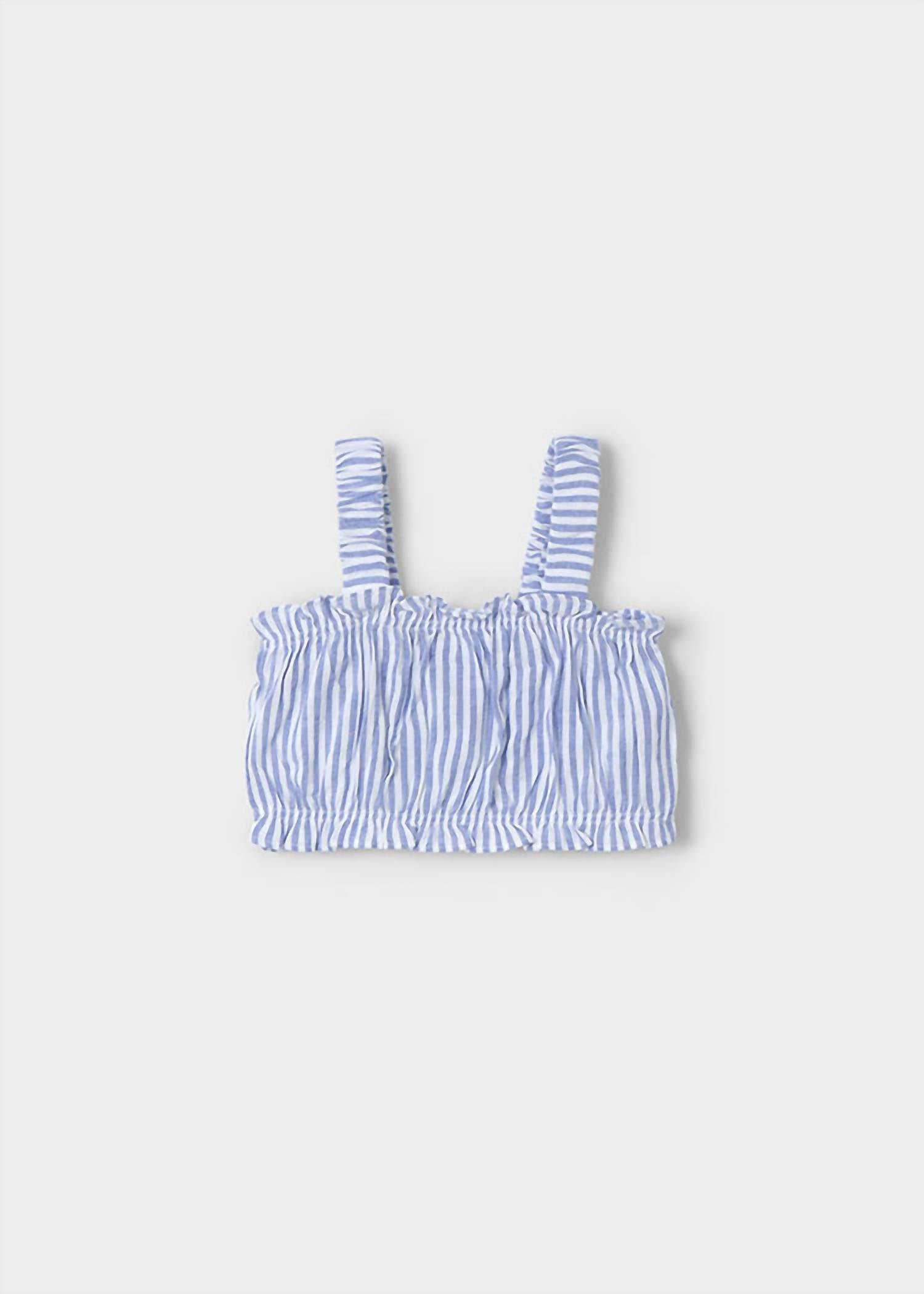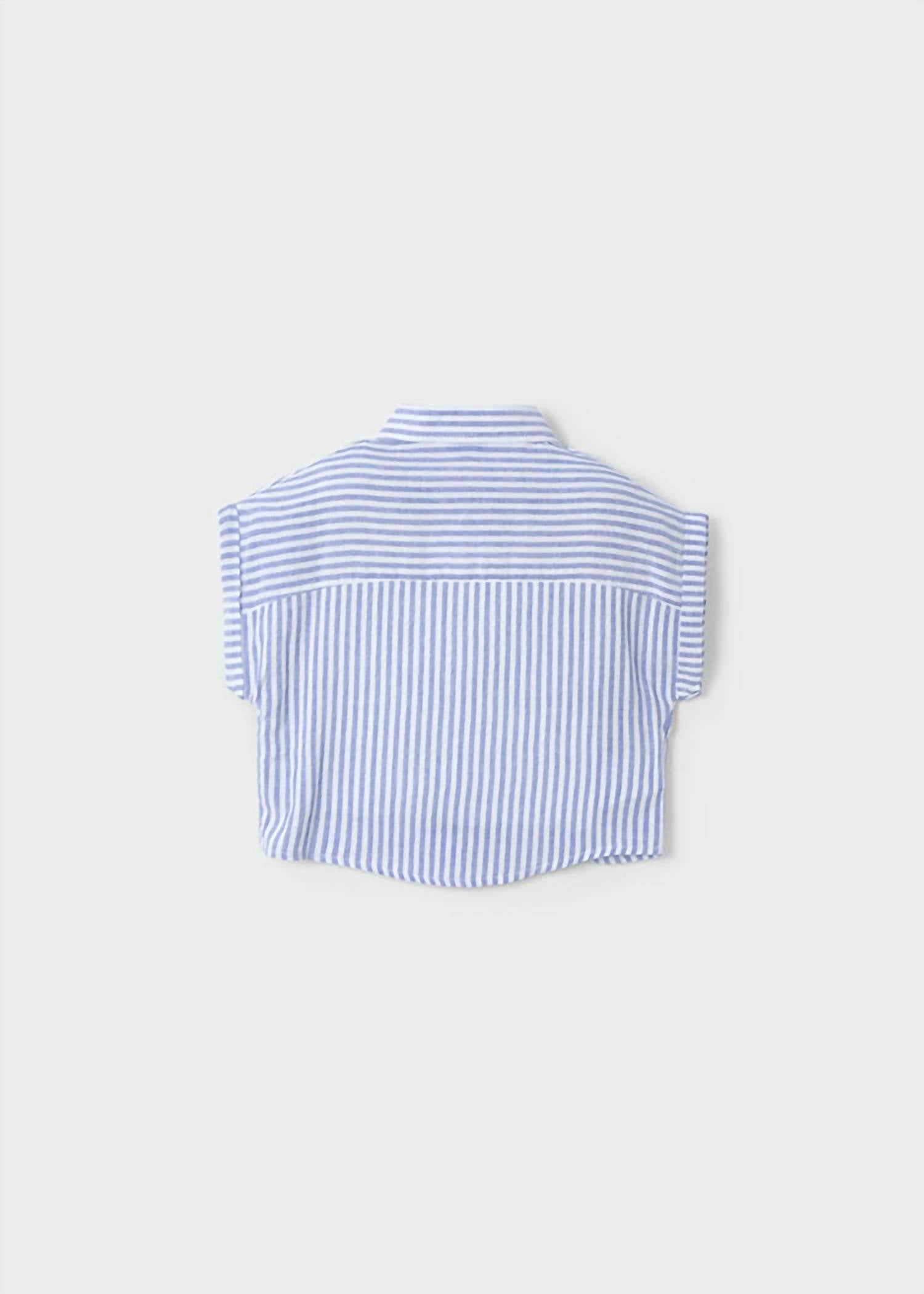 Discover the Stripes Bandeau Shirt Set by Mayoral, an ideal ensemble for beach vacations and summer getaways. This indigo set includes a bandeau smocked crop top with wide strap accents and a short sleeve overshirt featuring a collared neckline and front button-down closure. Crafted from a cotton blend with a composition of 60% Cotton and 40% Viscose. Care instructions include machine wash cold, do not bleach, hang dry, and cool iron.