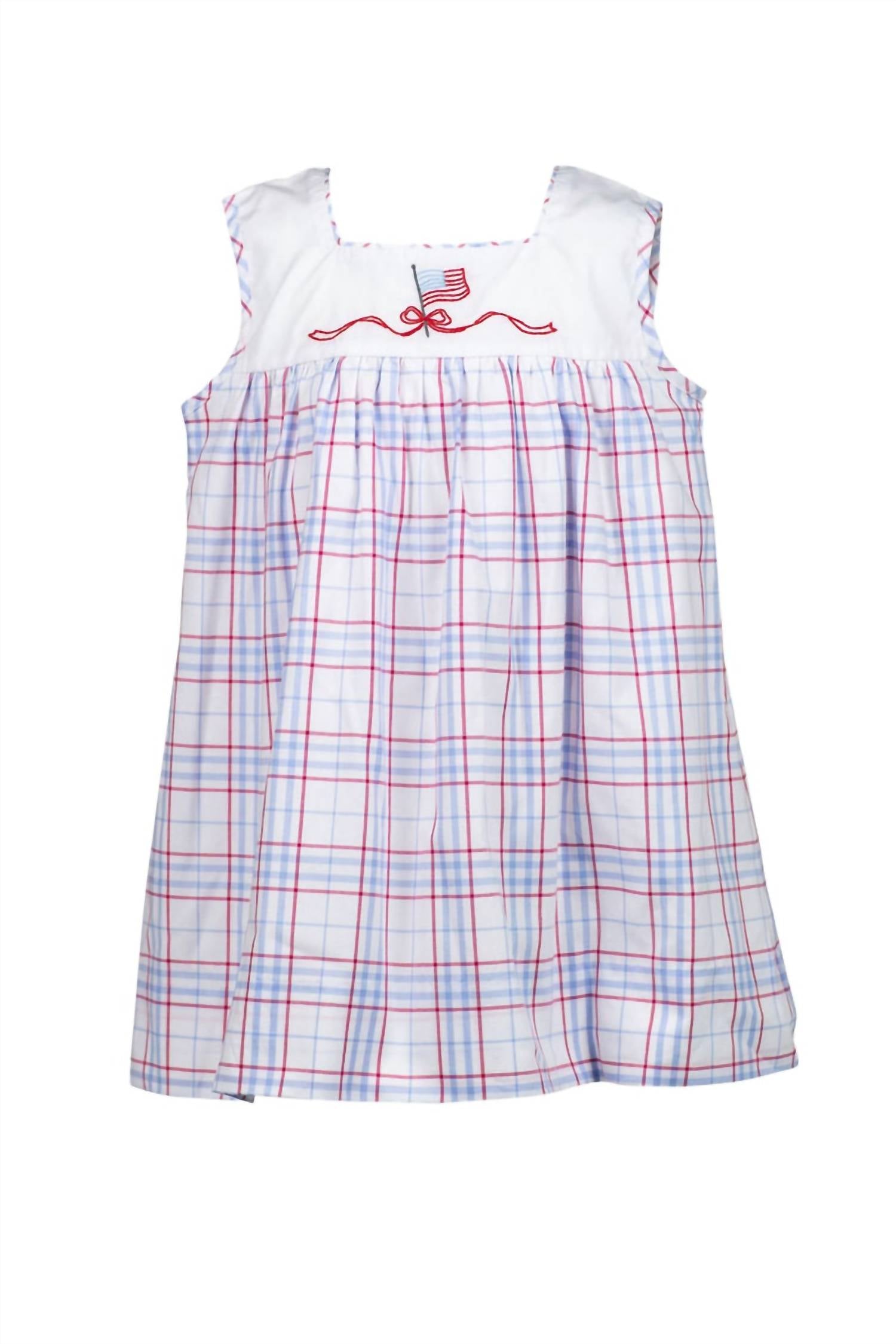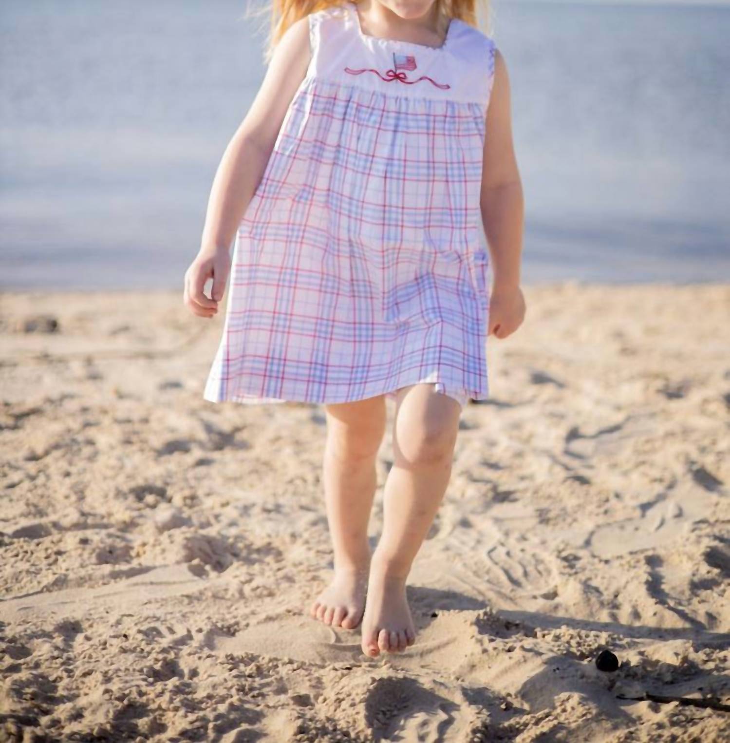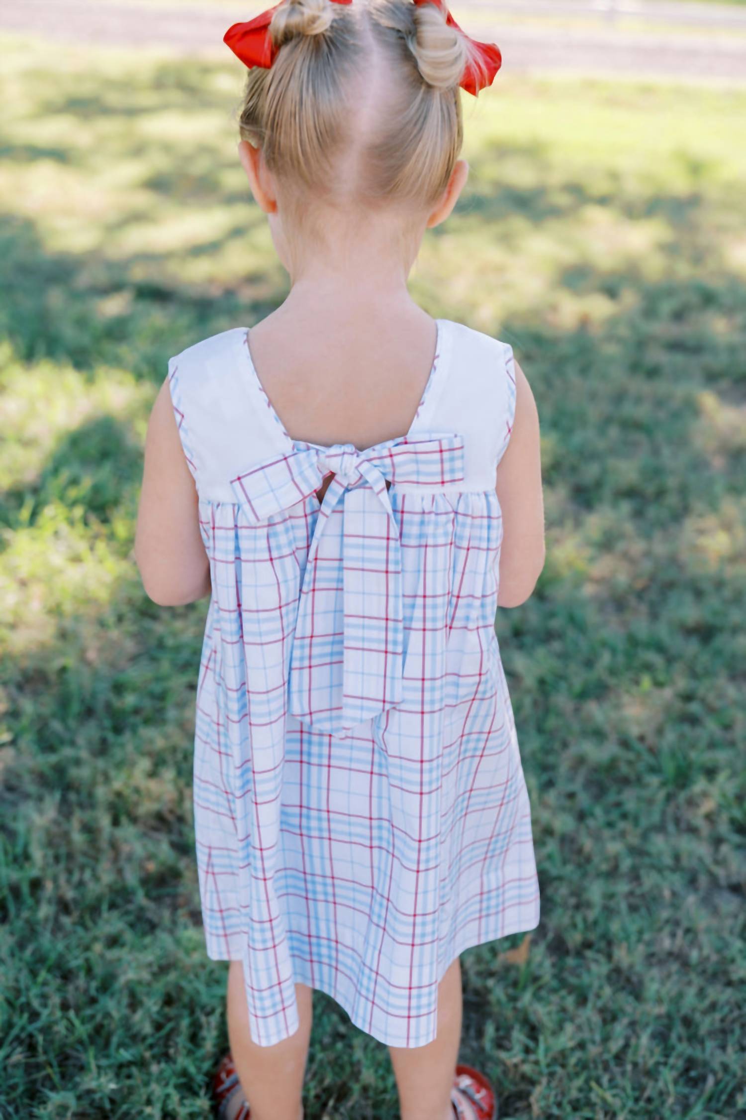 Celebrate in style with the Americana Dress by THE PROPER PEONY, a quintessential piece for any patriotic occasion. Crafted from a cotton blend, this dress showcases an endearing plaid & check pattern in classic red, white, and blue hues, perfect for vacation or everyday summer wear. Easy to care for, simply hand wash for continued enjoyment. Model is wearing size 3T, and it runs true to size for a reliable fit.