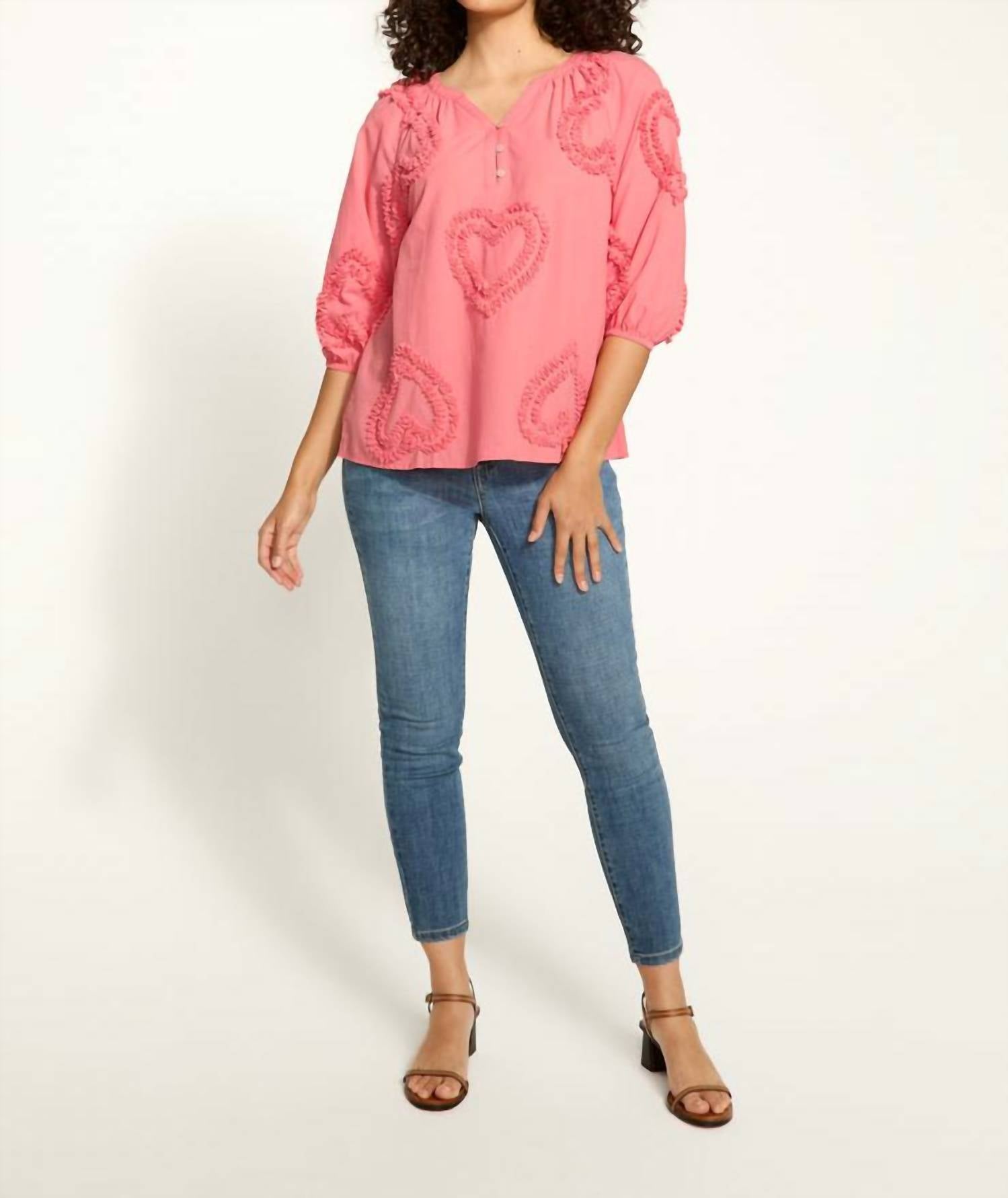 A versatile blouse that works from desk to dinner! Introducing the Heart-Embellished Cotton Blouse by FDJ, a feminine piece in a charming coral hue. Featuring three-quarter sleeves and a split V-neckline, this blouse is crafted from 100% cotton to ensure breathability and comfort. This patterned blouse requires a button closure for effortless wear. For longevity, hand wash separately.
