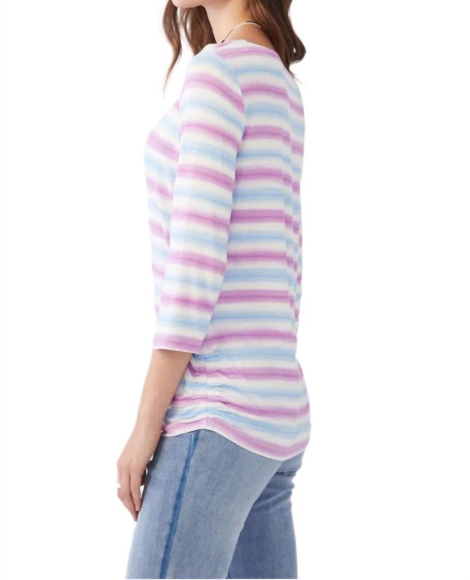 Pair this with your favorite jeans and slides for your next girls night out. Elevate your spring wardrobe with the Striped Three Quarter Sleeve Top by FDJ, featuring a vibrant Wild Pansy print. This blouses' ruched sides bring an element of chic styling to its crewneck design. The easy pull-on closure ensures a comfortable fit, perfect for travel occasions. Crafted for women in a multi-color pattern, this top adds a playful flair to any ensemble.