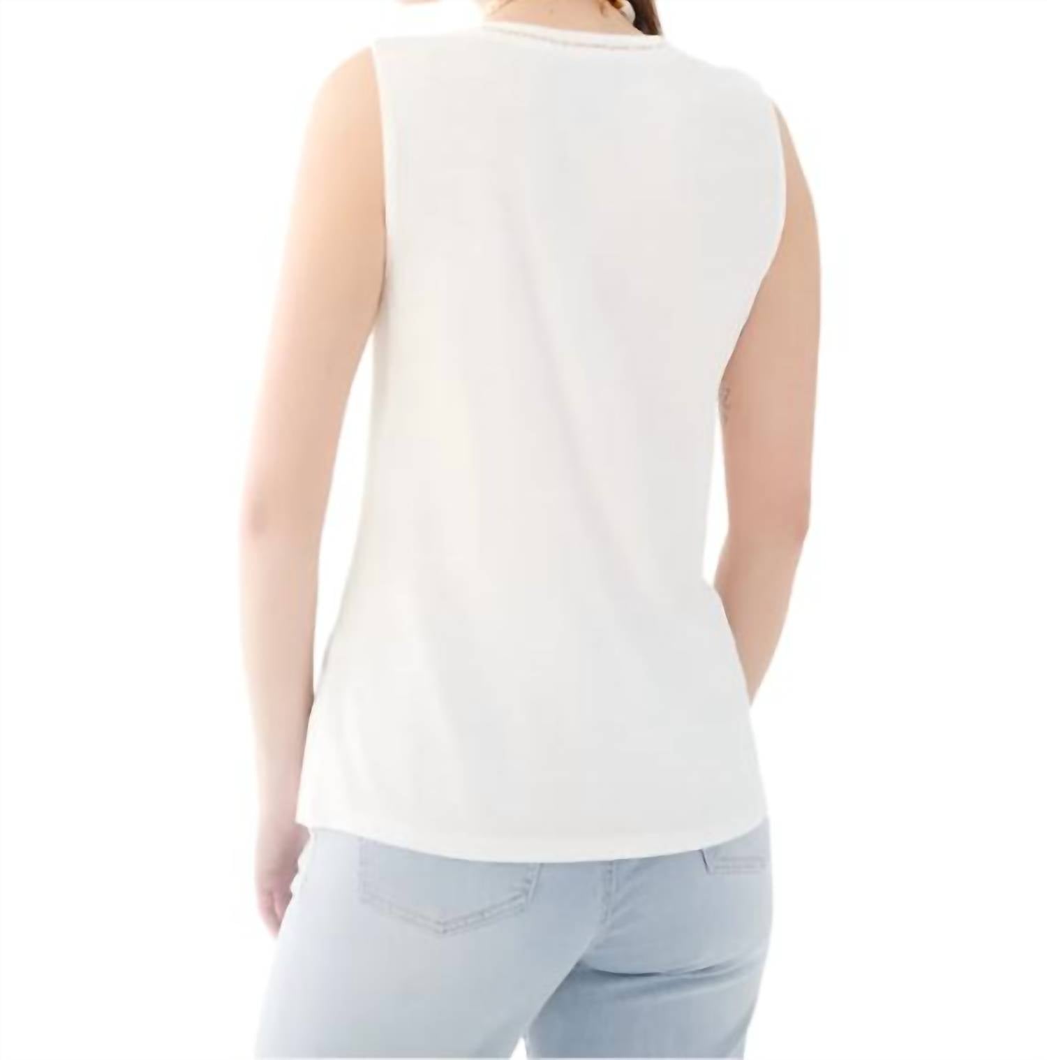 The perfect tank top for those warmer weather seasons. Introducing the Sleeveless V-neck Jersey Top by FDJ, designed to elevate your casual look while offering a relaxed and versatile style suitable for everyday wear. Featuring a ladder lace trim and crafted from a cotton blend composed of 60% Cotton and 40% Modal, this top measures 26 inches in length. Closure type: Pull on. Ideal for minimalist summer vacations, this piece is presented in a solid white, perfect for achieving that effortlessly chic vibe.