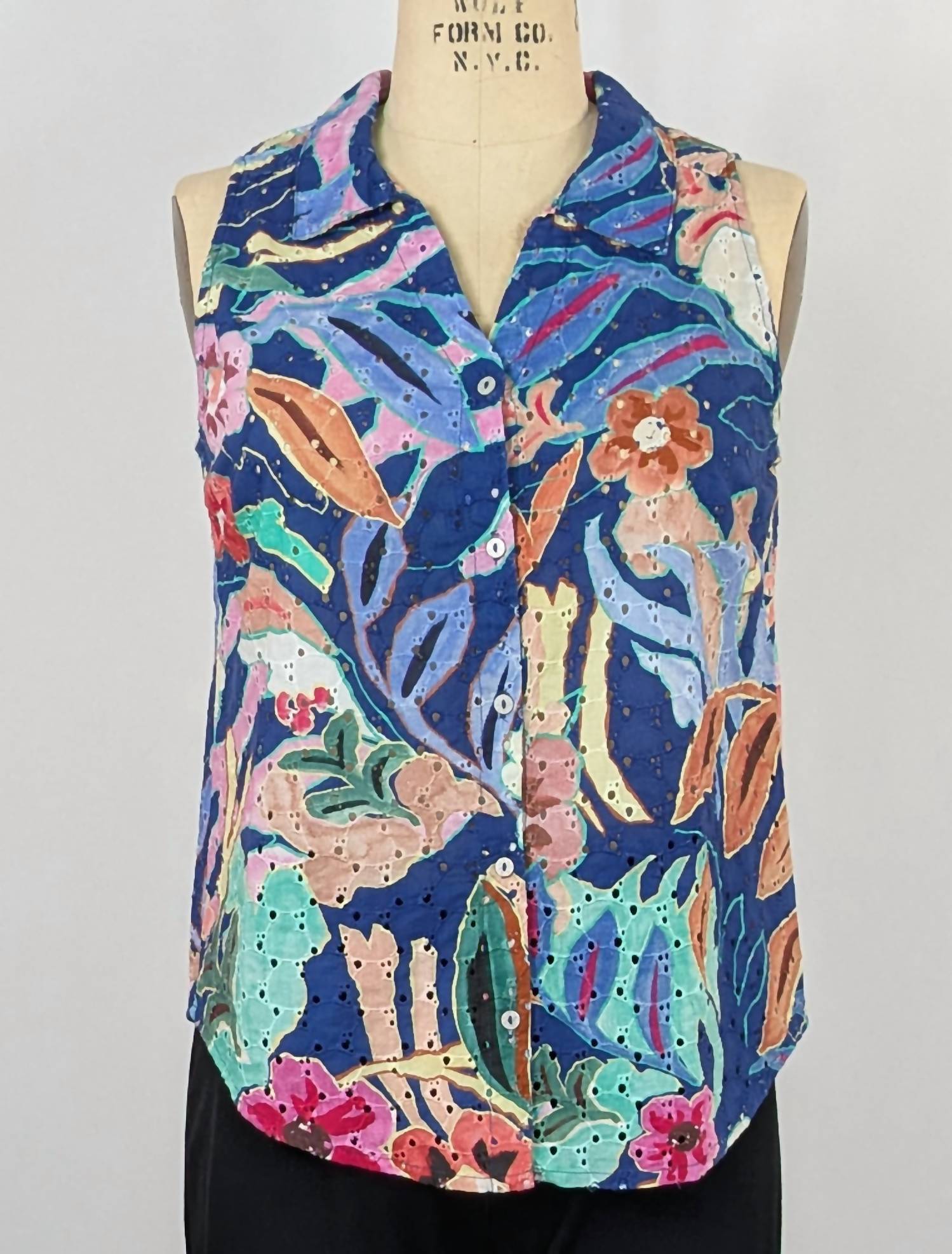 This classic tank top is perfect for layering and cute enough to wear on its own. Unleash your creativity with this versatile floral sleeveless shirt. Whether tucked in, tied in front, or worn open over a tank, its endless styling options make it a wardrobe must-have. Picture shows size Small on size 8 Wolf dress form. Center back measurement taken from size Medium = 24.5 in. Content: 100% Cotton. Care: Machine Wash on Delicate Cycle, Separately, Inside Out, in Cold Water, Do NOT Bleach, Hang to Dry, Iron Inside Out at Low Temp