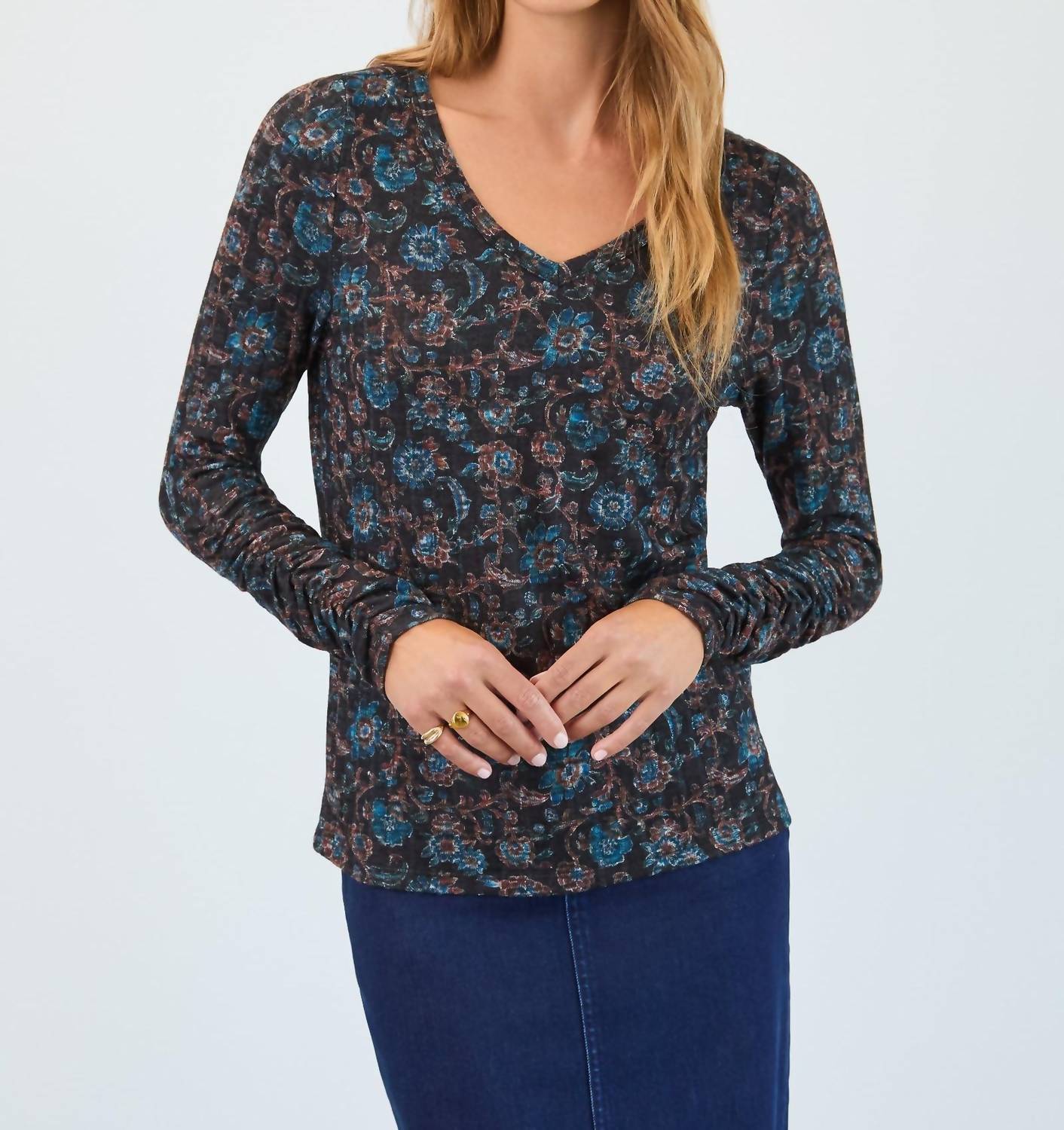 Pair this with your favorite jeans and slides for your next girls night out. Introducing the Crest Floral Long Sleeve Top by FDJ, a stunning addition to your wardrobe that showcases a striking print by a local artist. This women's blouse in Black Crest features a flattering V-neckline and three-quarter sleeves, perfect for any holiday party or workwear ensemble. Made from a breathable blend of 97% polyester and 3% elastane, it offers comfort and ease with a pull-on closure. Care is simple—hand wash and line dry for lasting wear.
